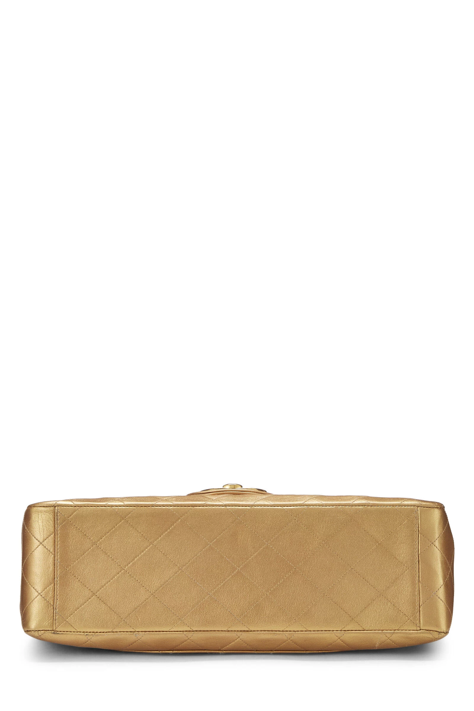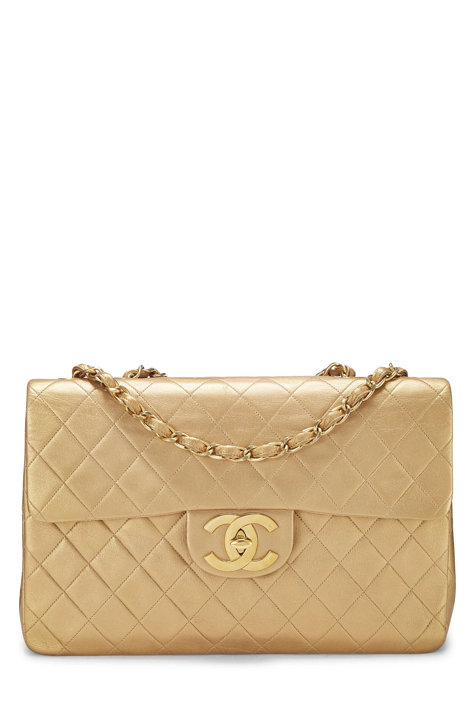 A signature Chanel staple, the jumbo Half Flap shoulder bag is crafted in metallic gold lambskin leather and finished with gold-plated ‘CC’ turnlock and chain hardware.