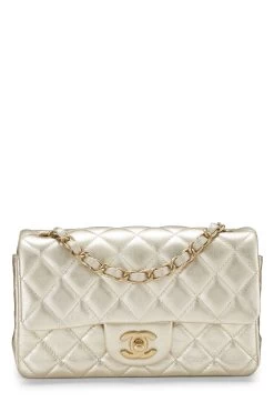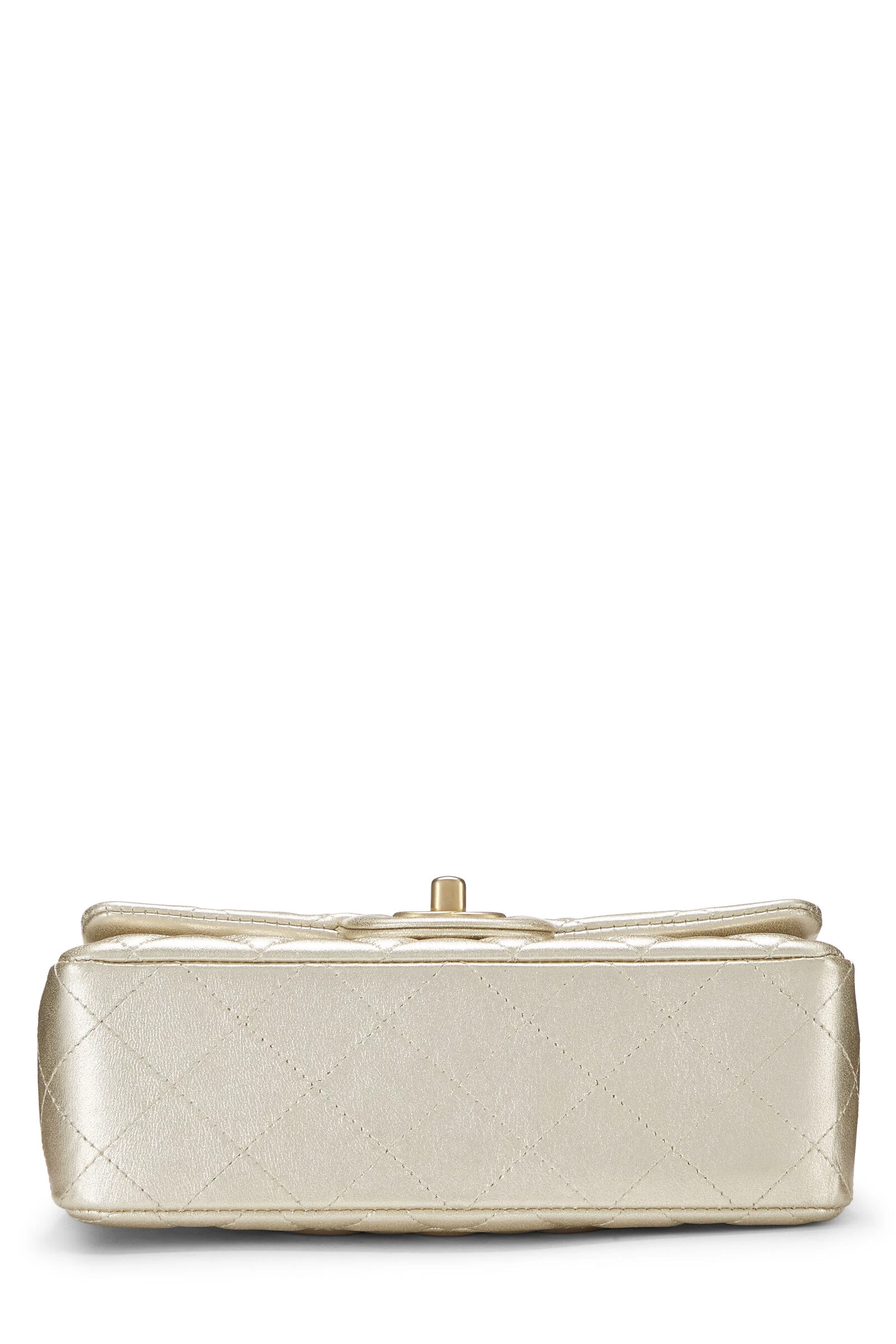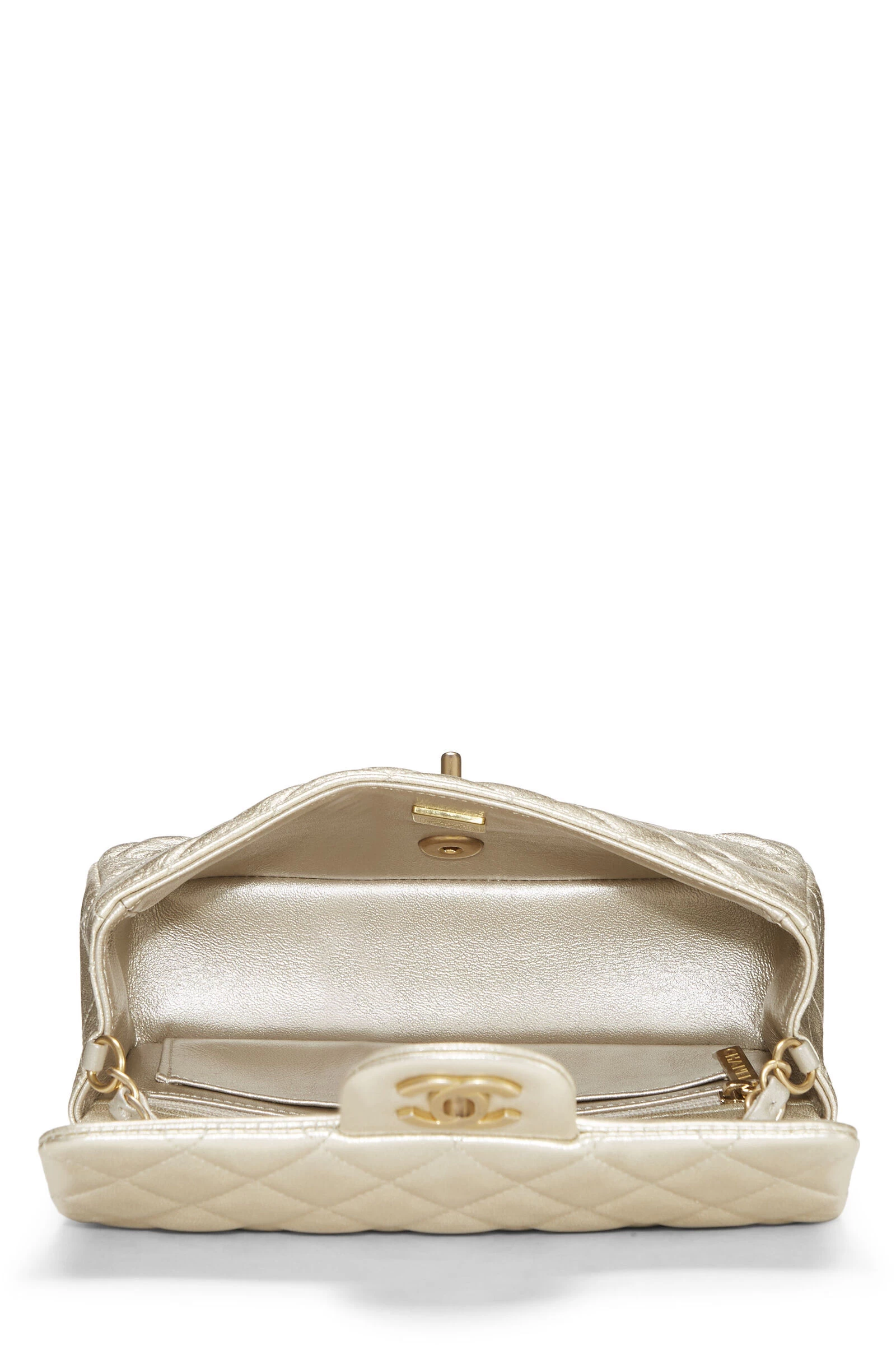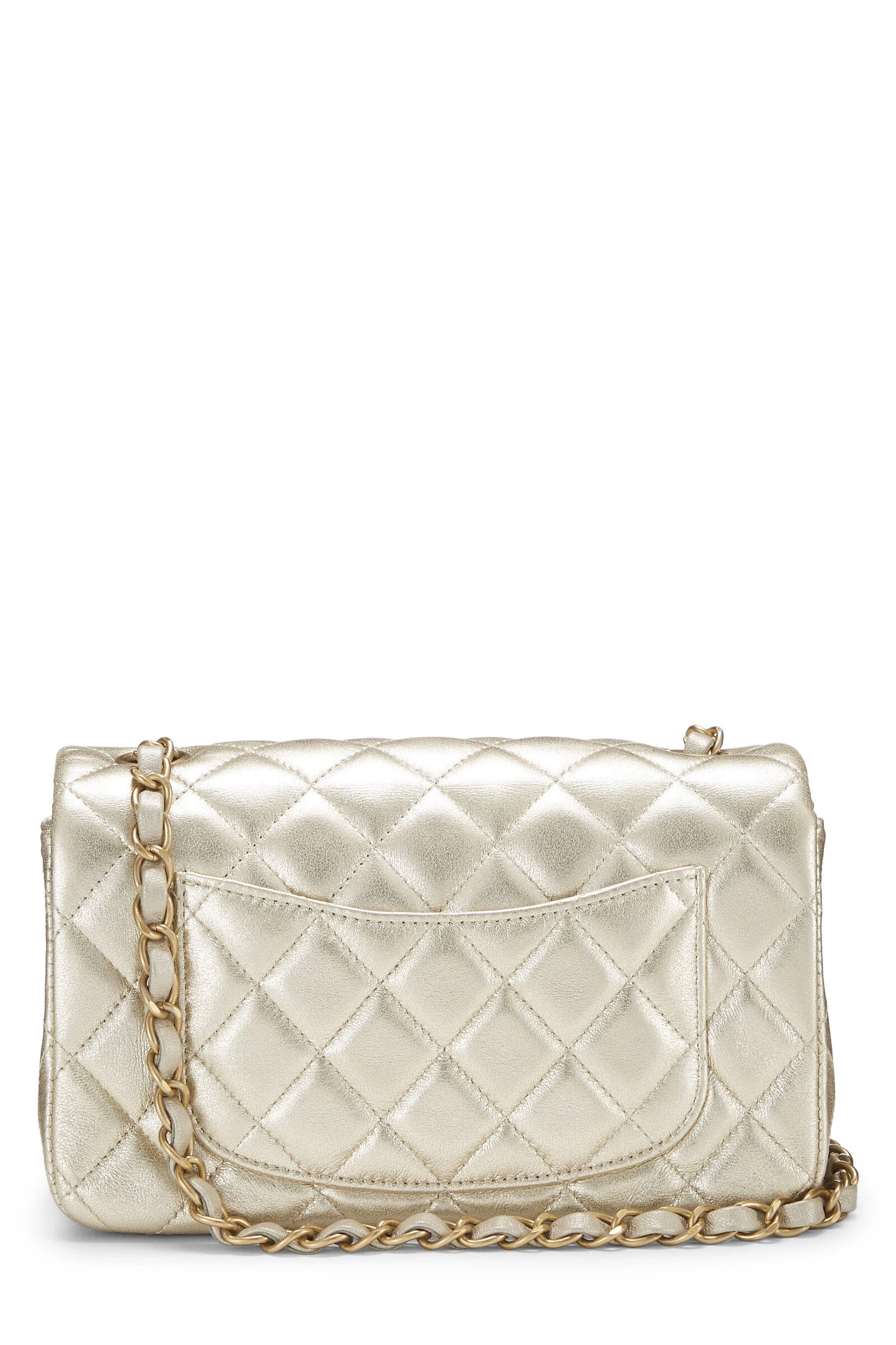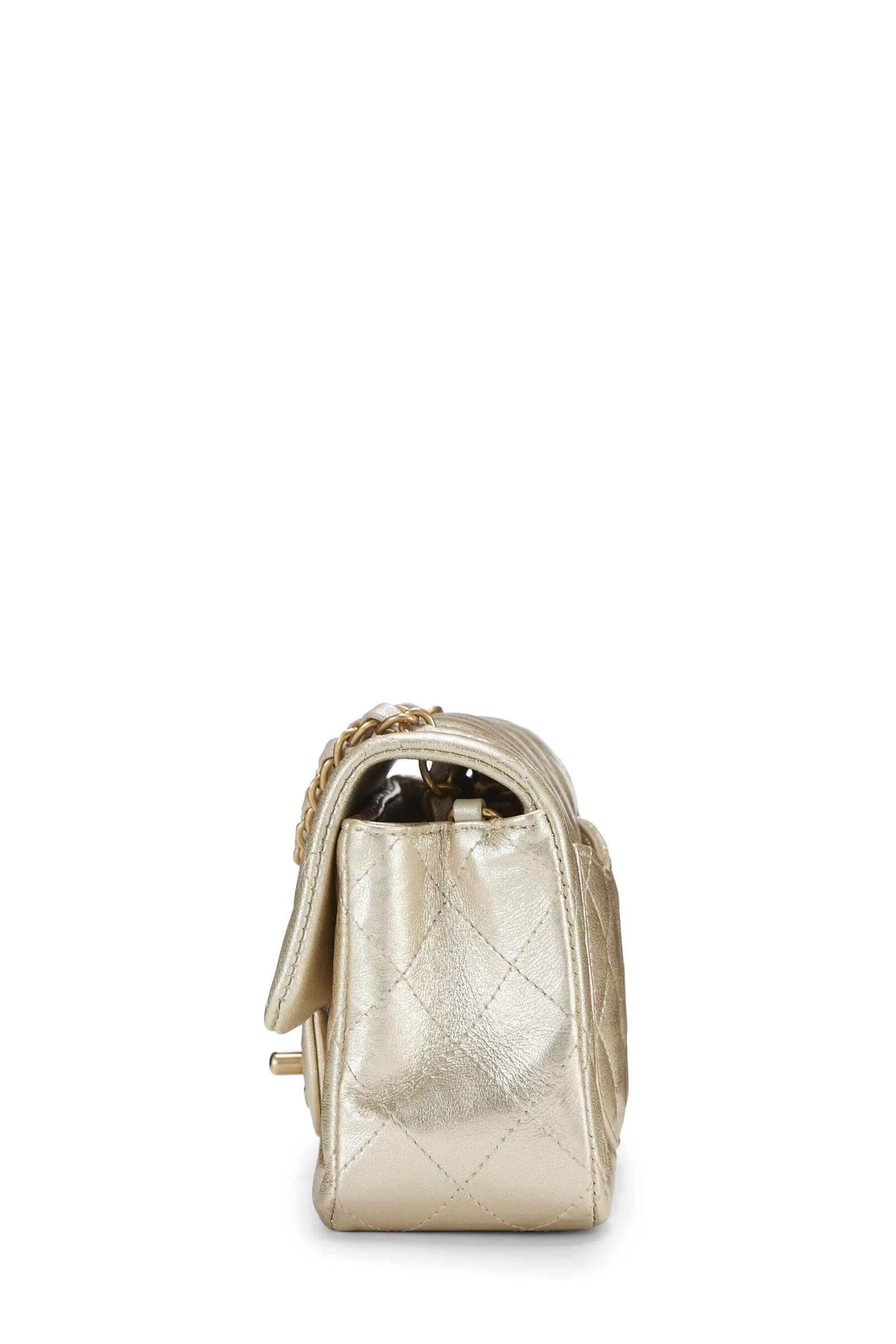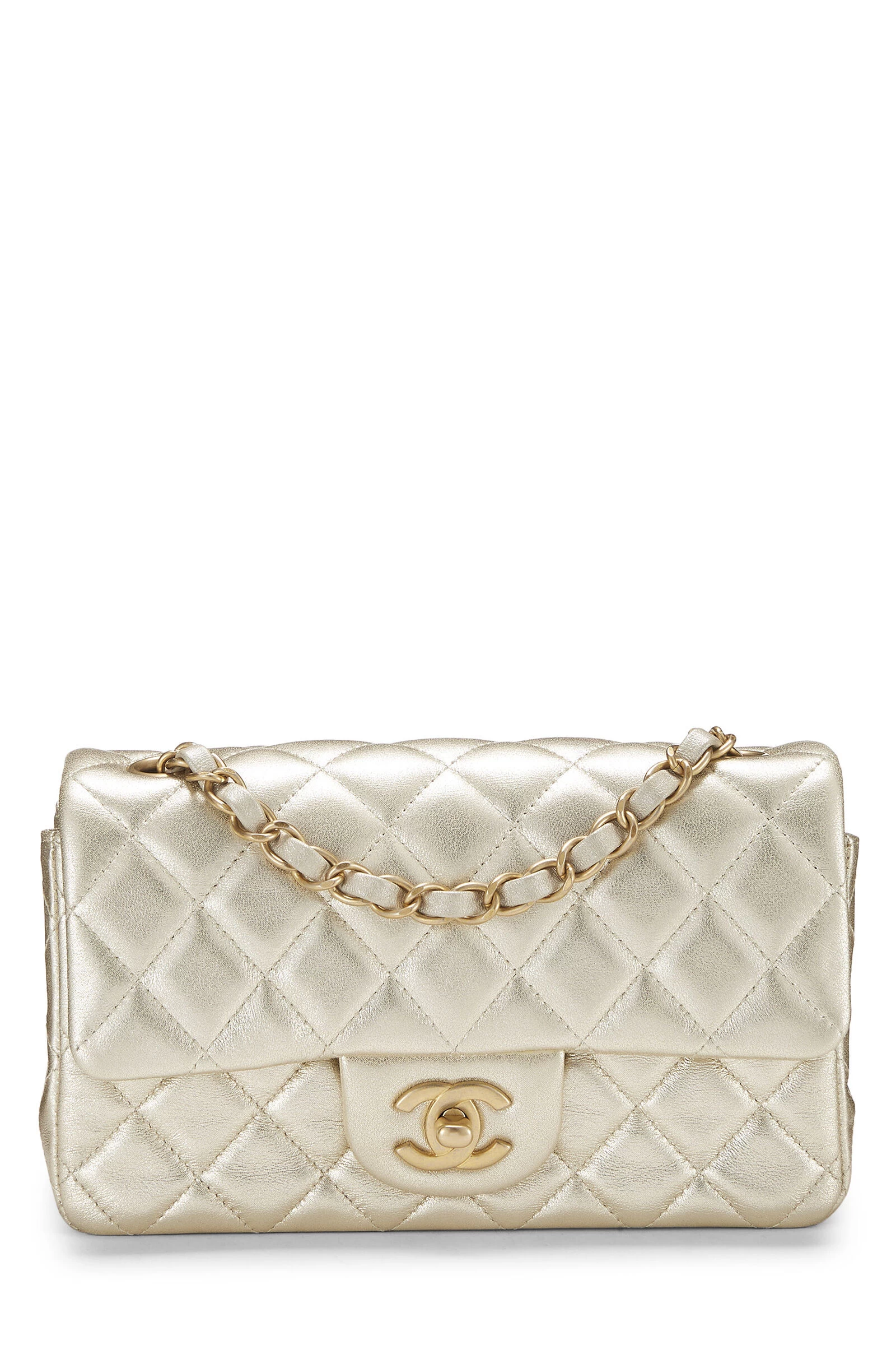 Chanel’s iconic Rectangular Flap bag featured in the mini size, rendered in gold diamond-quilted lambskin leather and finished with pale gold-tone ‘CC’ turnlock and chain hardware.