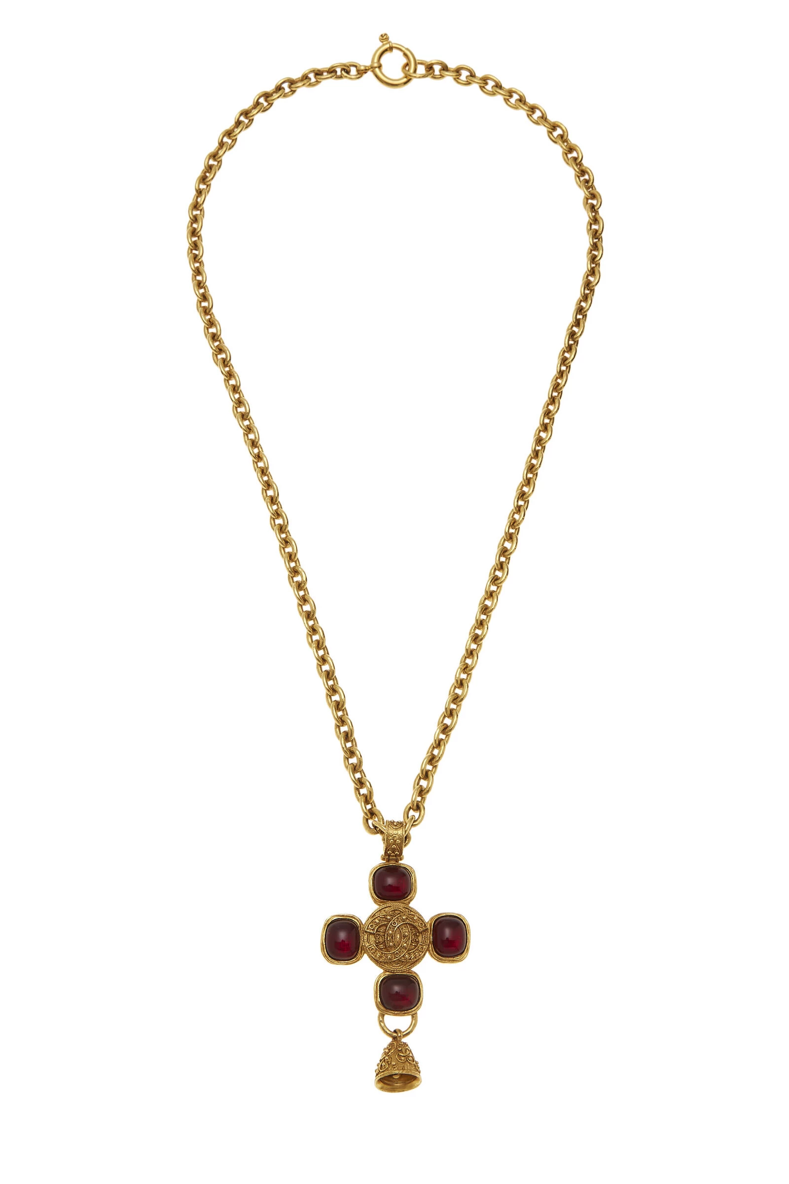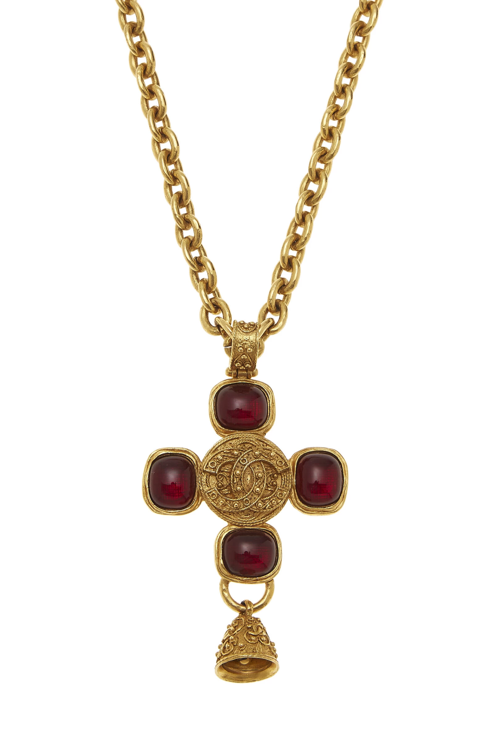 From Fall 1994, this Chanel gold-plated necklace featuring a rope chain engraved hardware, cross-shaped pendant and multiple red Gripoix charms with interlocking ‘CC’ logo at the center. Pendant measurements 4″X2.5″