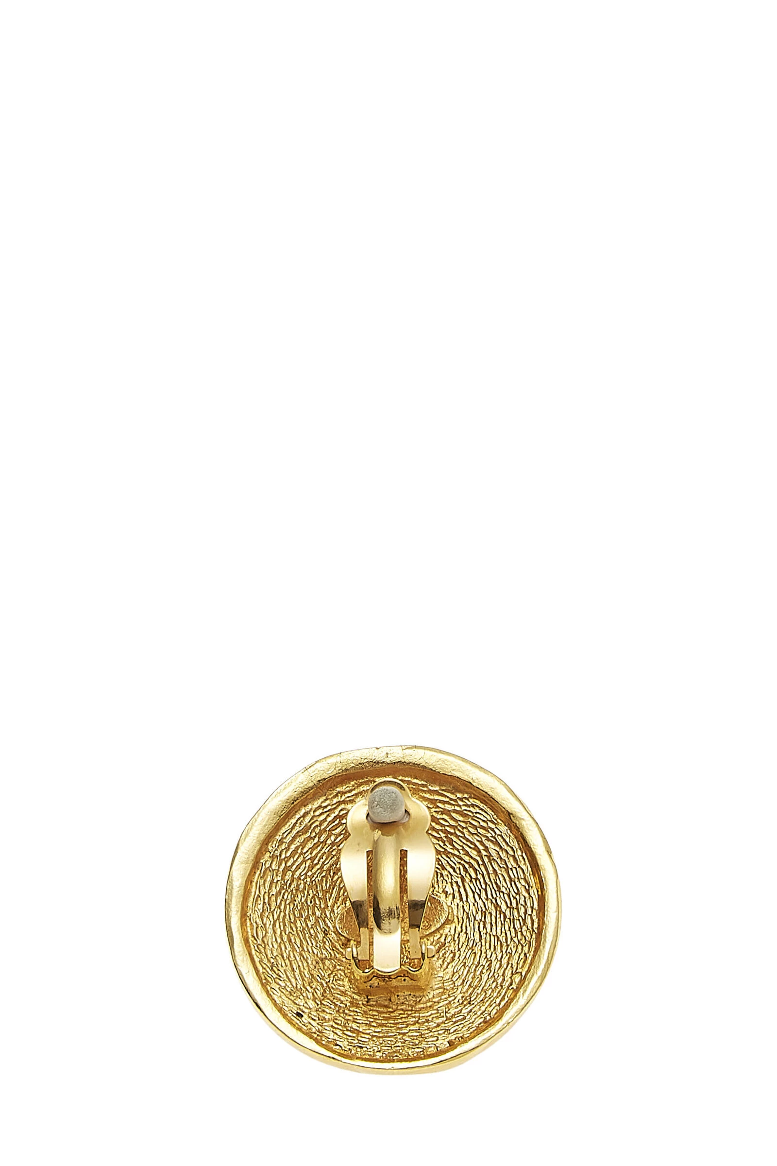 Vintage Chanel clip-on earrings crafted in etched gold-tone metal, featuring the house’s Rue Cambon logo engravings.
