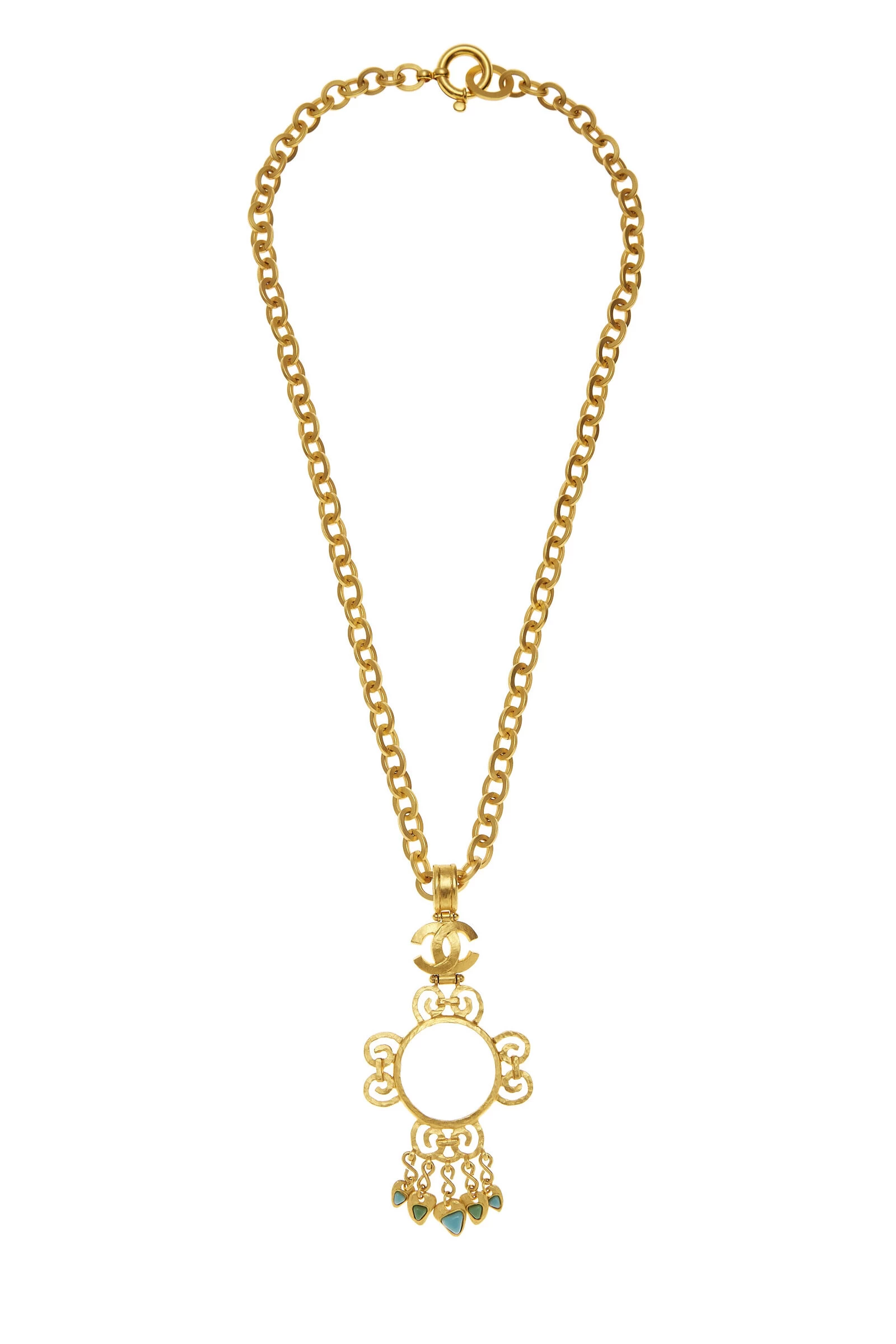 Vintage Spring 1995 Chanel necklace featuring a gold-plated long chain and a loupe pendant with dangling turquoise-colored stone charms.