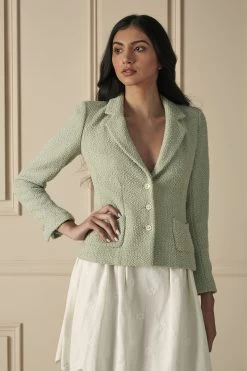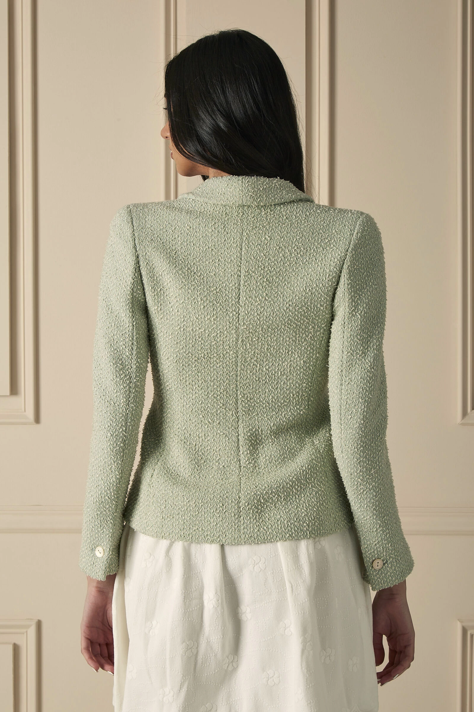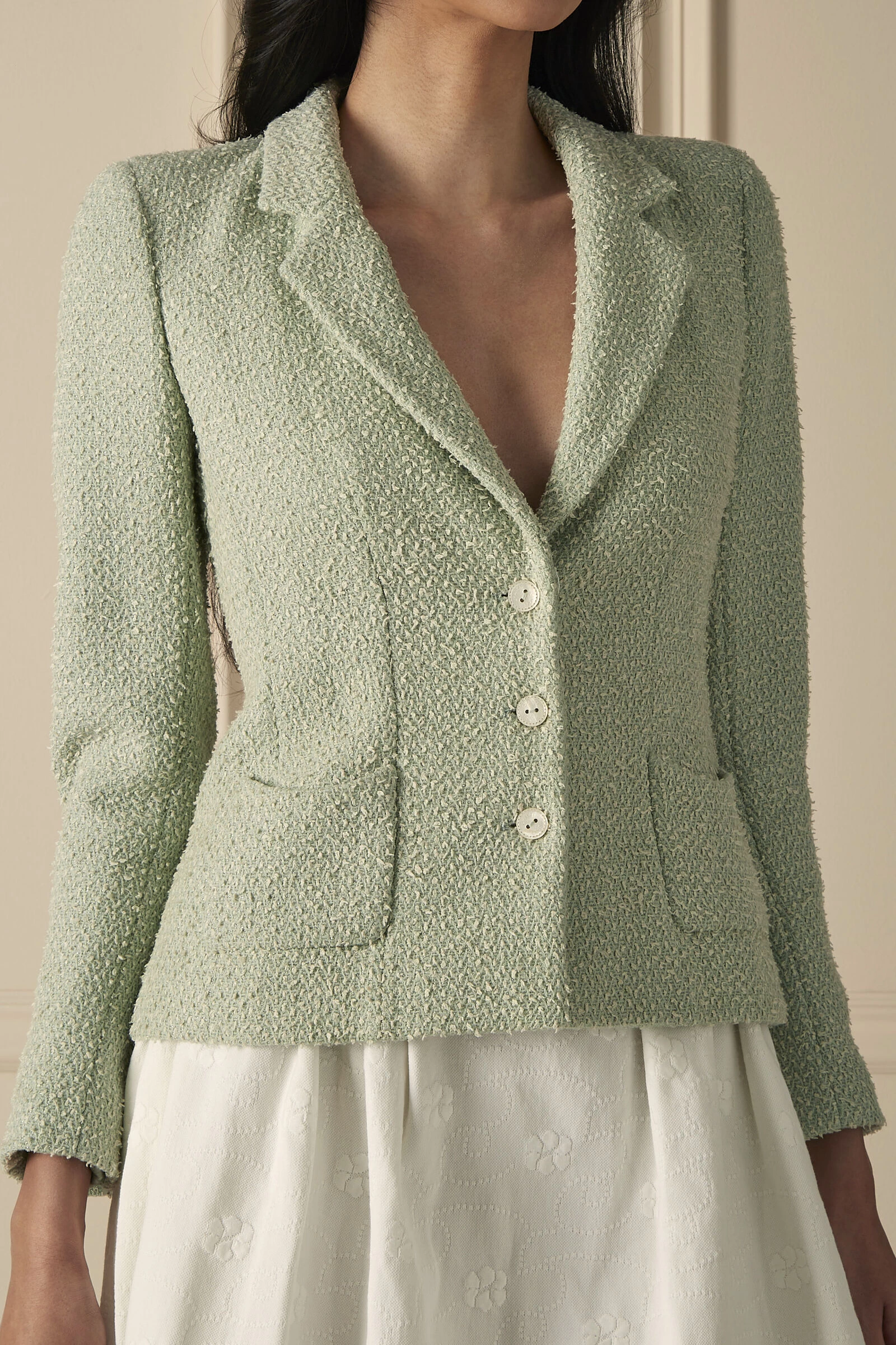 From Chanel’s 2003 Cruise collection, this pastel mint green blazer shimmers beautifully with its lurex-woven wool tweed. With a slight flared silhouette for a flattering look, classic notch collar, and two functional front pockets, this blazer is accented with white logo-engraved mother-of-pearl buttons to add a perfectly chic and polished touch to any outfit.