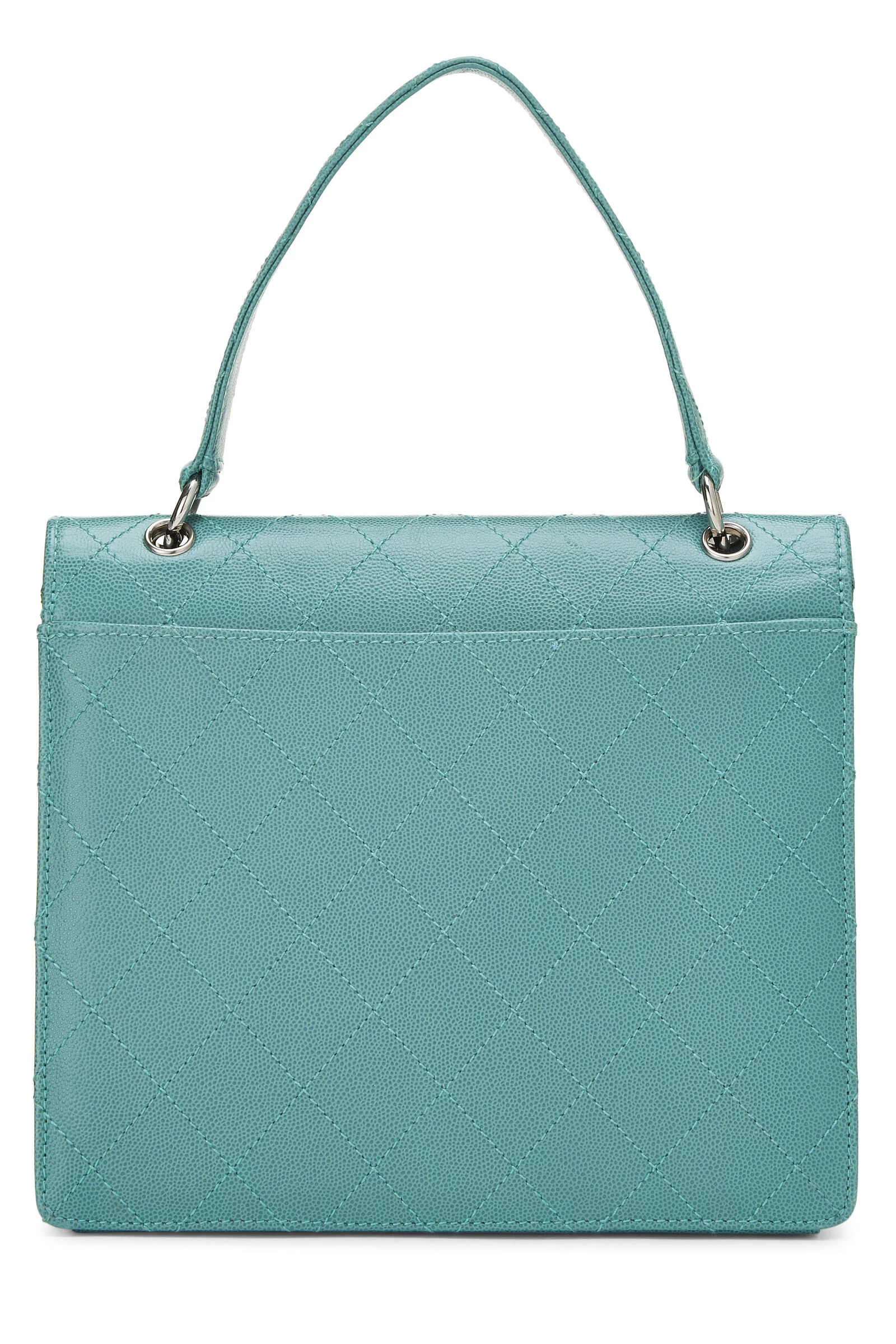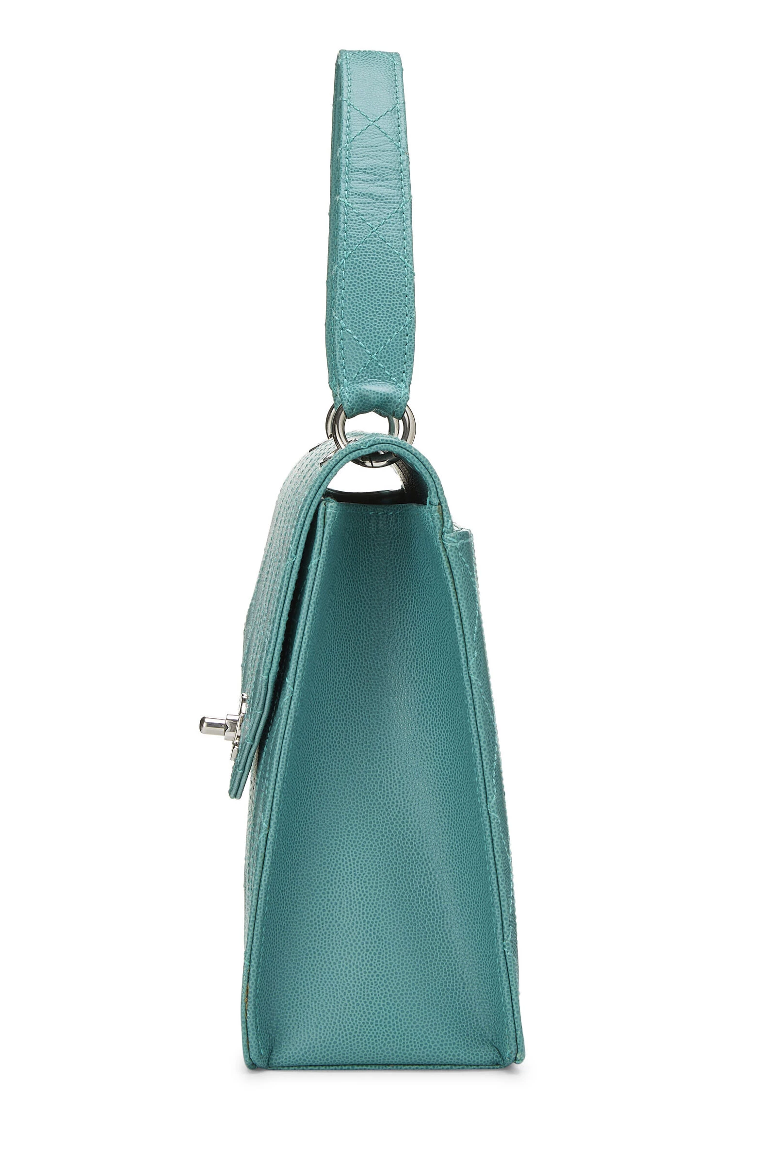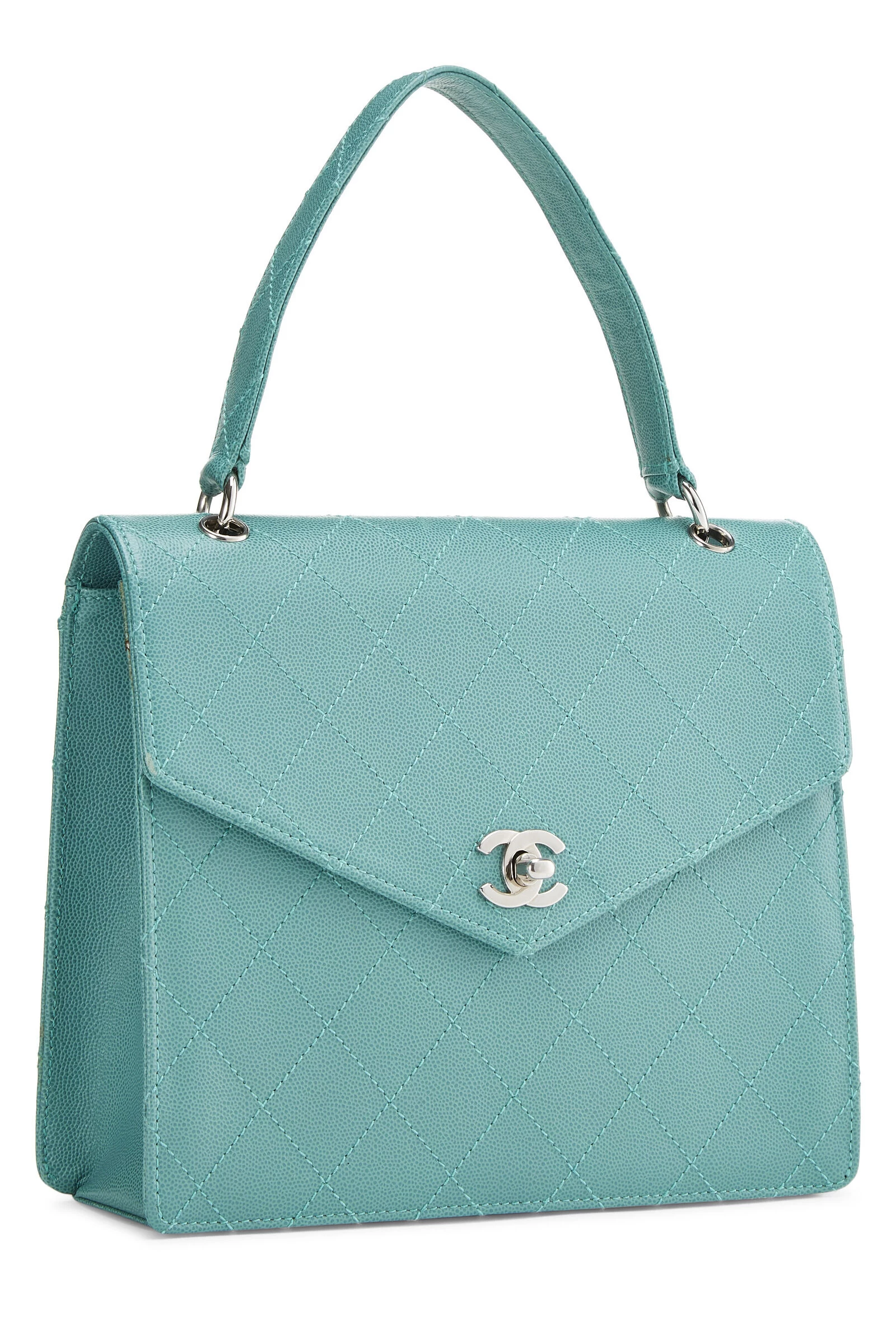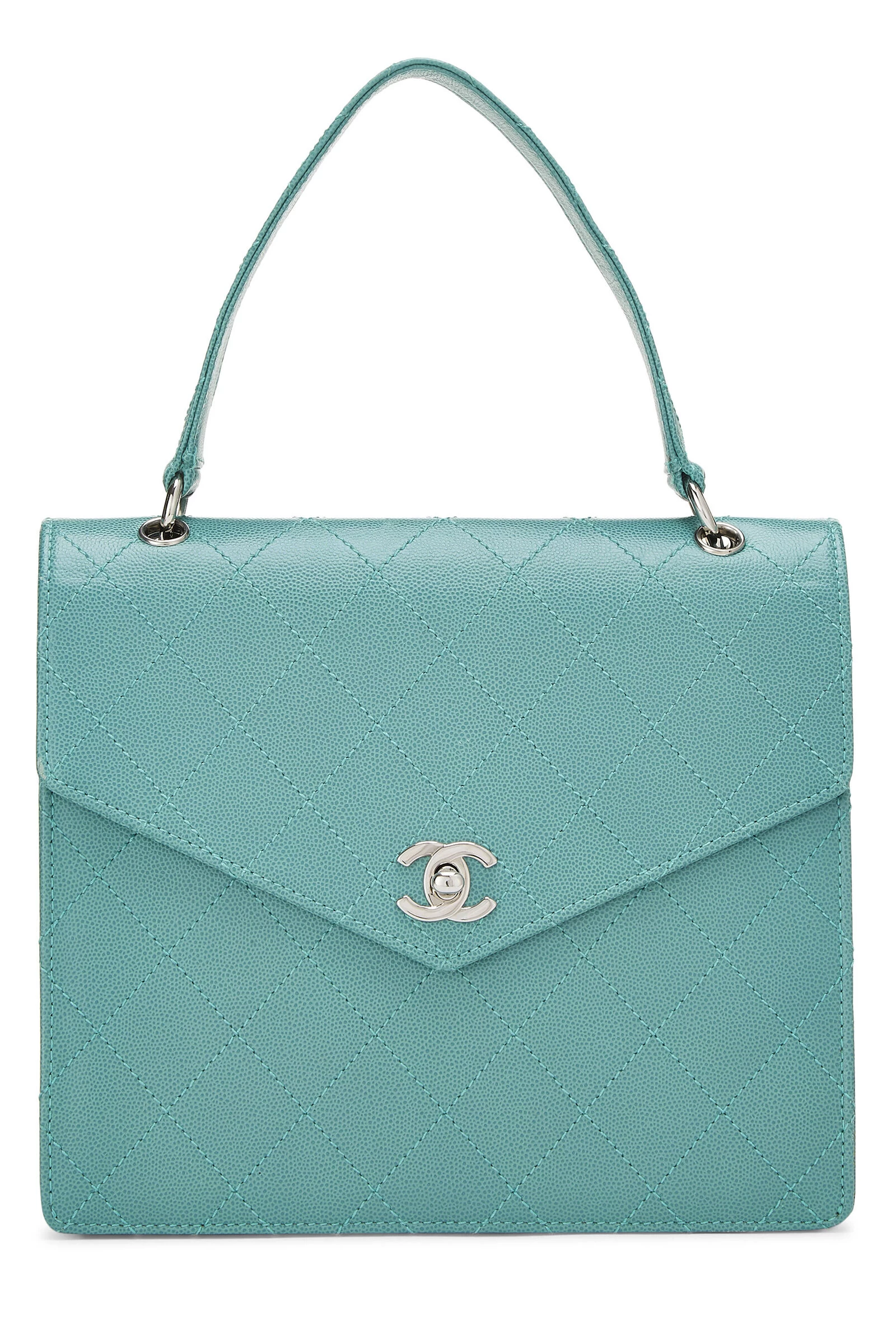 Vintage late 90s Chanel shoulder bag in green Caviar leather, featuring envelope-style front flap with silver-tone ‘CC’ turnlock closure.
