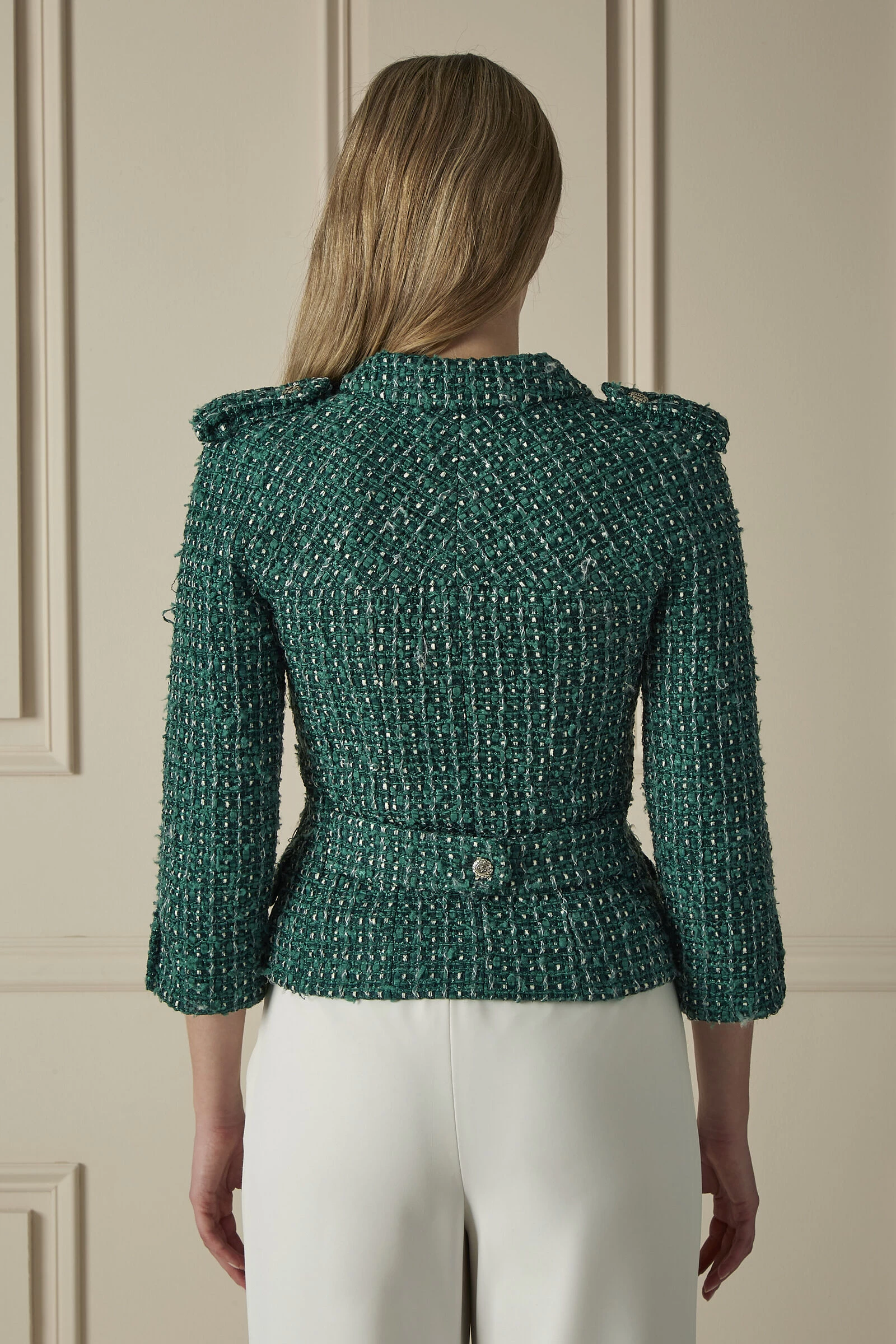 Even without the ‘CC’ engraved buttons, it’d be crystal-clear this cropped silhouette was stitched with a Chanel tag. It first debuted on Karl Lagerfeld’s Cruise 2006 runway, and remains a highly covetable wardrobe slot today. It was crafted from the Maison’s age-old tweed with silver-tone hardware for subtle shine. Cropped at both the hem and sleeves, it also features shoulder epaulets and a similar fastening at the back for a cinched-in fit. Pair yours with leg-lengthening white trousers and summer sandals.