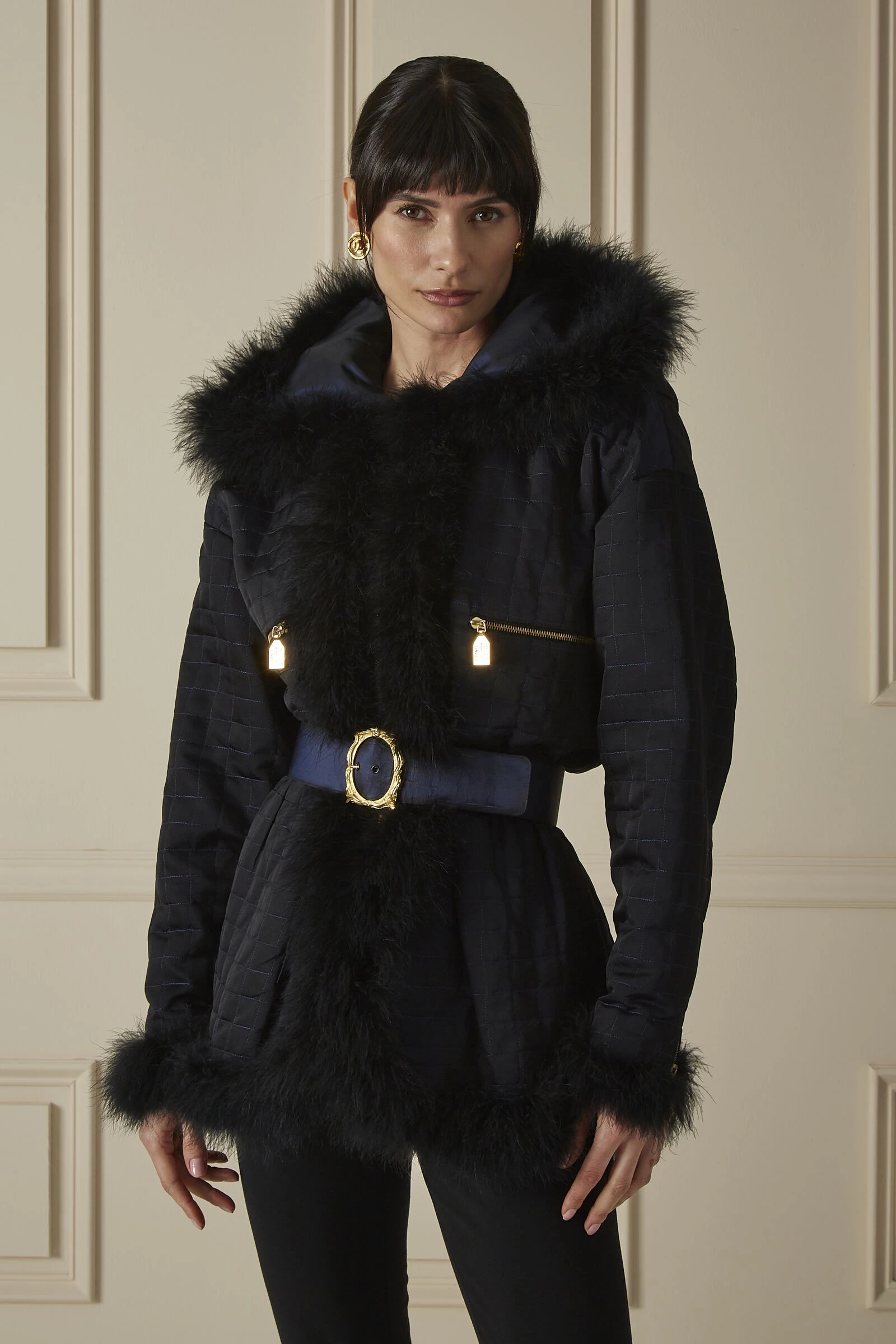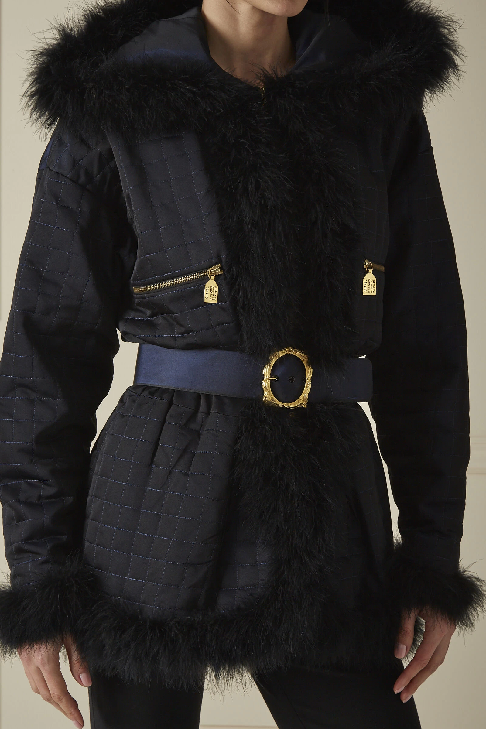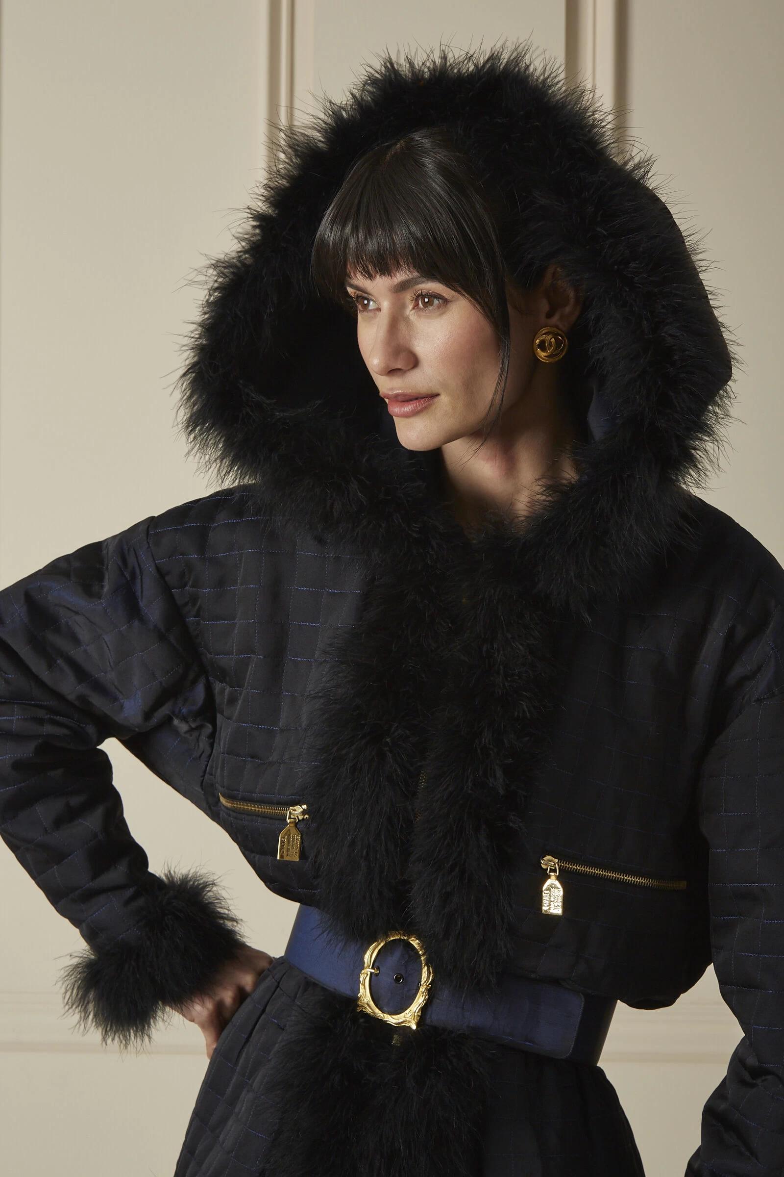 With an eye-catching iridescent shimmer, this navy silk Chanel puffer coat features quilted detailing and a chic, matching feather trim throughout. This hooded coat is styled with an elasticated cinched waistband for a flattering and comfortable silhouette, while gold-tone zip hardware adds a polished touch. Perfect to wear for many winters to come, this coat is finished with two front zip pockets and an optional matching belt with an ornate gold-tone buckle.