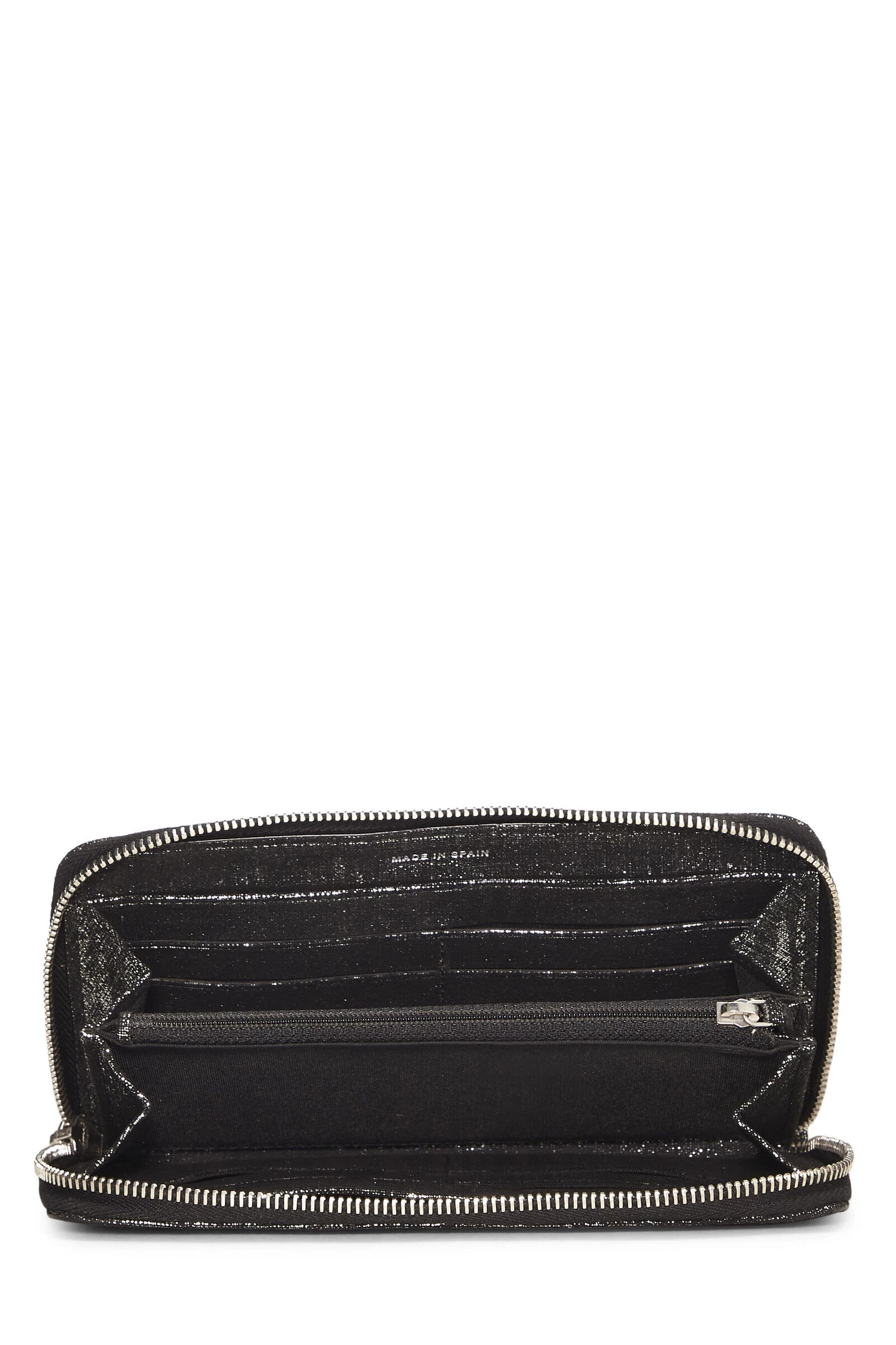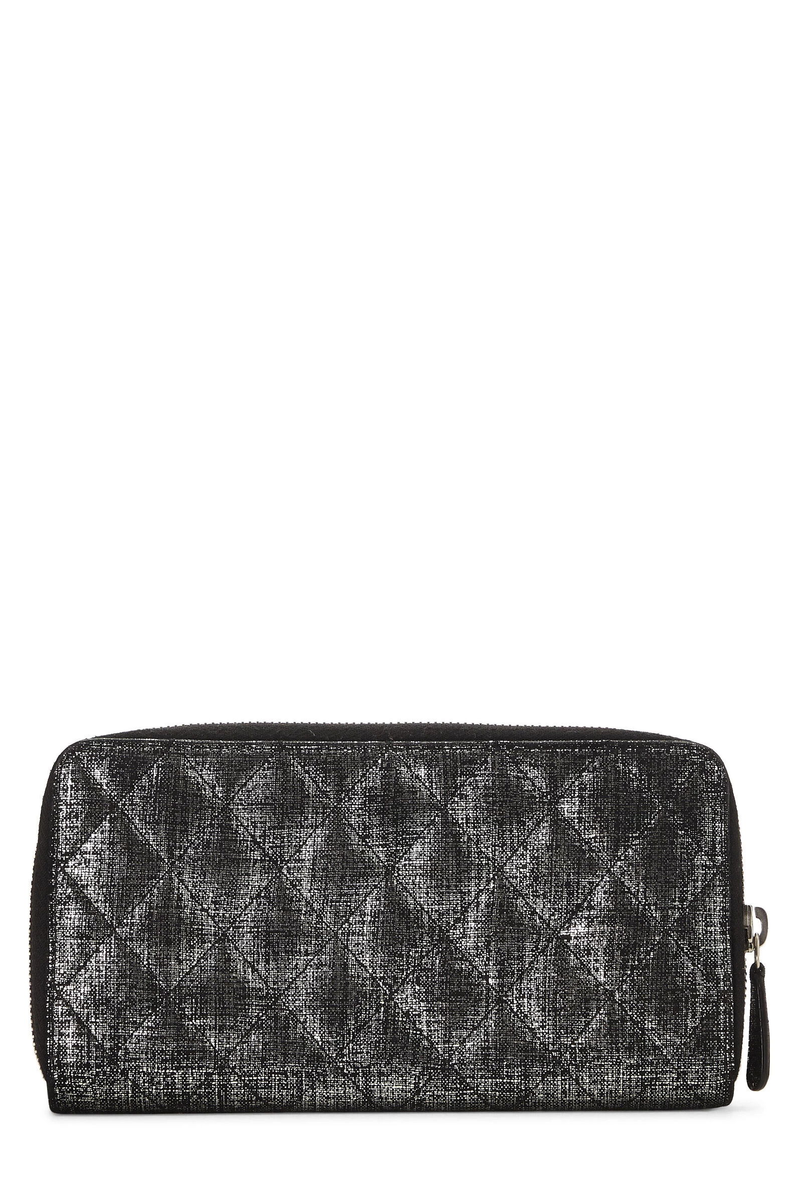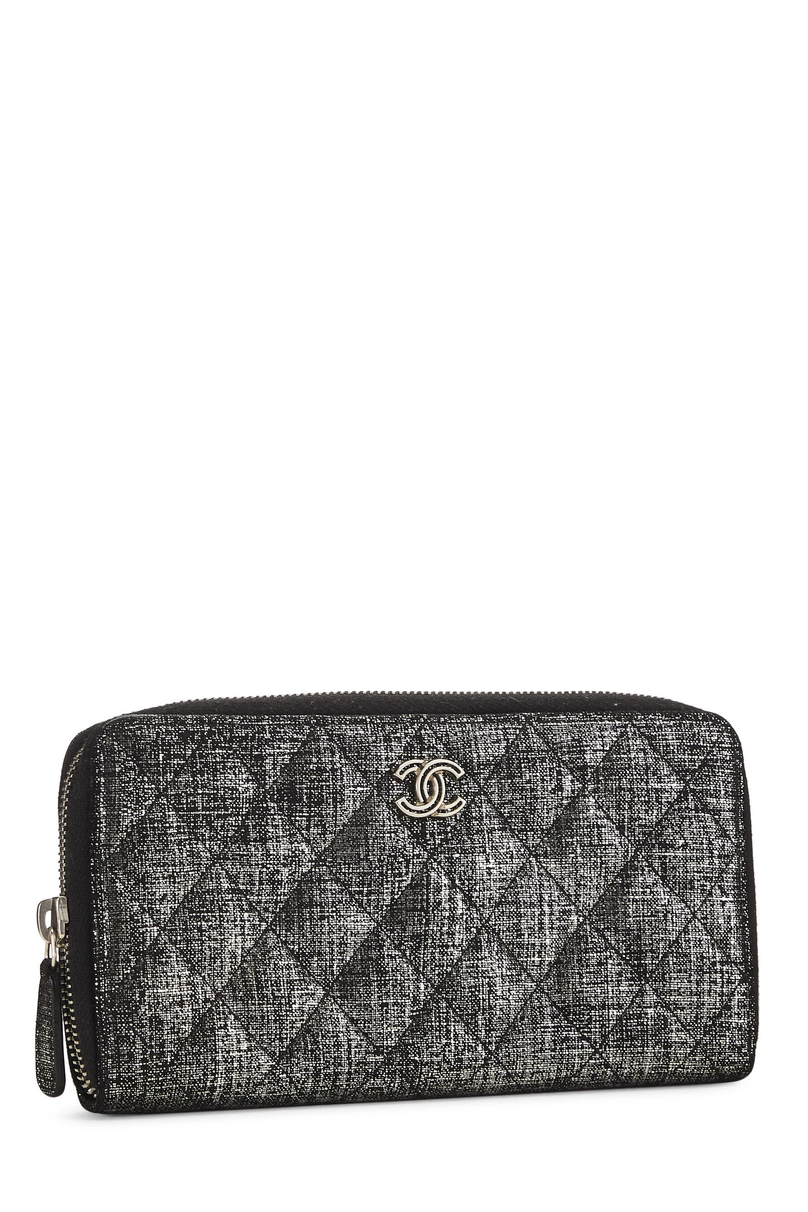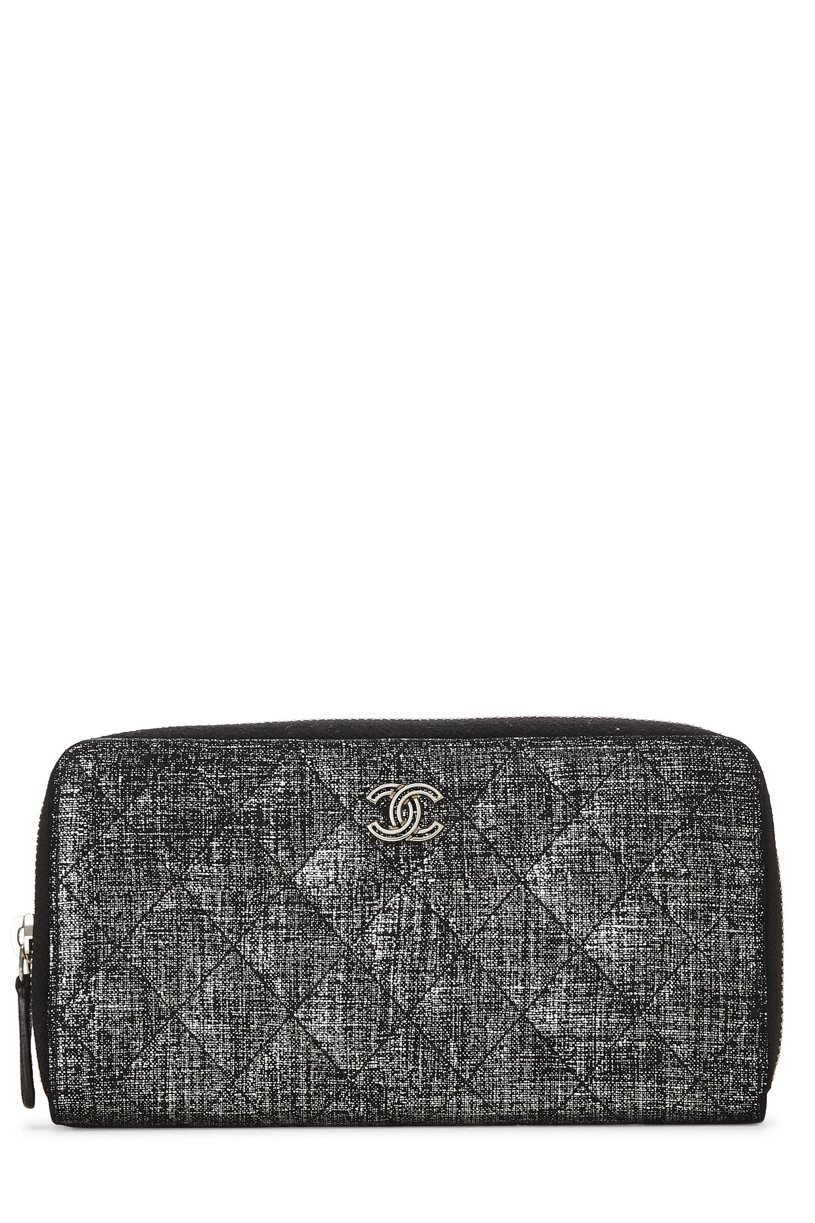 A glamorous rendition to Chanel’s classic zip-around wallet, this luxe piece comes rendered in black and shimmery metallic silver fabric with the house’s signature diamond quilting, featuring a matching interior, and finished with a silver-tone metal cutout ‘CC’ accent on front.