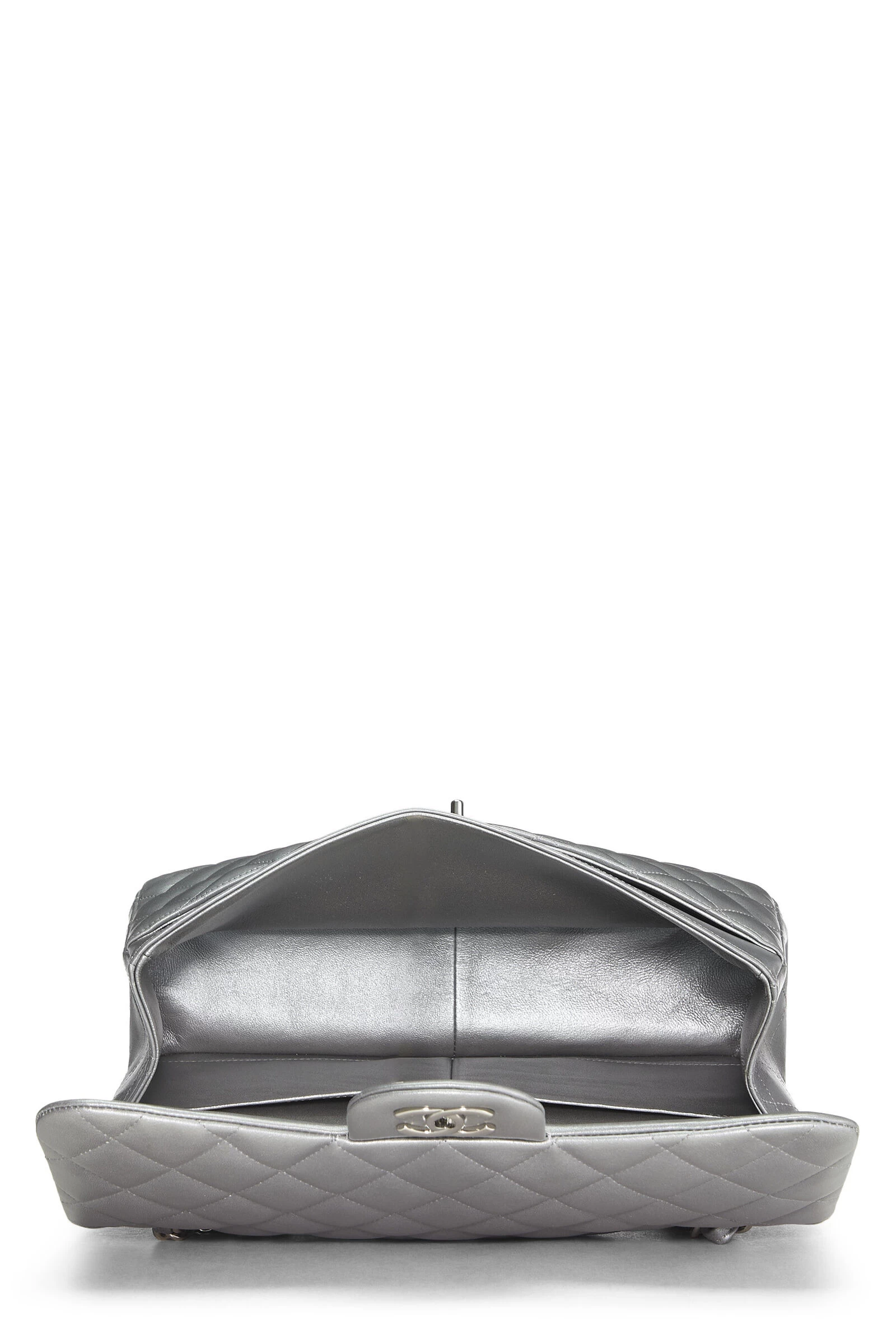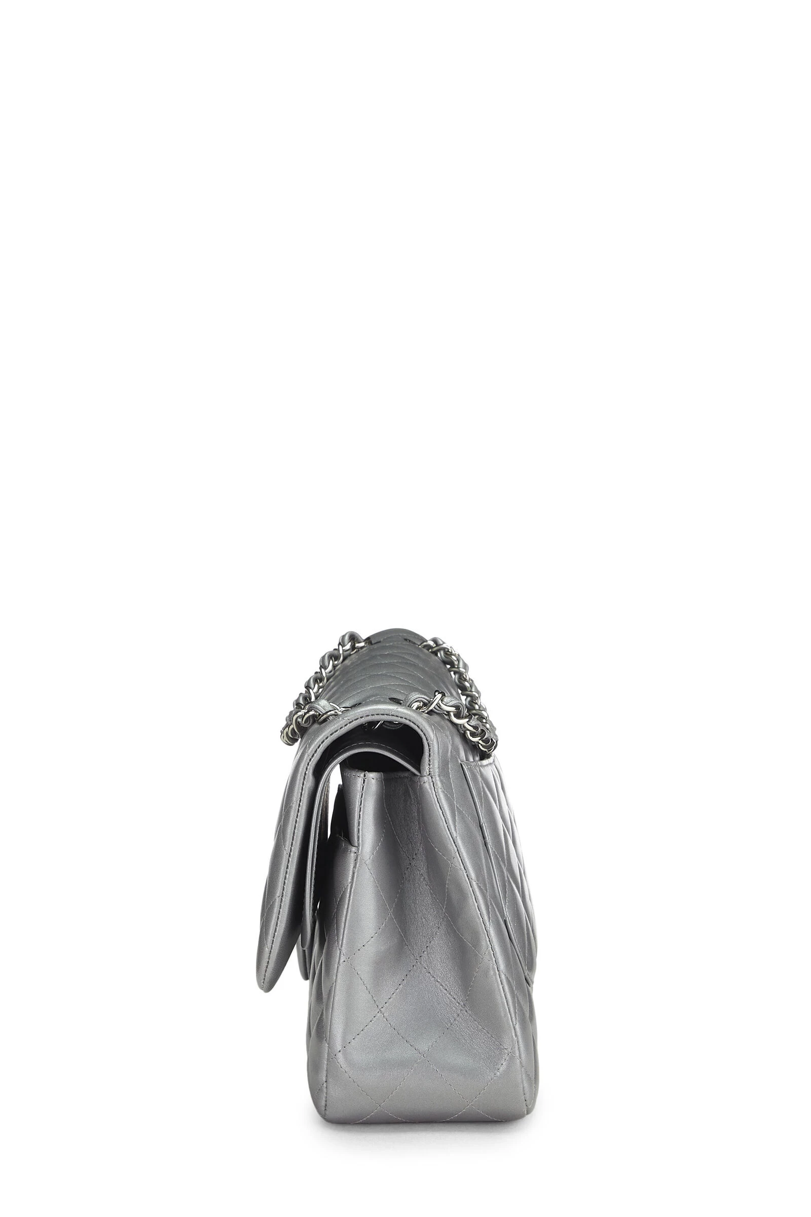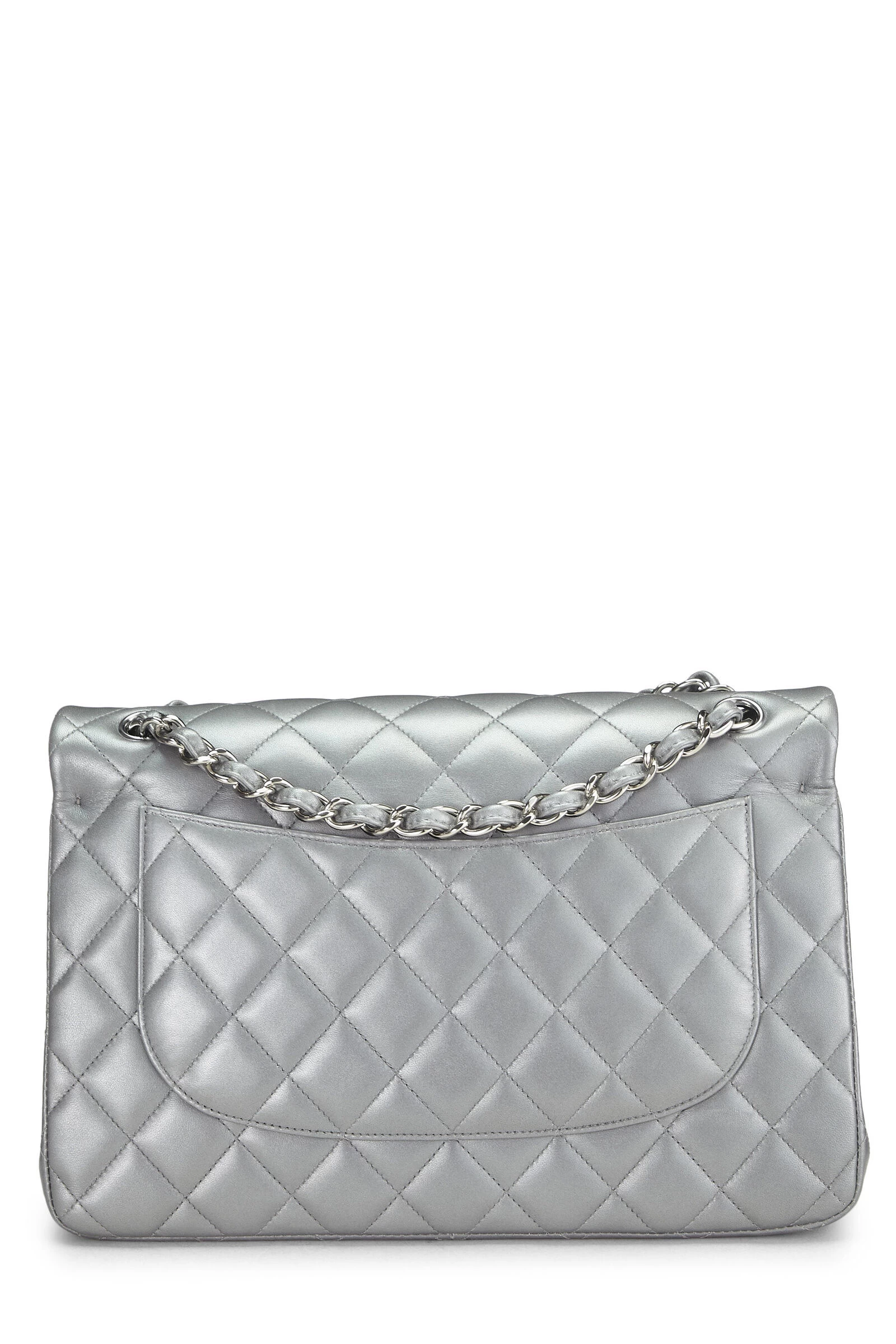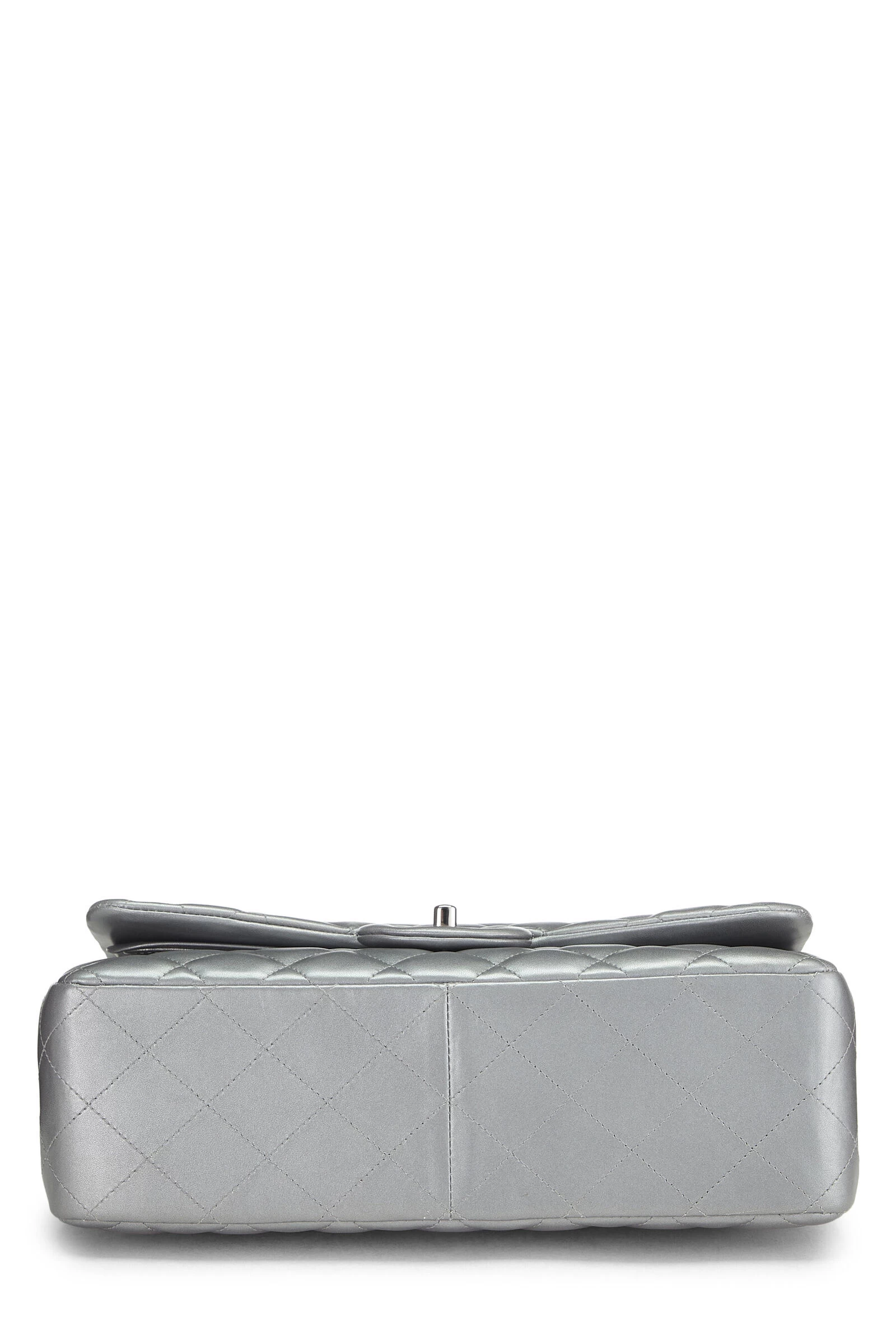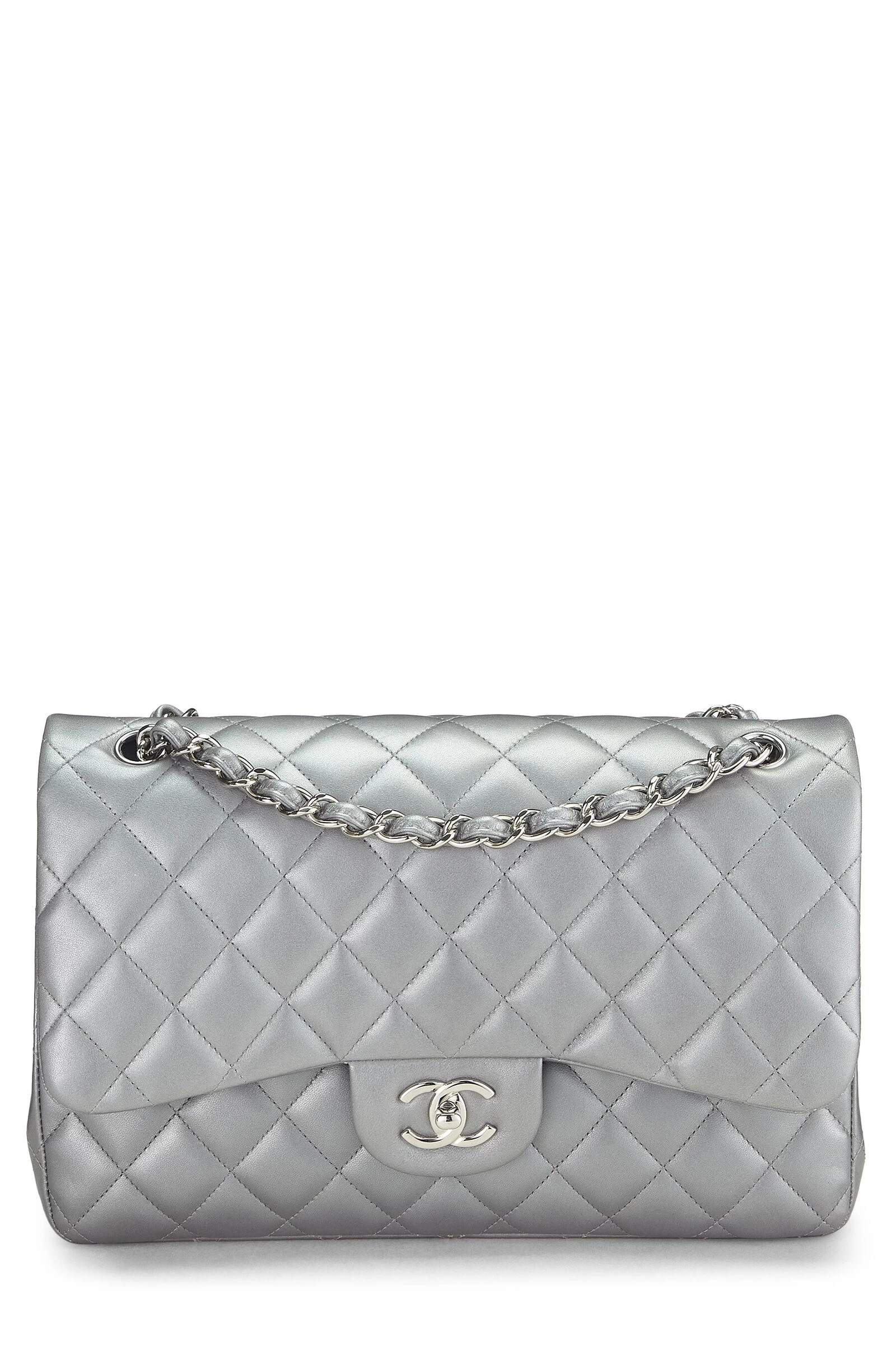 This iconic Chanel Classic Double Flap new model shoulder bag is crafted in metallic silver diamond-quilted lambskin leather and accented with silver-tone ‘CC’ turnlock and chain hardware.