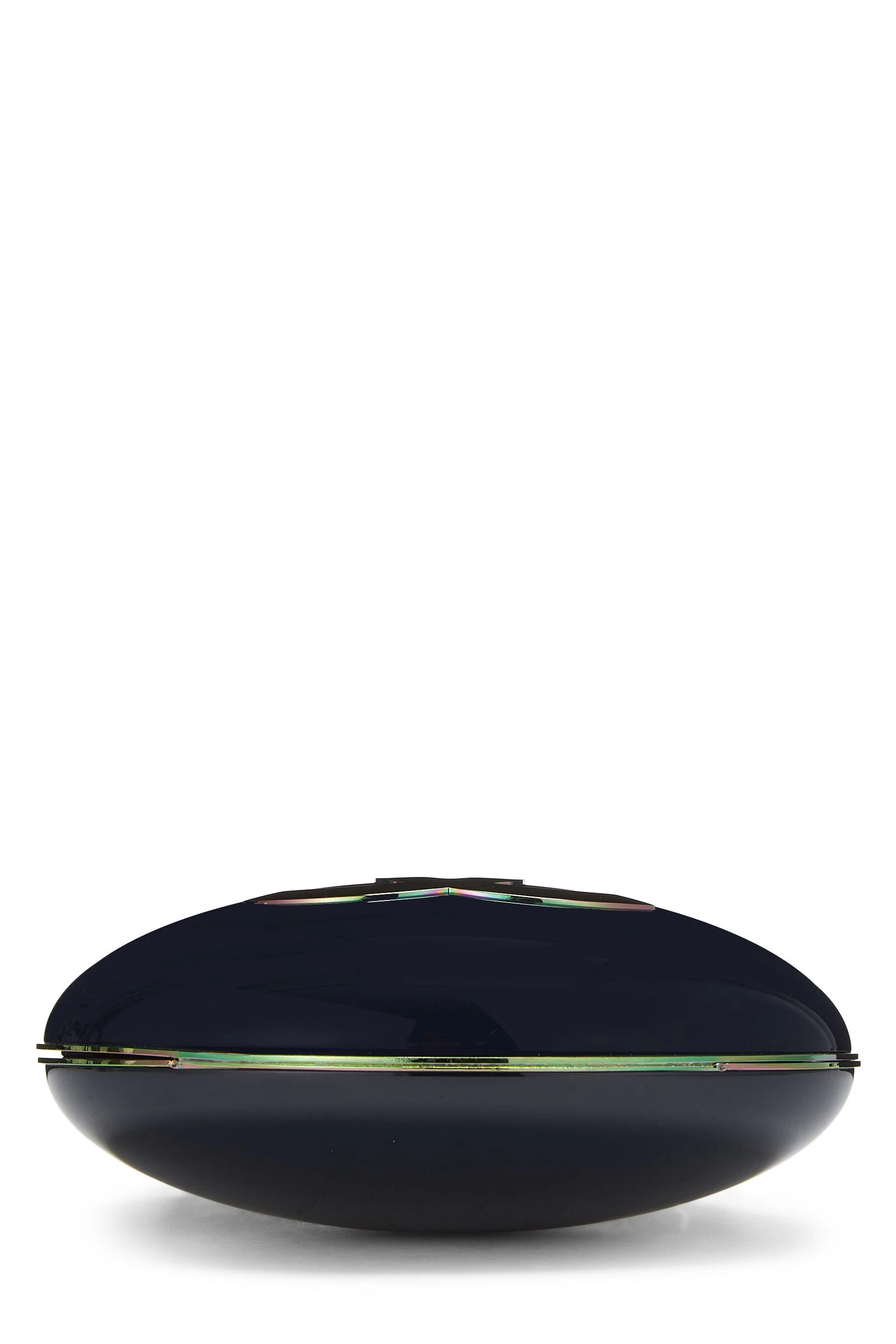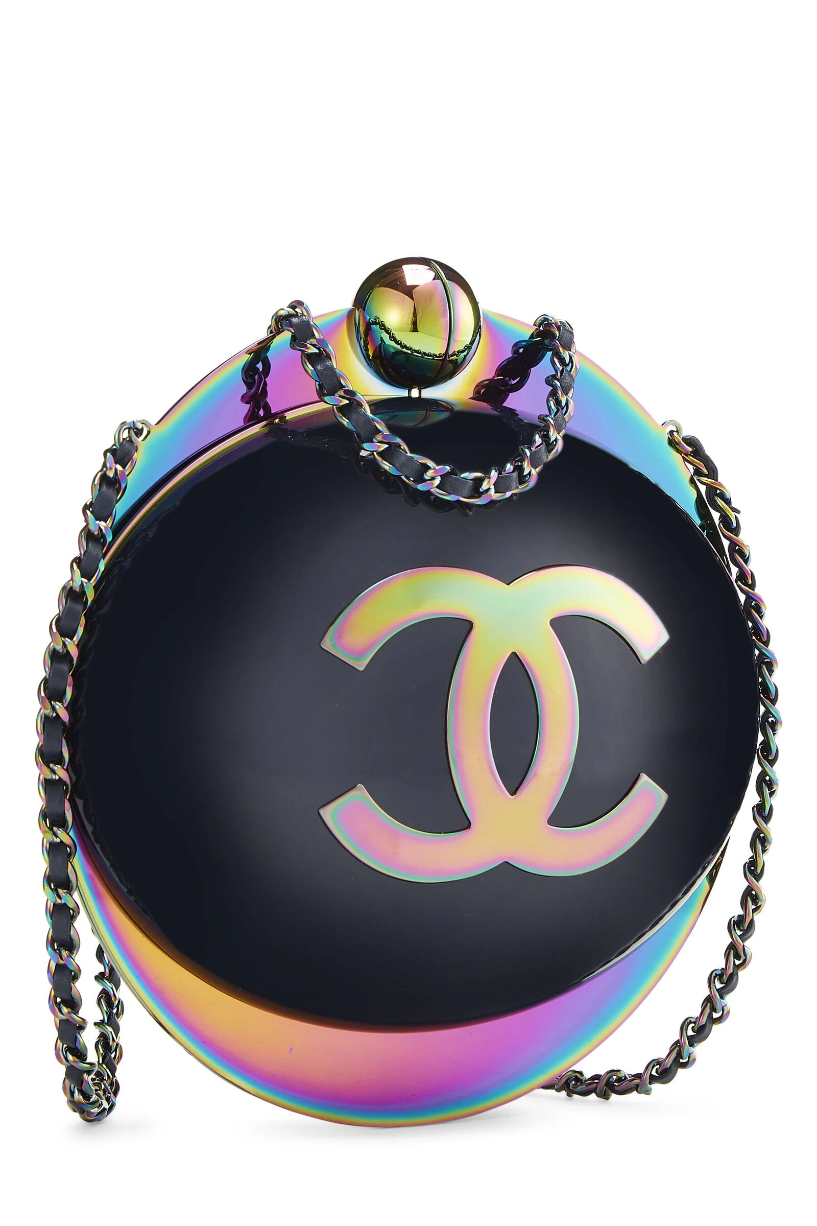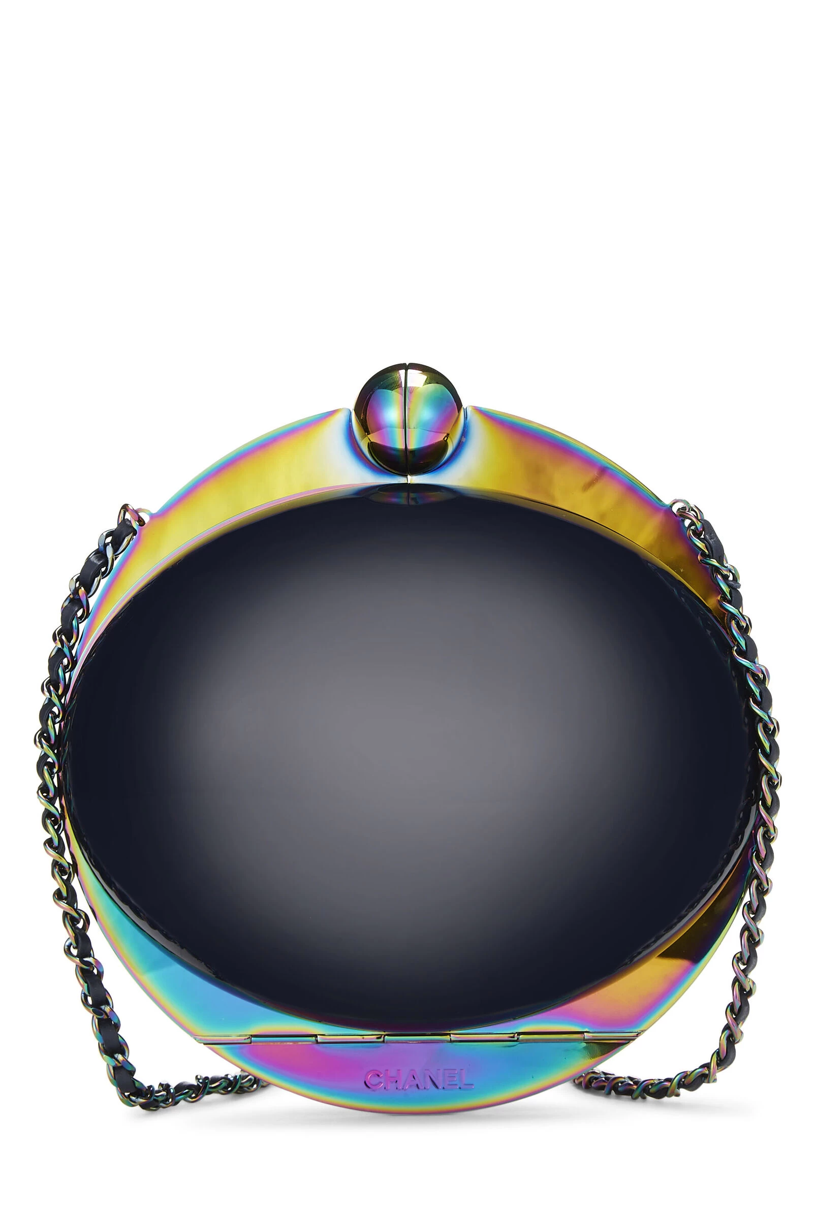 As much an art piece as it is a functional evening bag, the Chanel On The Moon CC Minaudière Bag is the perfect bag to throw over your shoulder and head out for an exciting night on the town. Crafted in a stunning multicolor rainbow ombrè along with a round clasp closure on the top of the bag a deep blue leather lining. Zhush-up any night out with this perfectly chic companion piece.