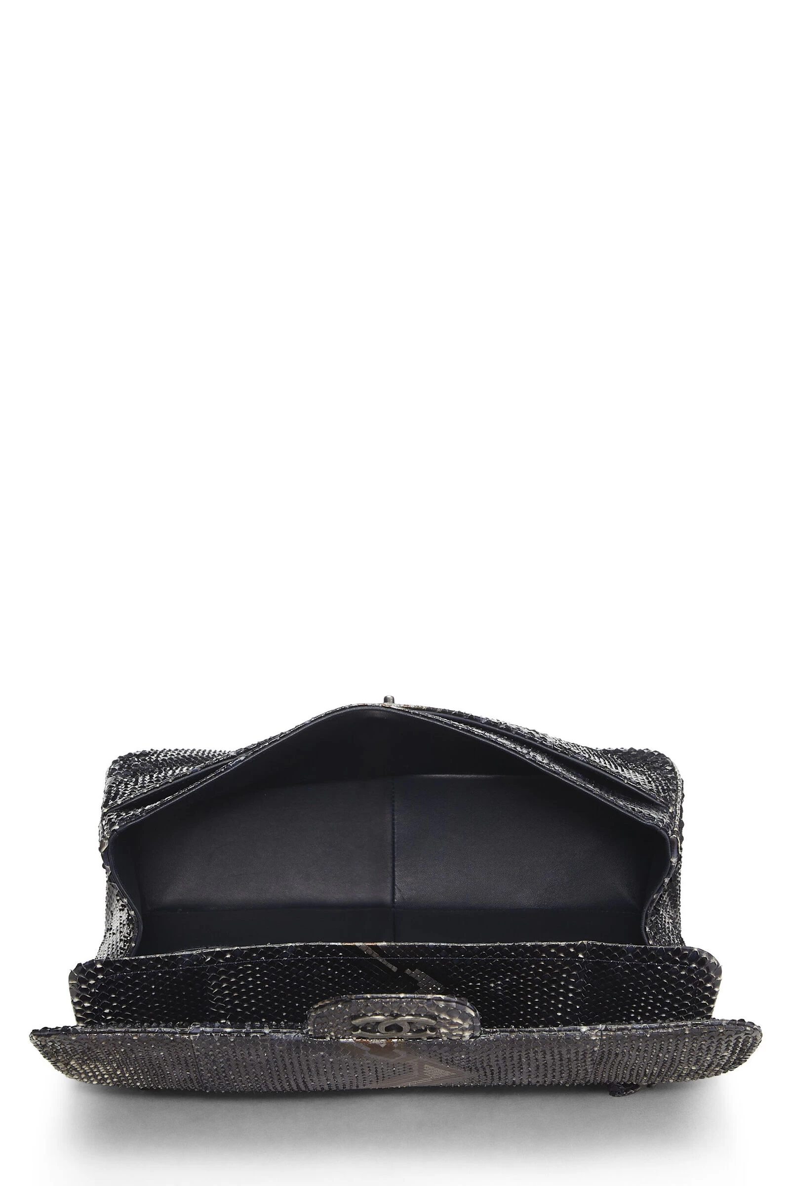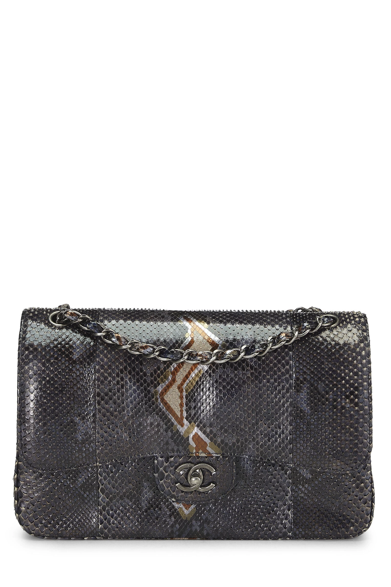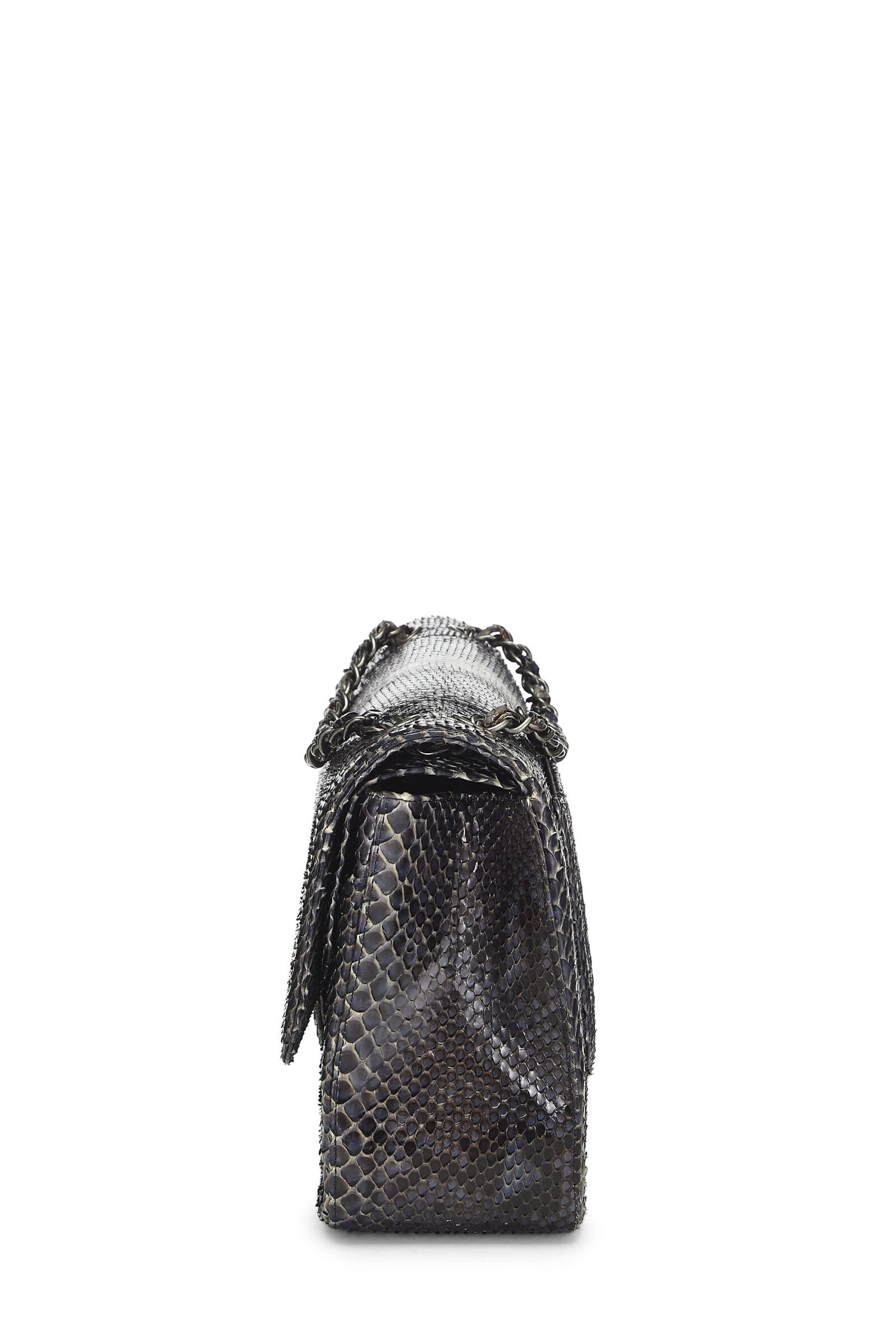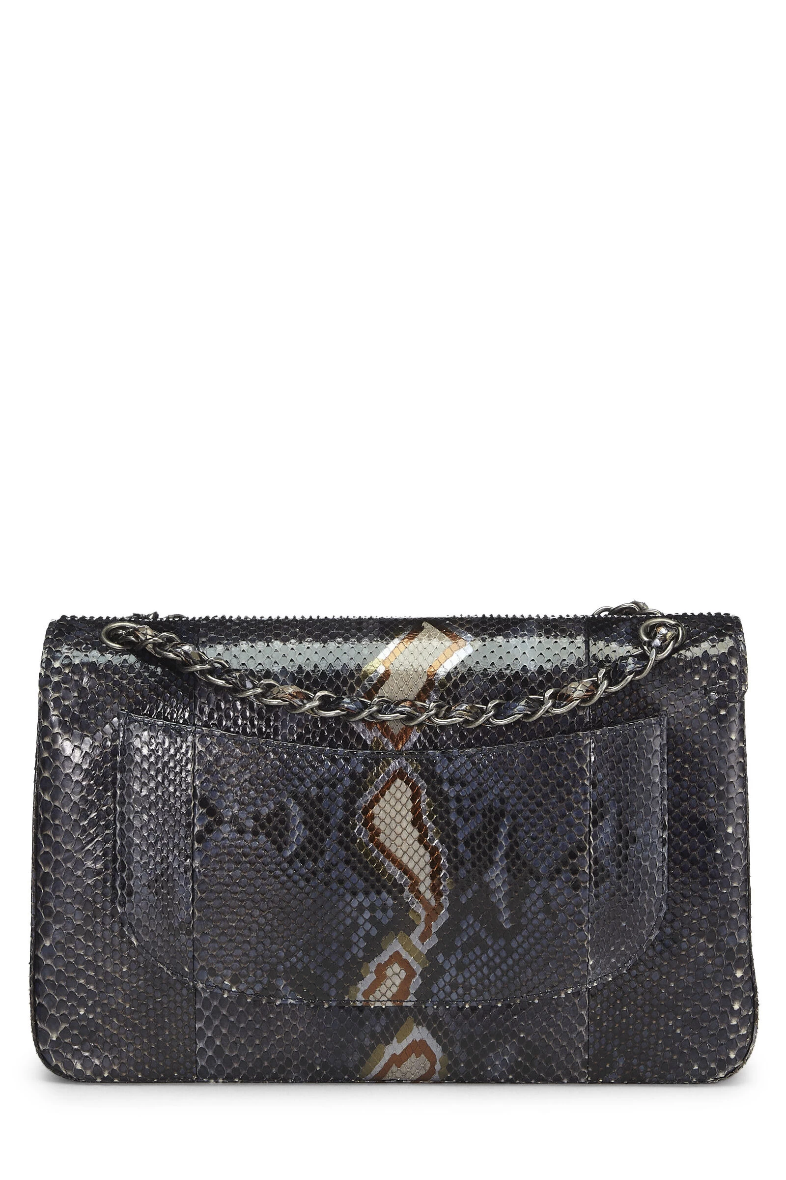 This rare Chanel Classic Flap new model shoulder bag is crafted in a luxe navy python exterior, a tonal leather interior and accented with antiqued gunmetal logo and chain hardware.