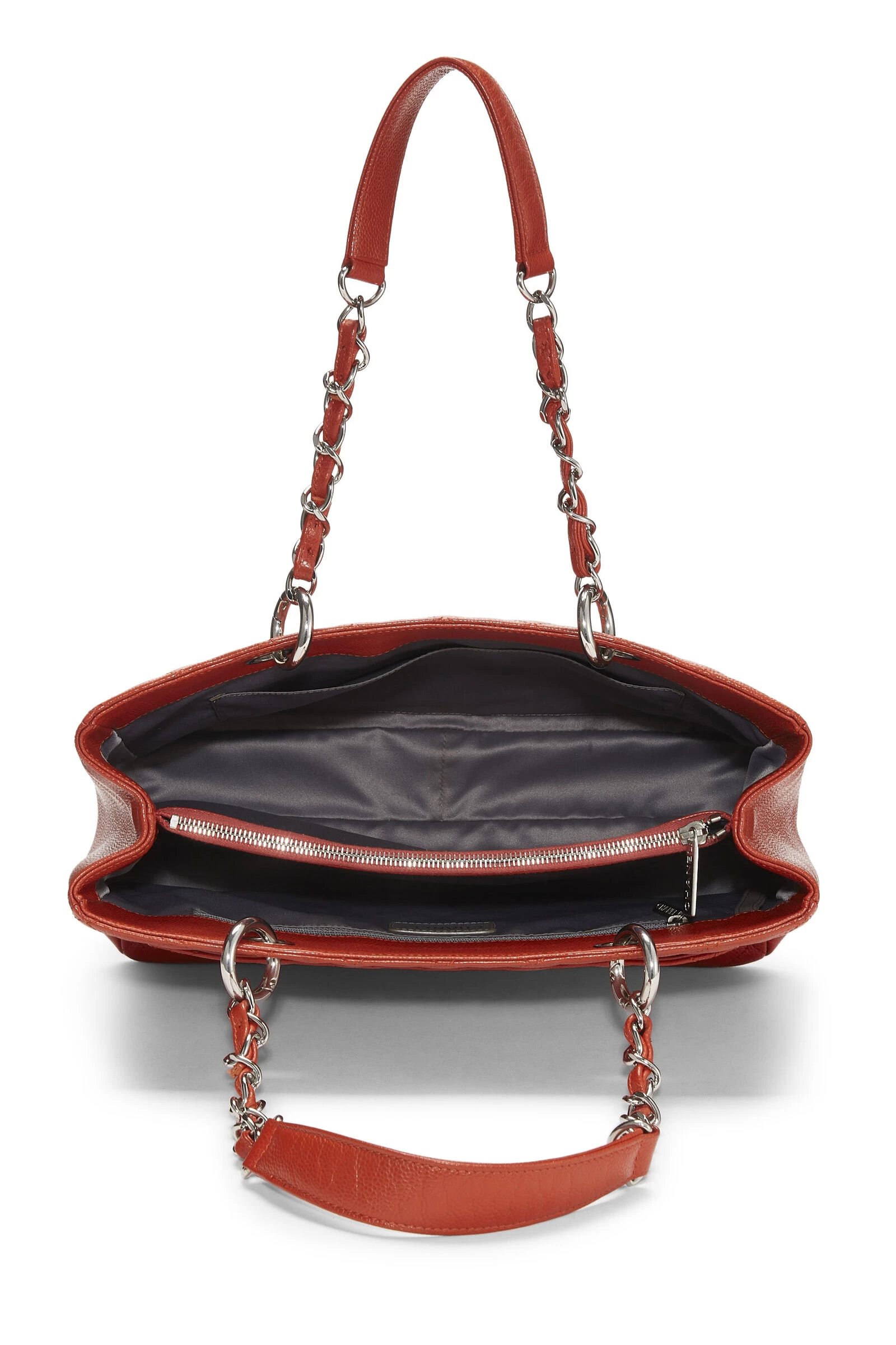 Classic Chanel Grand Shopping Tote (GST) rendered in a orange quilted Caviar leather, featuring interlocking ‘CC’ embroidery and finished with antiqued silver-tone chainlink hardware.