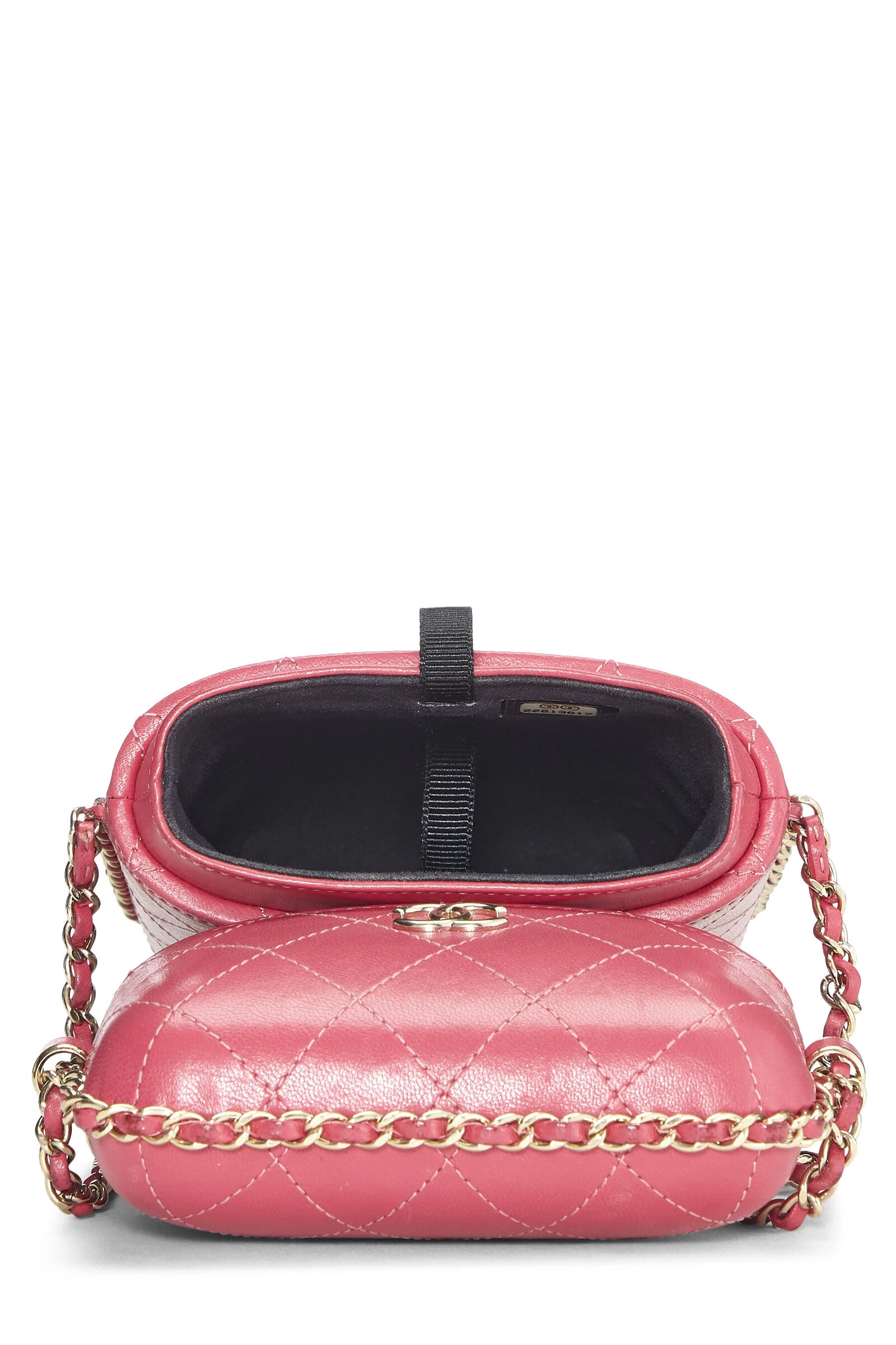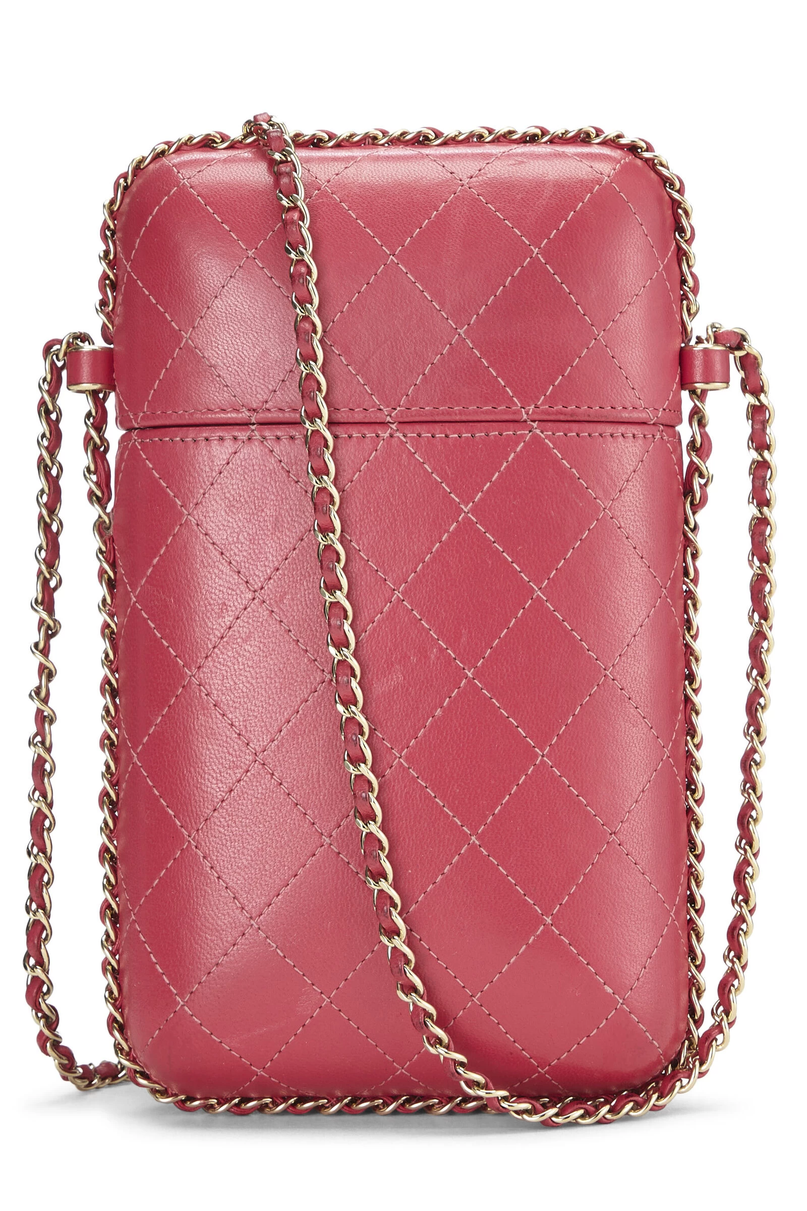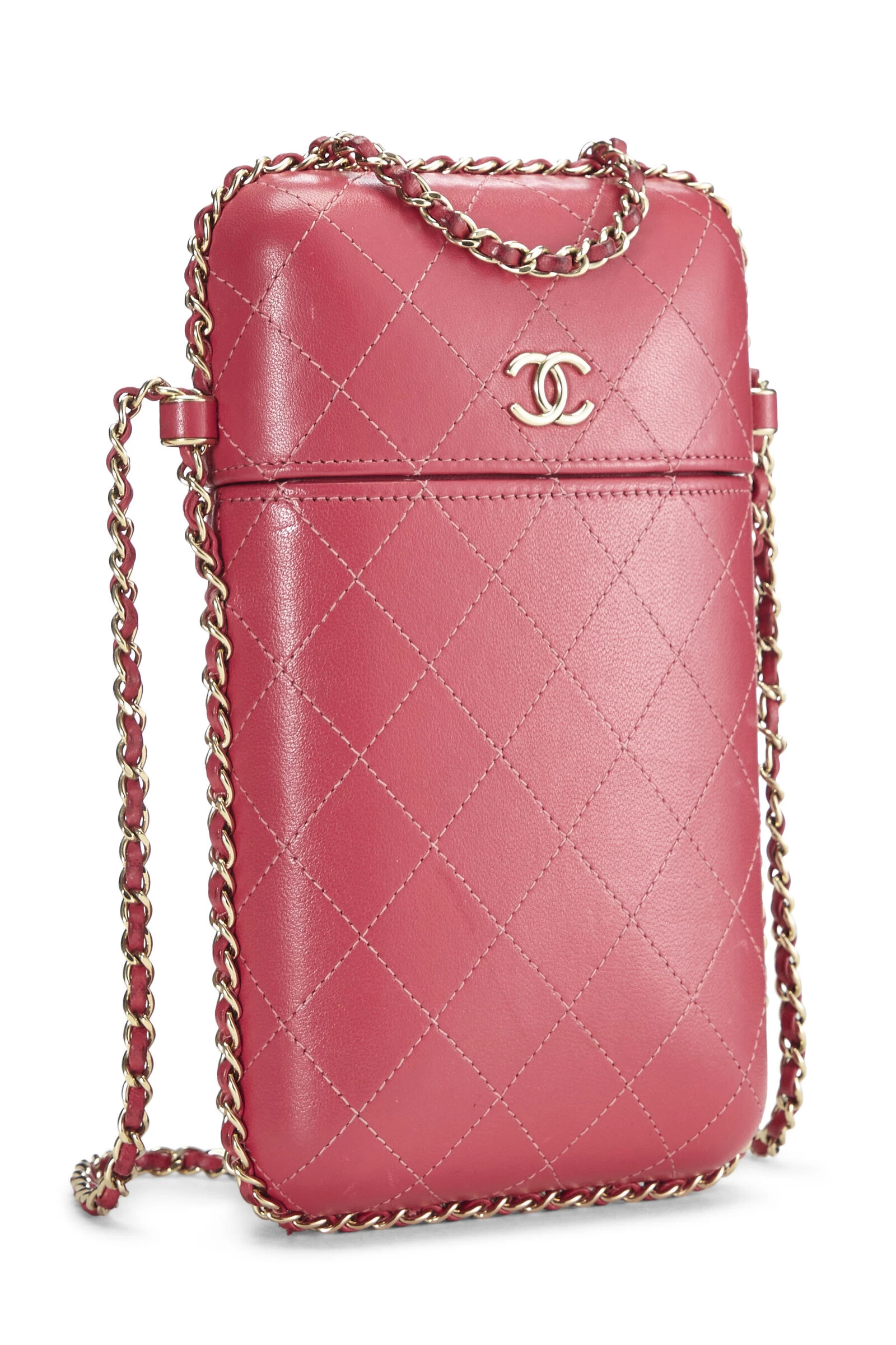 Chic calfskin leather phone holder featuring interlocking ‘CC’ logo motif and chain link and leather looped strap attached to the side of the case.