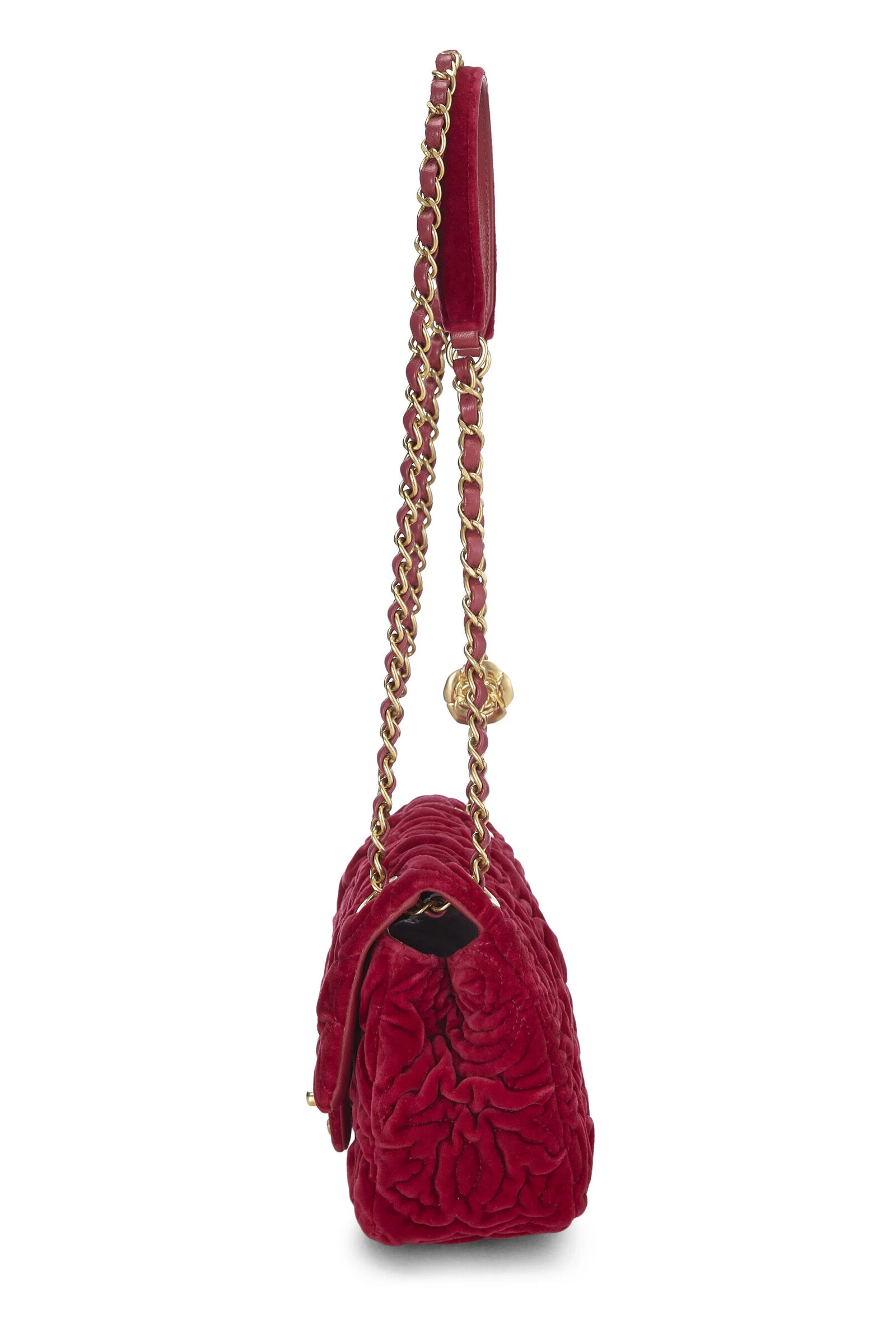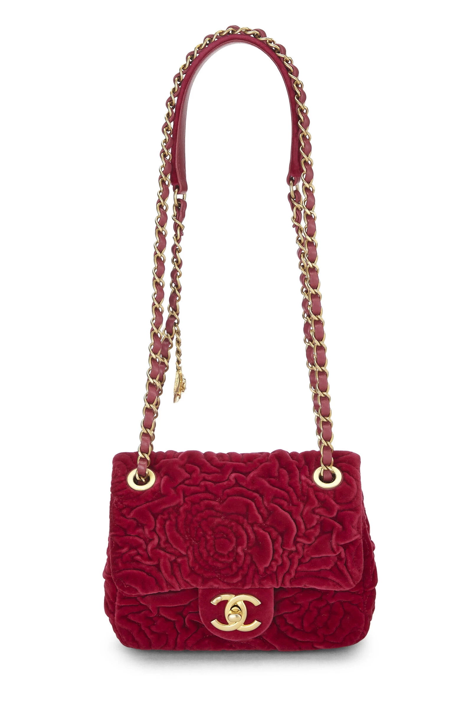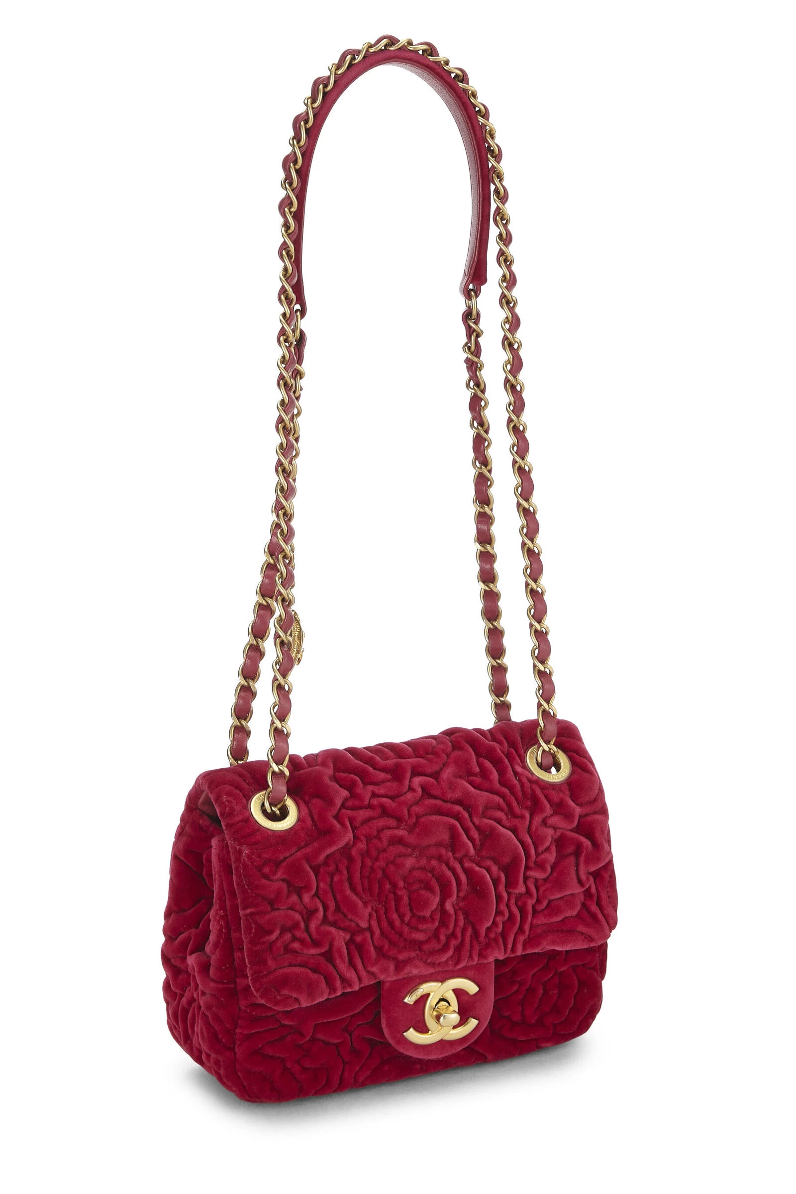 Chic and collectible Chanel Camelliai Flap bag crafted in pink velvet with iconic Camellia flower pattern, finished with gold-tone ‘CC’ turnlock and chain hardware.