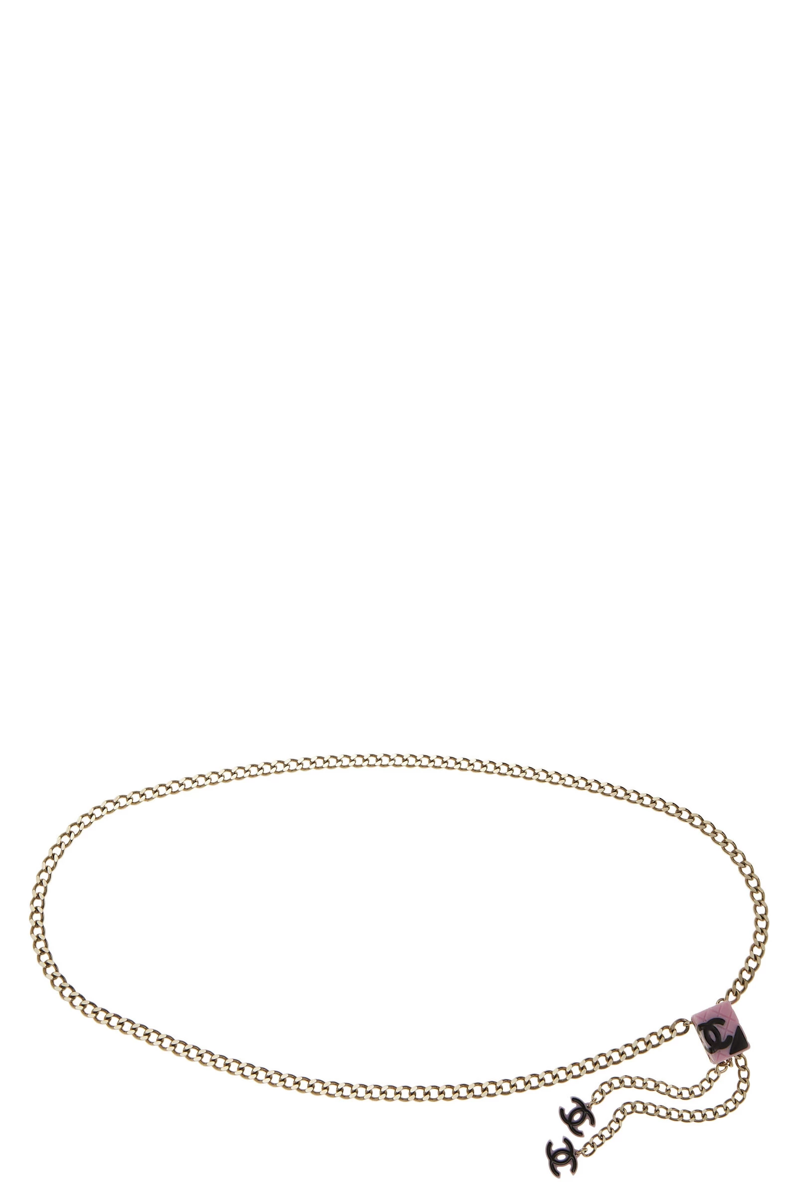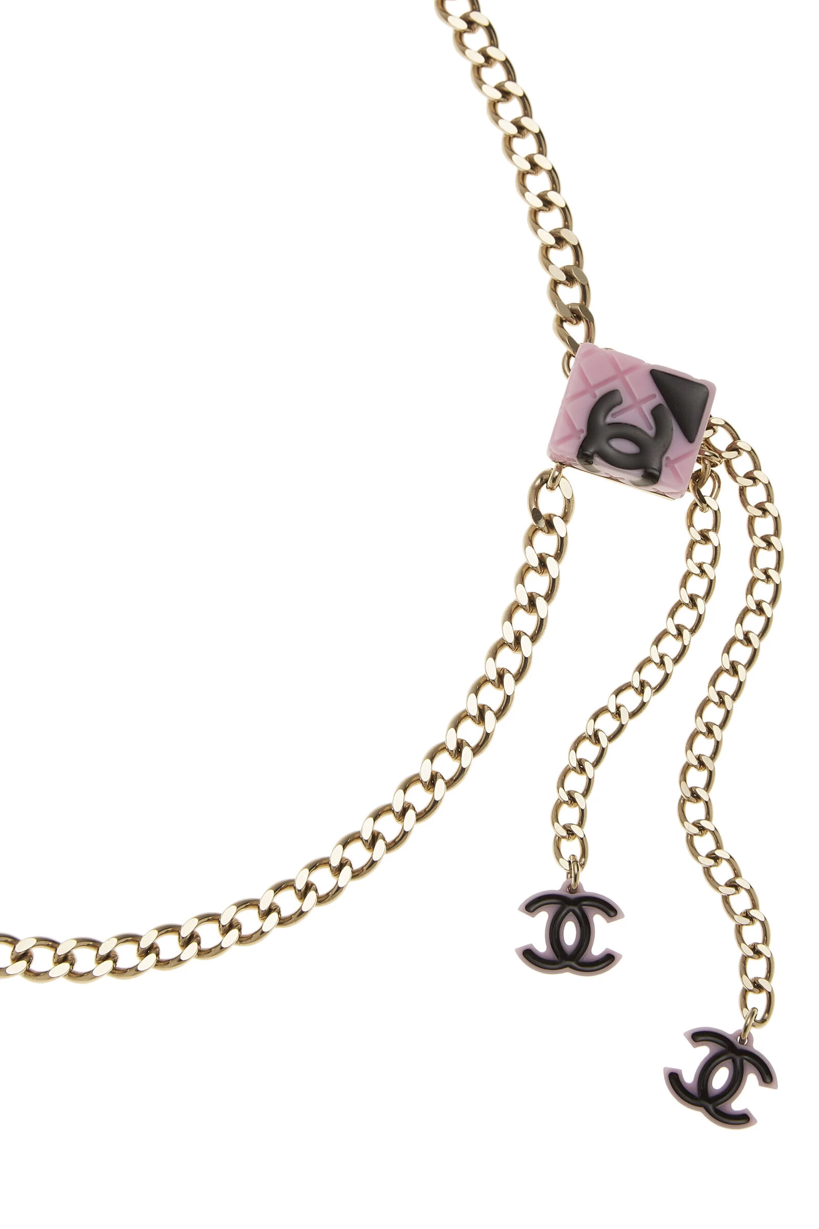 Chanel chain belt crafted in gold-plated metal and featuring interlocking ‘CC’ charms and square dangling Cambon engraved pink pendant.