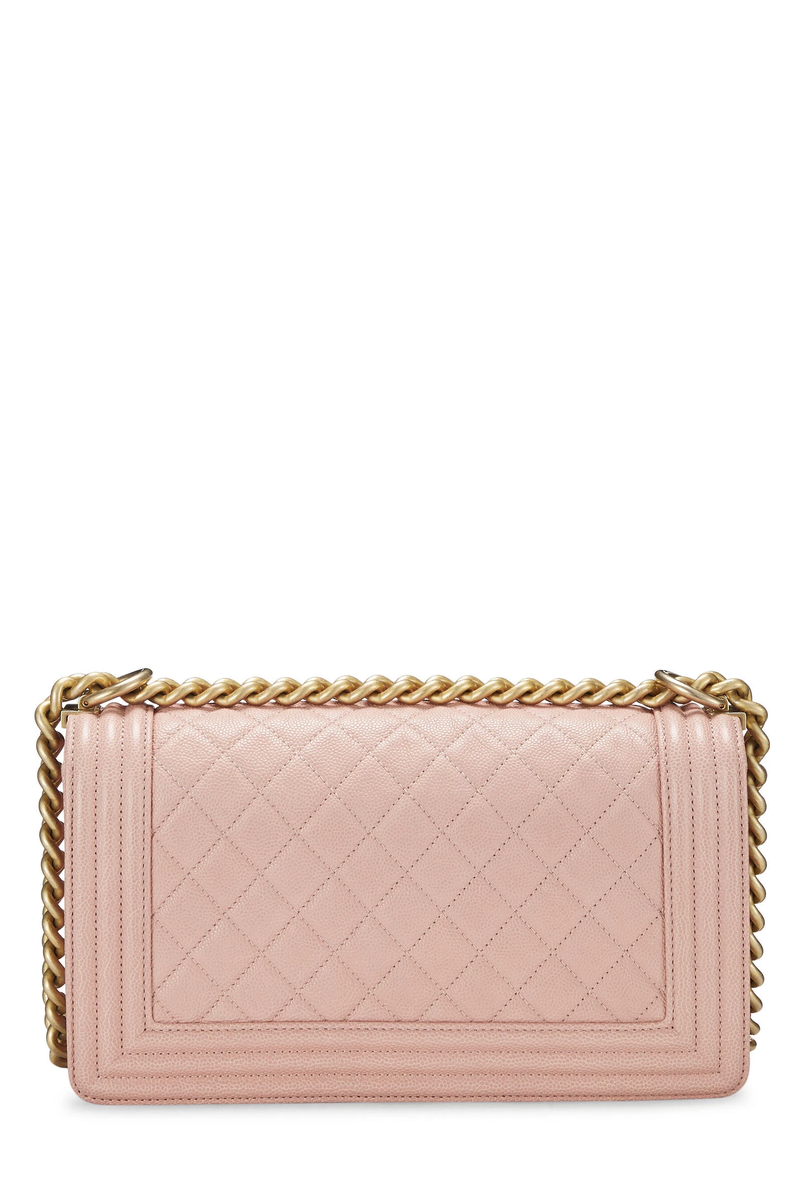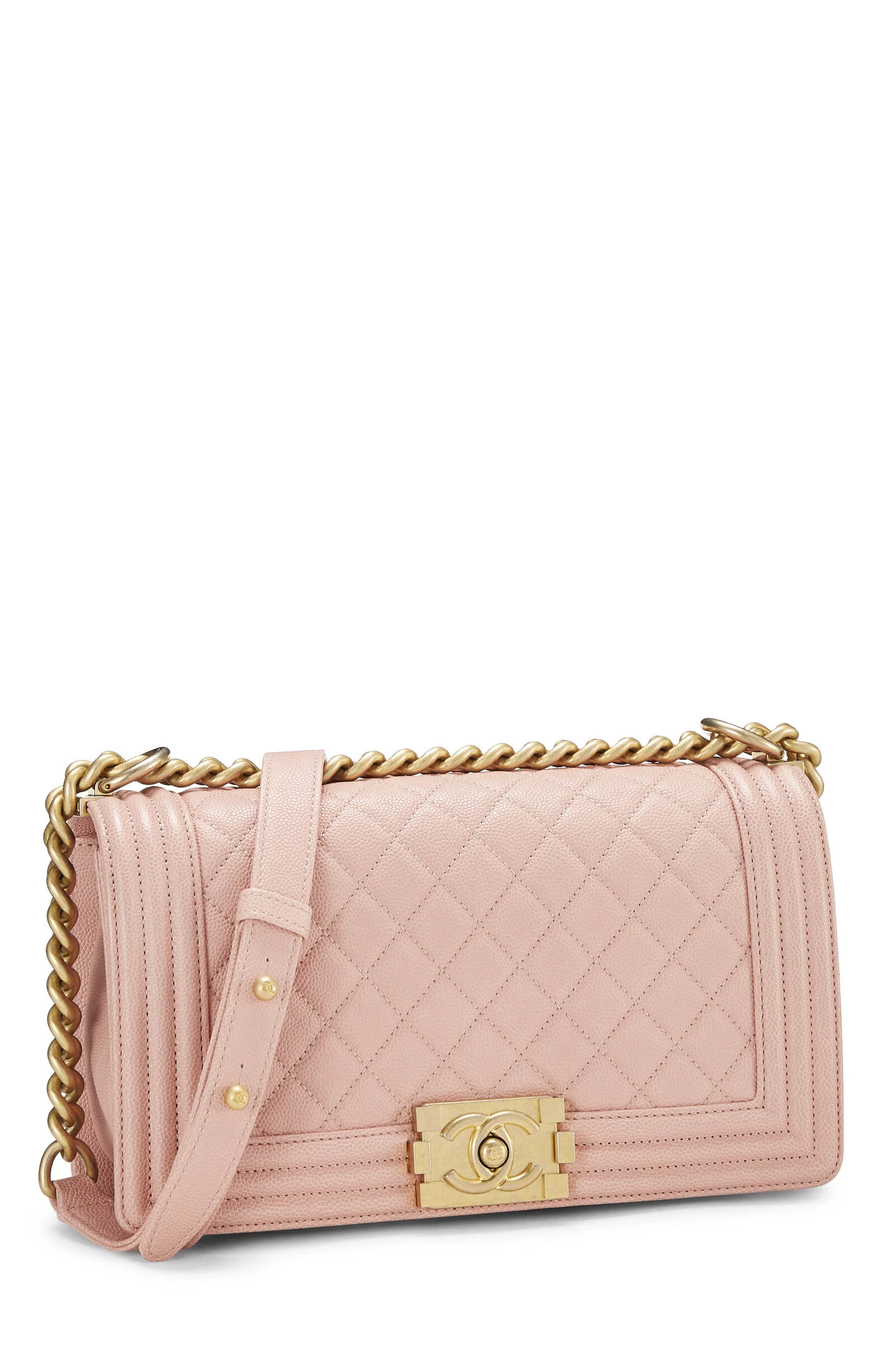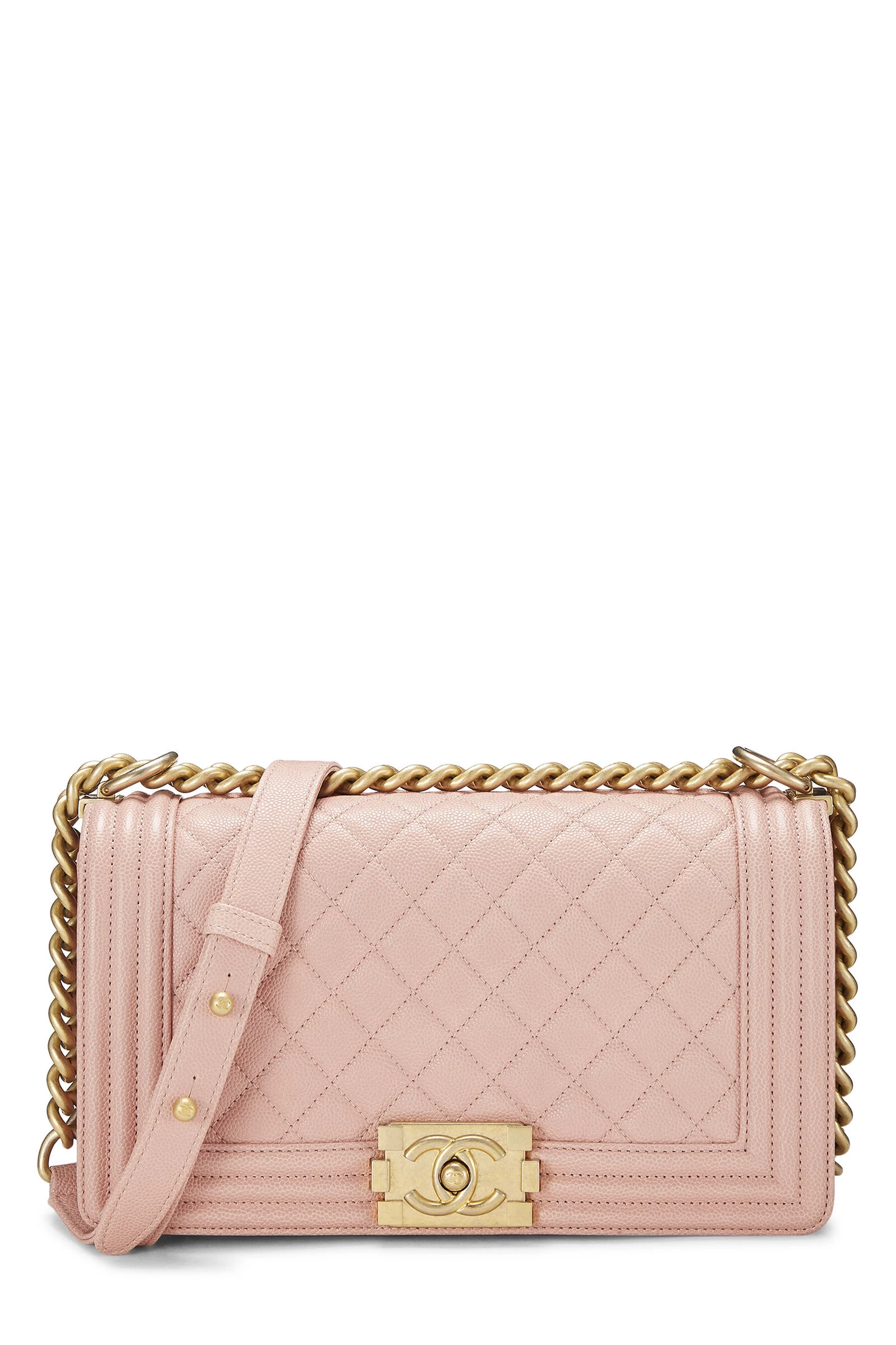A classic and timeless Chanel style, this iconic medium Boy Bag is rendered in light pink diamond-quilted Caviar leather, featuring a matching tri-border trim, and finished with antiqued gold-tone metal chain-link hardware and the signature Boy push-lock closure.