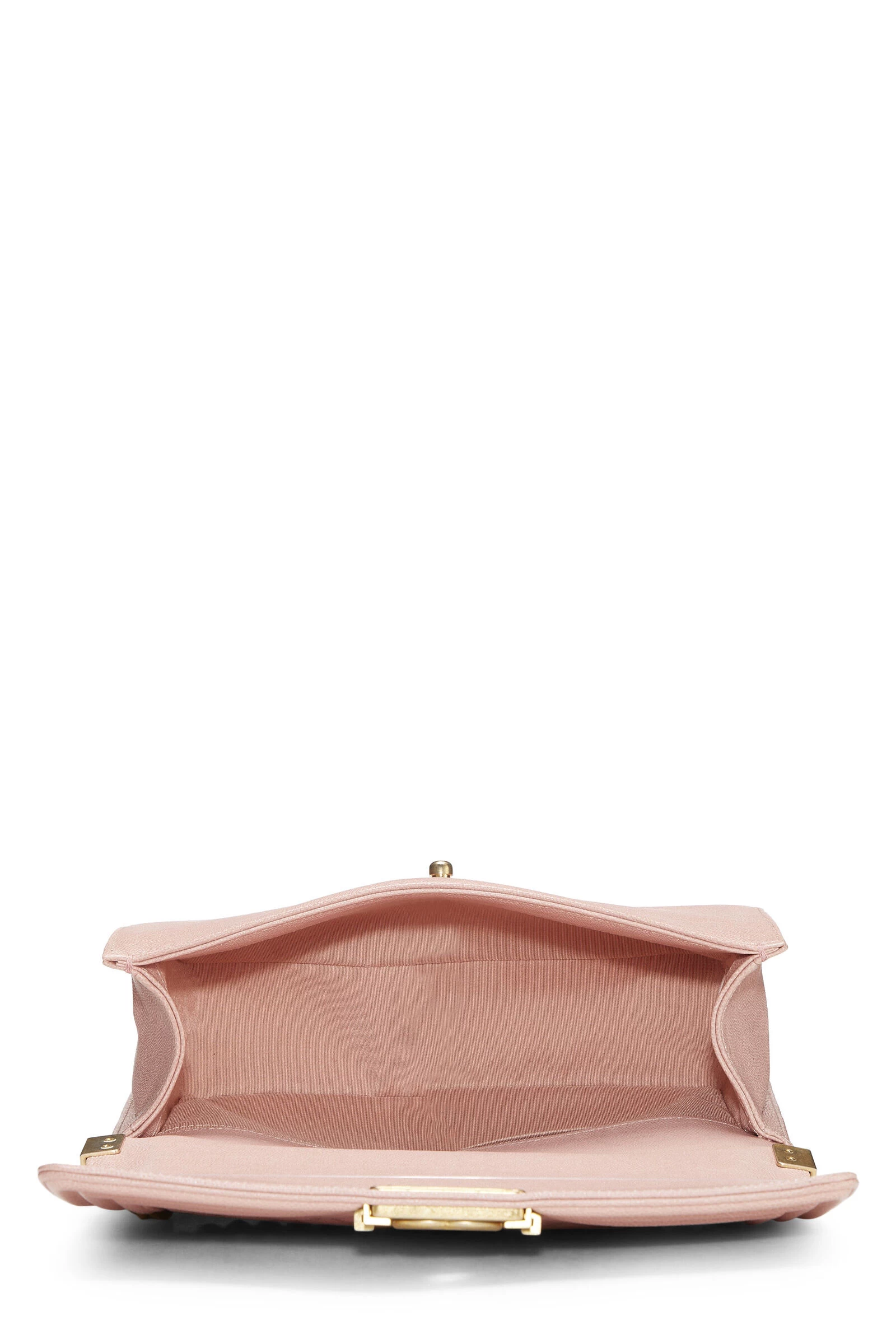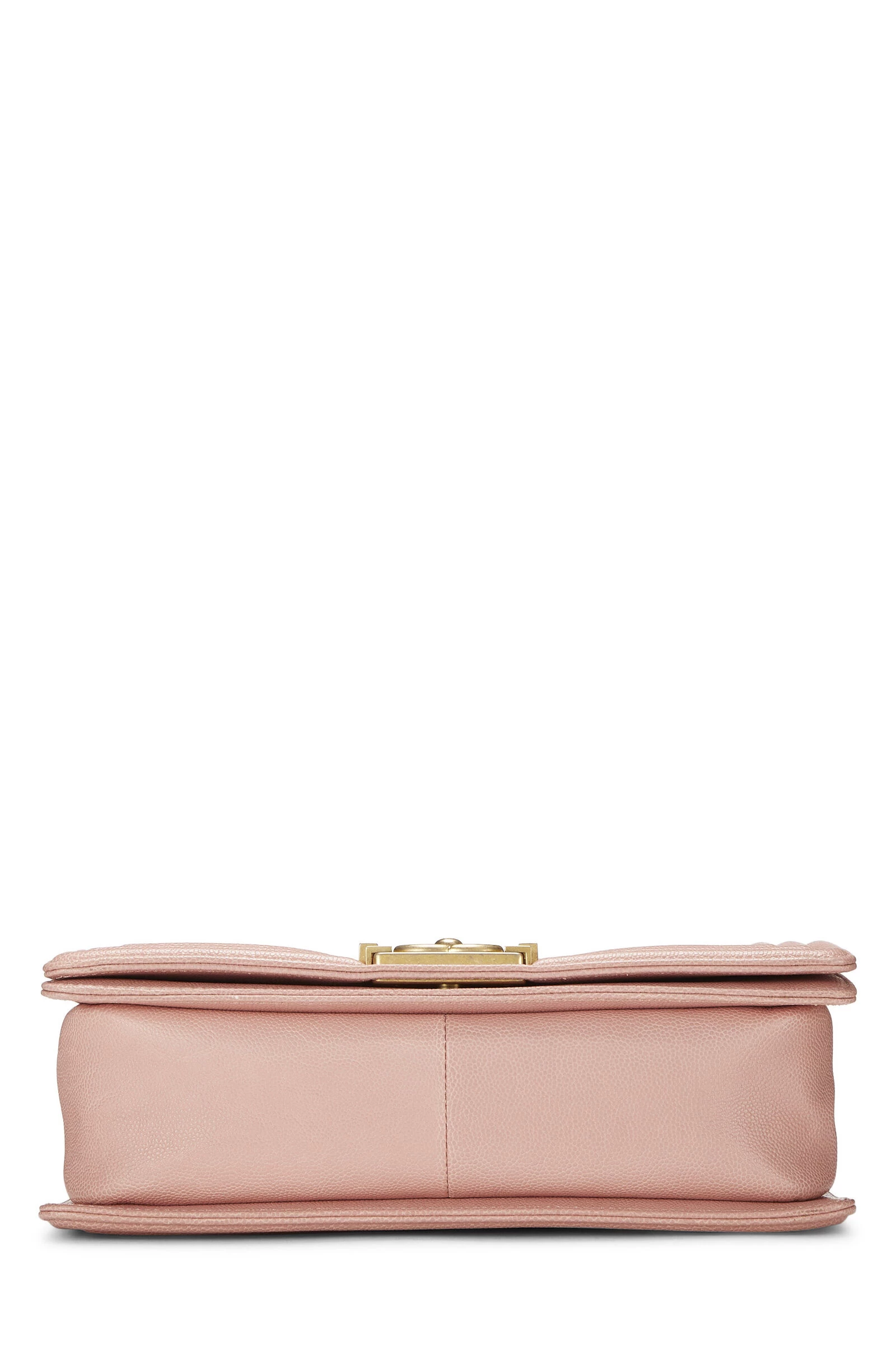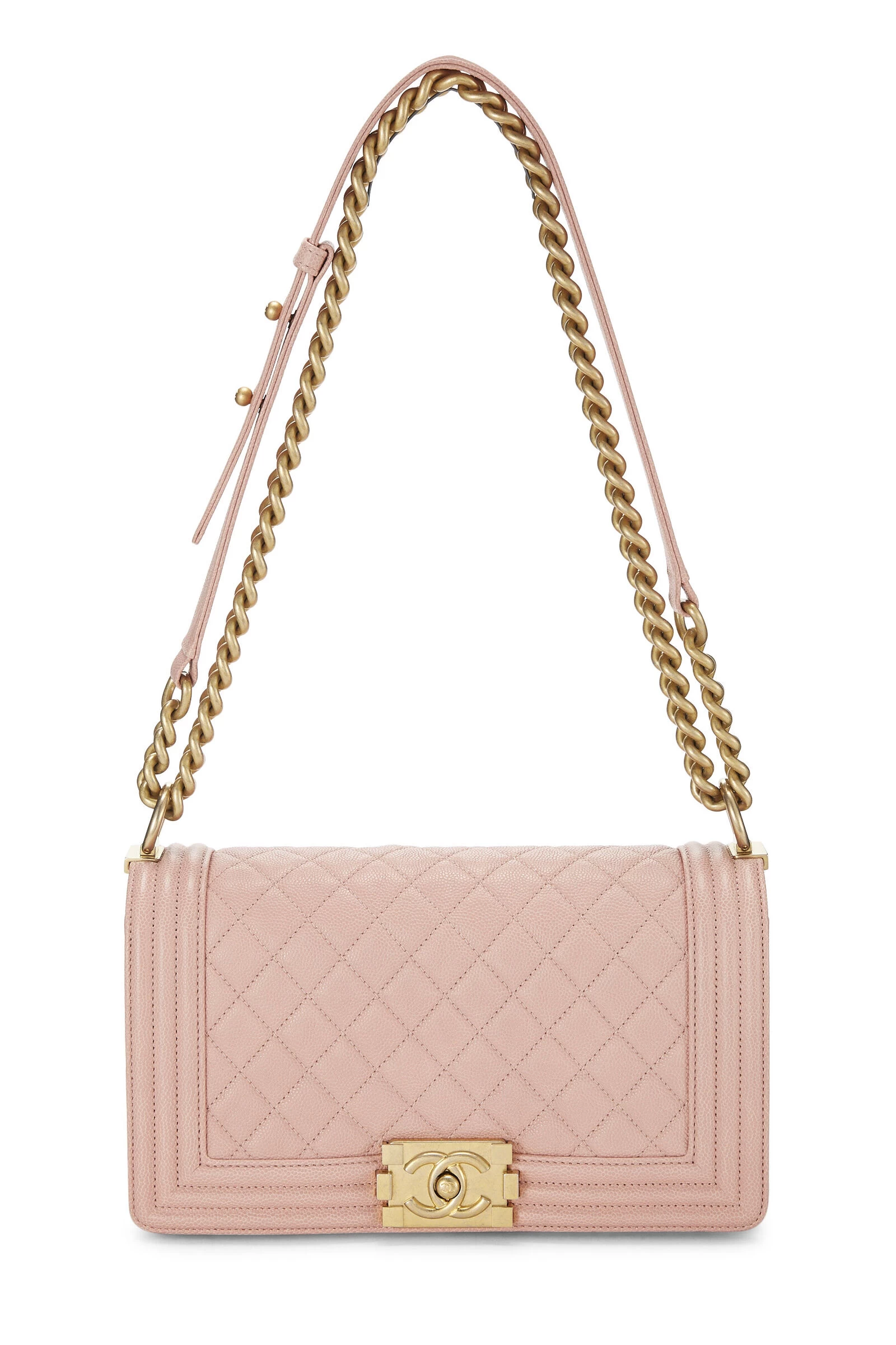 A classic and timeless Chanel style, this iconic medium Boy Bag is rendered in light pink diamond-quilted Caviar leather, featuring a matching tri-border trim, and finished with antiqued gold-tone metal chain-link hardware and the signature Boy push-lock closure.