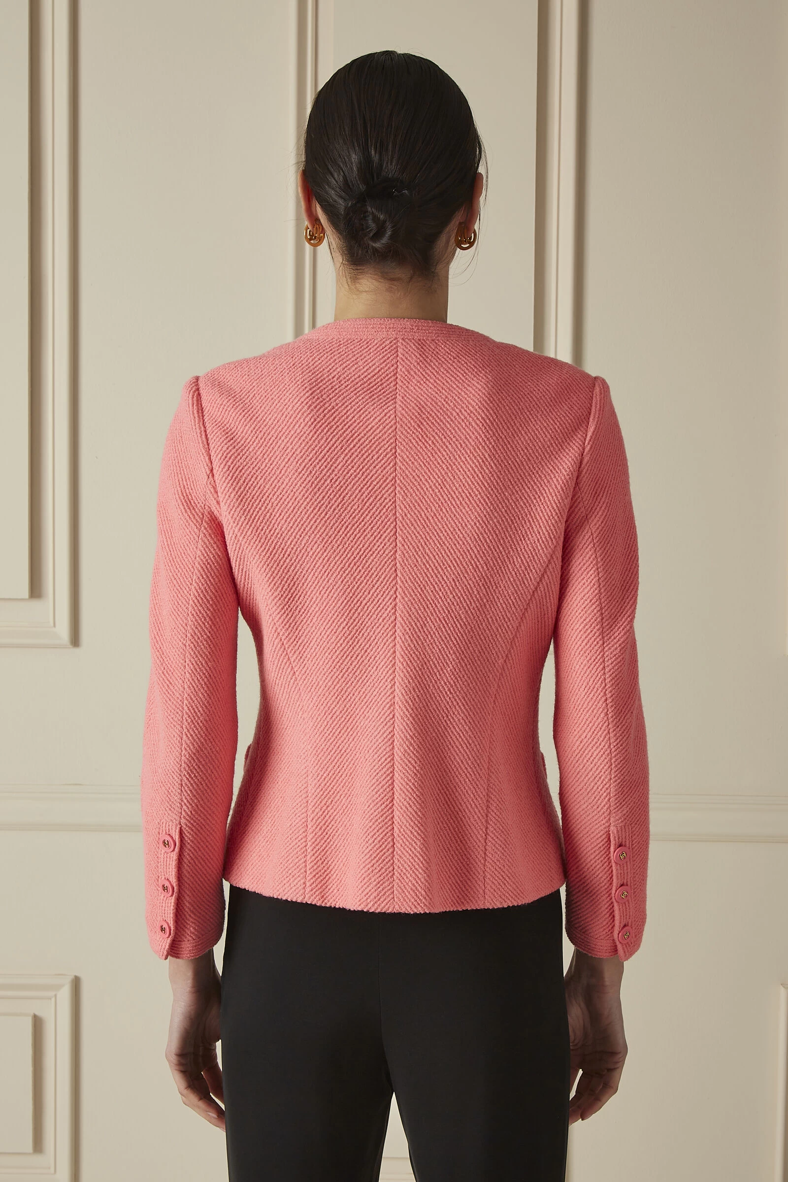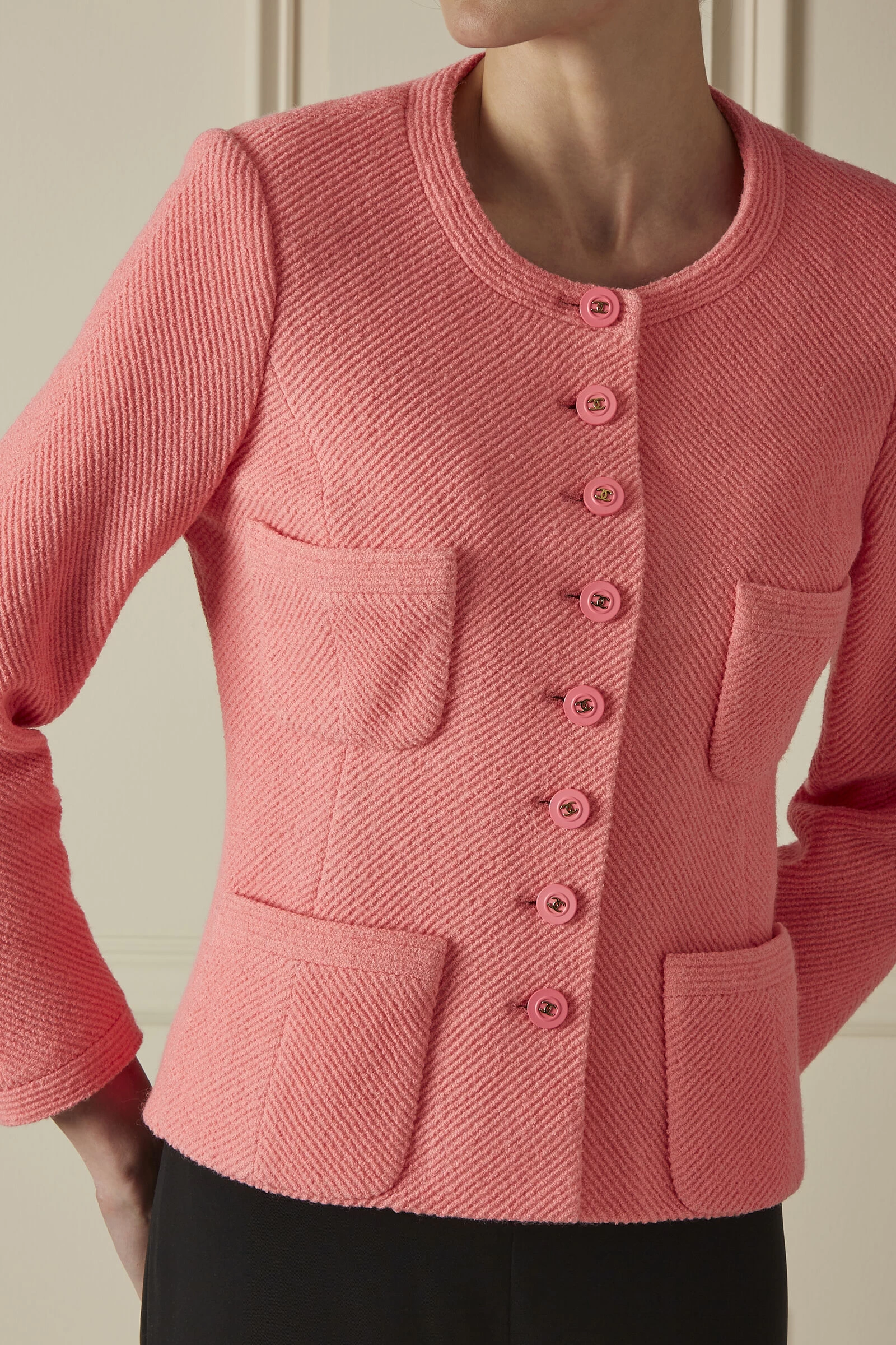 Infuse a mood-boosting pop of color into your look with this bright pink Chanel button-down jacket, crafted from a luxe wool blend tweed and lined with a stretchy silk blend for utmost comfort. With a classic collarless crewneck, this stylish jacket is accented with matching pink and gold-tone ‘CC’ buttons for a playful, yet polished finish, while four front pockets add to the jacket’s functionality.