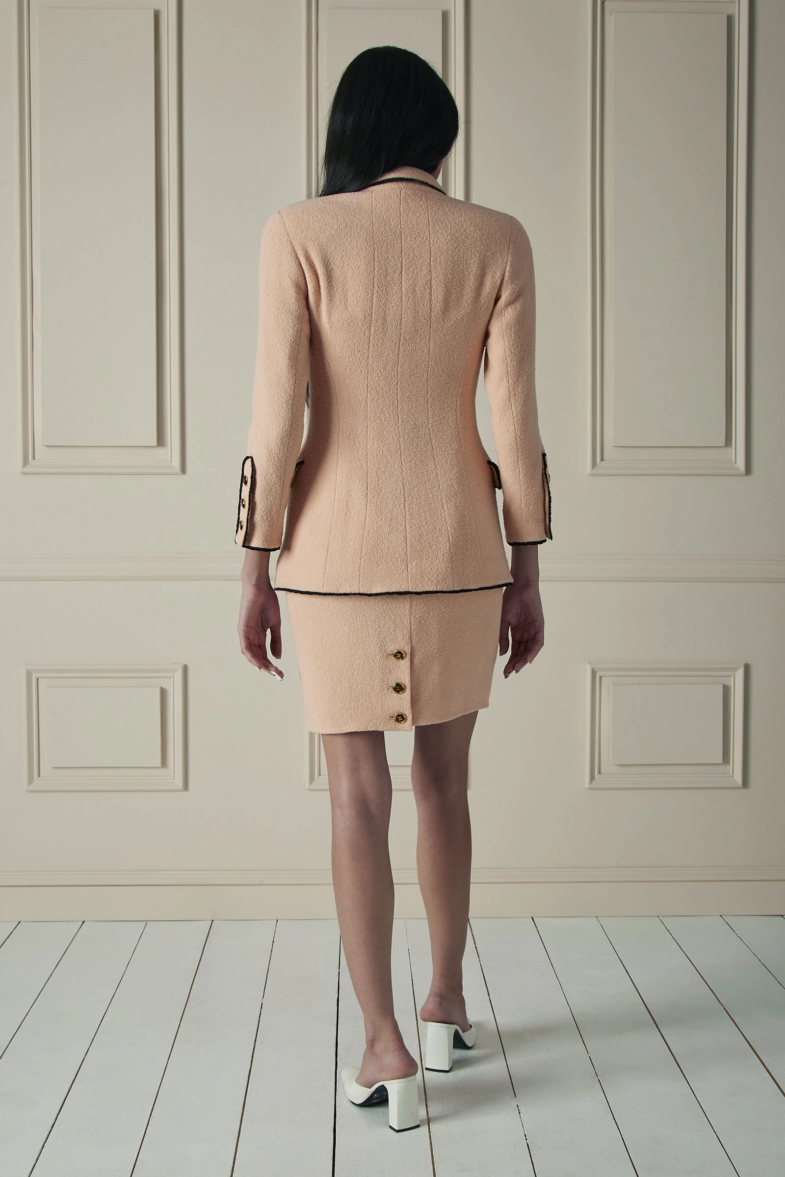 Classic yet striking, this 1994 Chanel pastel pink skirt suit set is crafted from the house’s signature luxe wool-blend tweed. The jacket is elegantly styled with a notch collar, four functional flap pockets, and contrasting, delicate black ruffle trimmings for an elevated and feminine look. Accented with black and gold ‘CC’ buttons for an ornate touch of shine, this staple skirt suit set is sure to exude refined elegance.