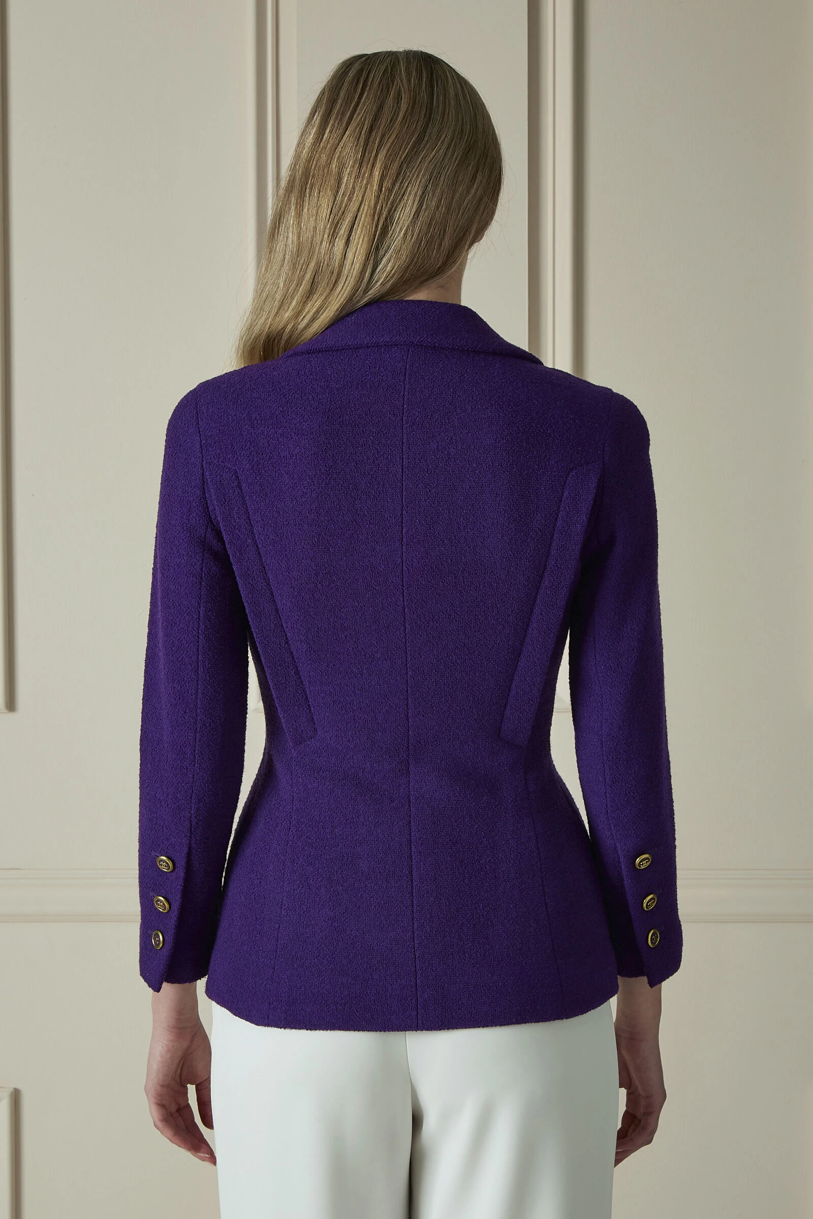 Perfect for introducing color into your wardrobe, this single-breasted jacket comes crafted from a violet purple-hued woolen blend. It’s cut with scalloped lapels, waist-cinching seams and cropped sleeves that’ll pair wonderfully with a sparkly timepiece or bracelet. Take yours from day to night, or office meetings to dinner reservations.