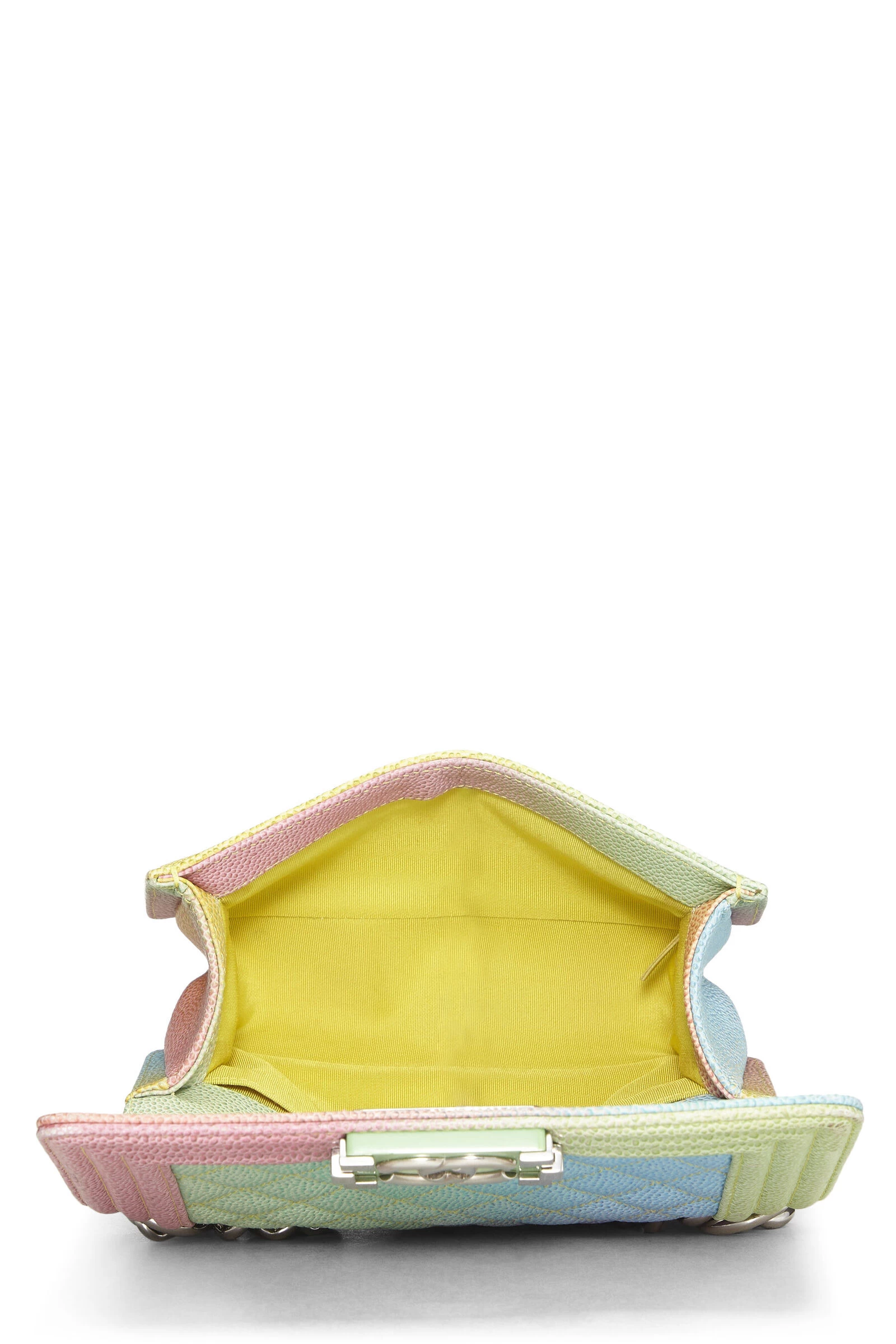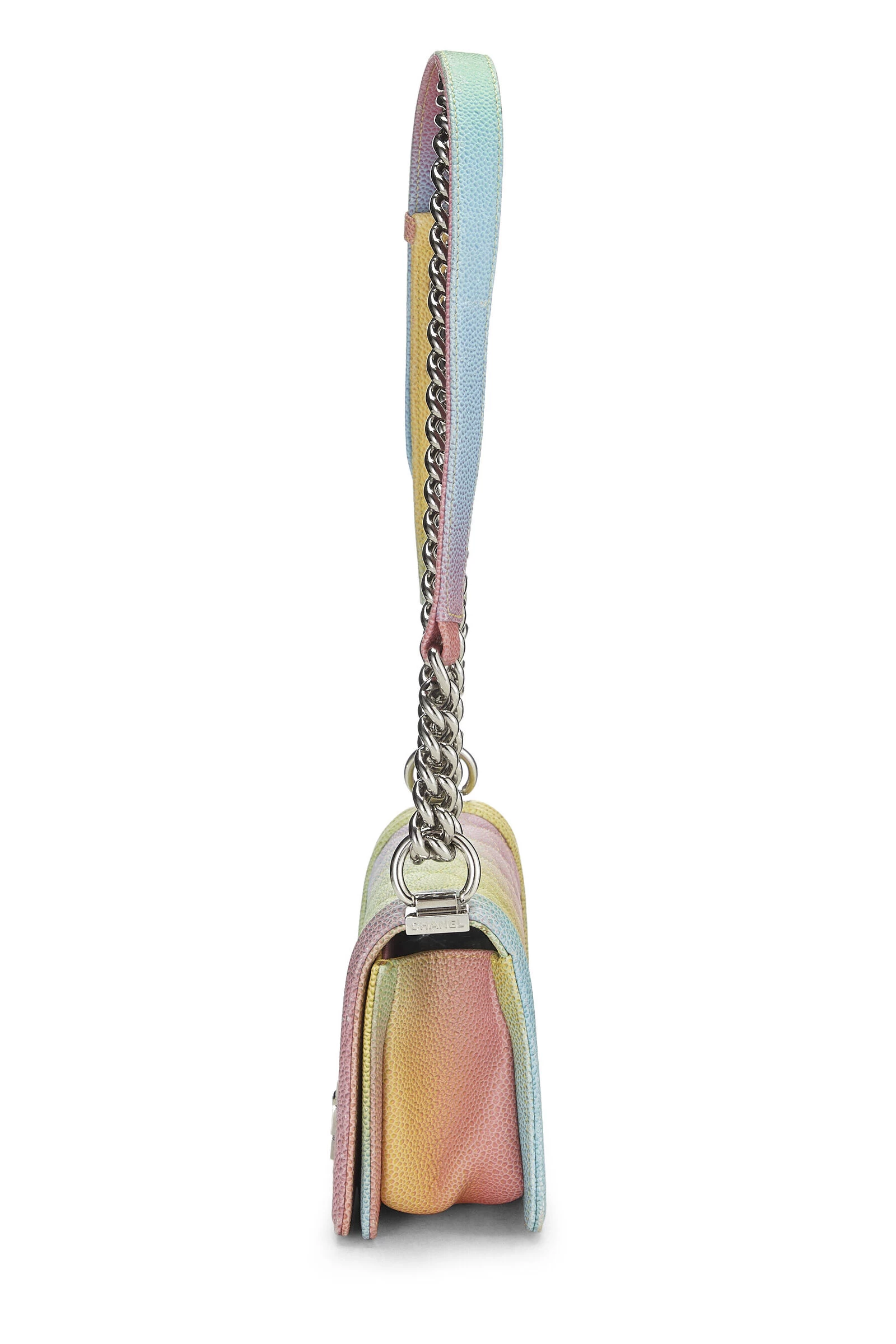 A rare and collectible version of a classic Chanel style, this small Boy bag is from the Spring/Summer 2018 collection and is crafted in a unique pastel rainbow Caviar leather, with each bag in this collection featuring a unique variant of the rainbow. Even the closure is unique- this particular clasp is rendered in green acrylic and silver-tone hardware, but throughout the collection pinks and creams can also be found.