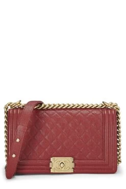 A classic and timeless Chanel style, this medium Boy bag is crafted in red grained Caviar leather with signature diamond quilting, featuring tri-border trim and finished in antiqued gold-tone metal hardware.