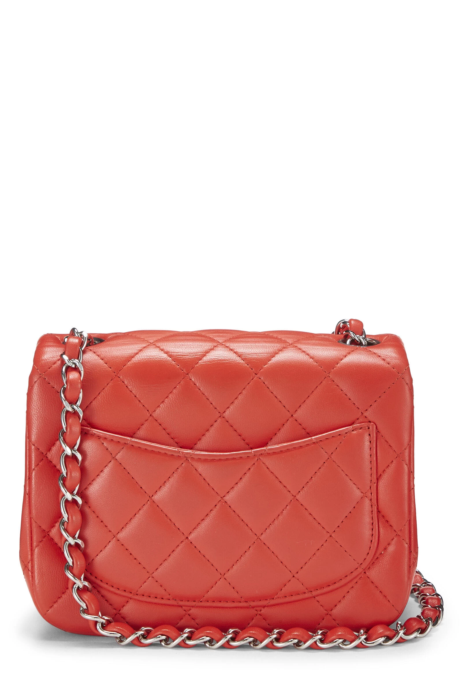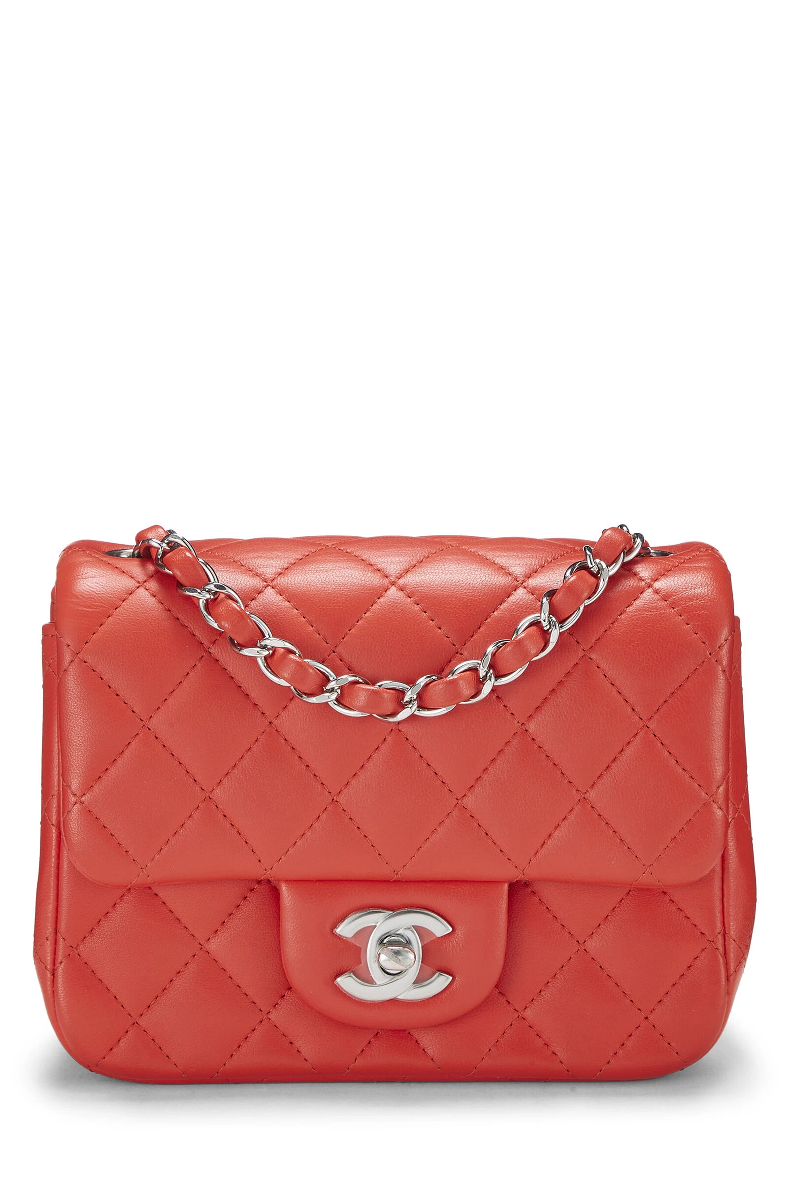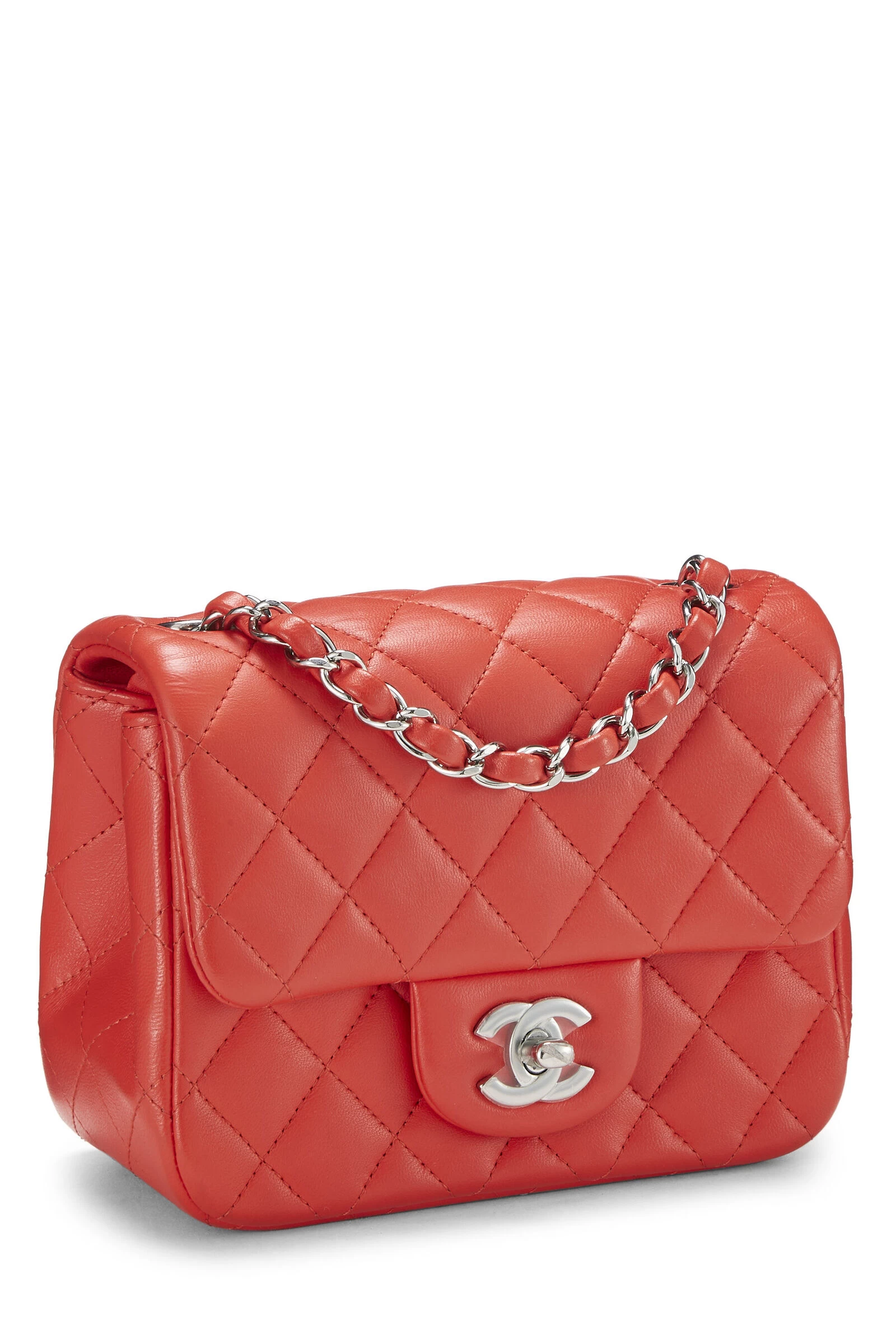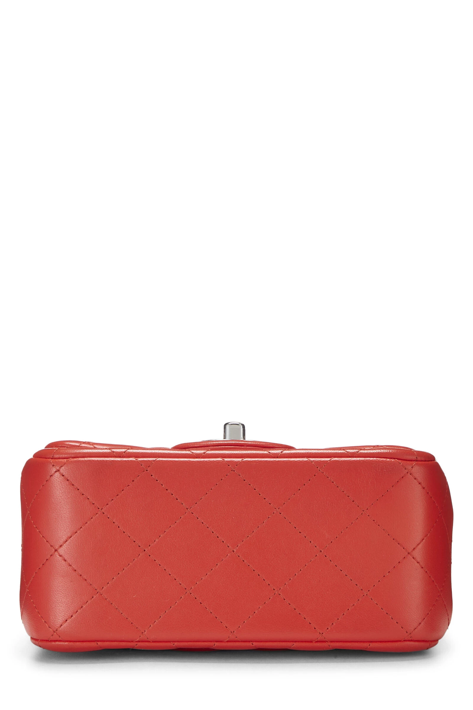 Iconic Chanel mini Flap bag, featured here in the square version, crafted in red lambskin with signature diamond quilting throughout and finished with silver-tone hardware.