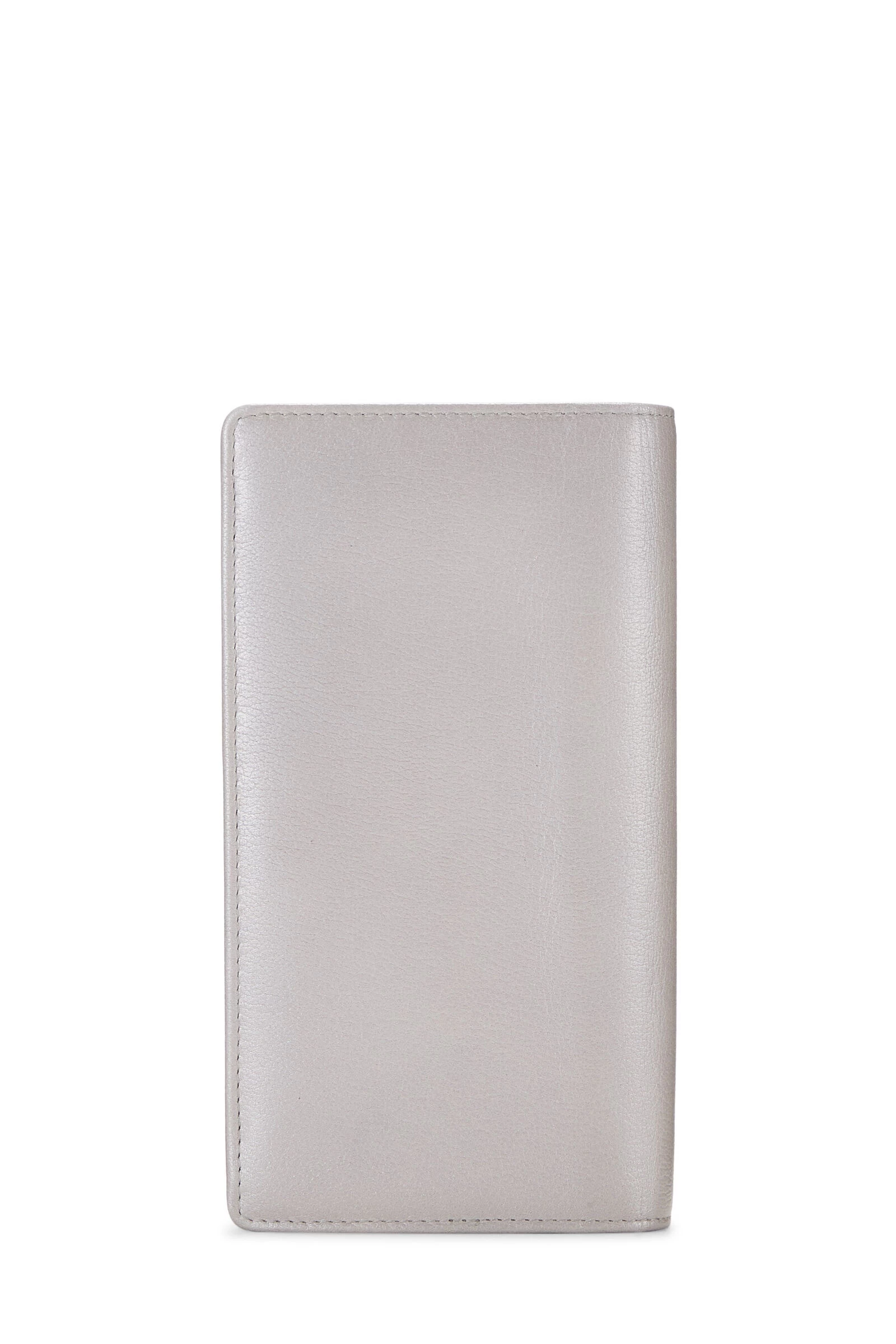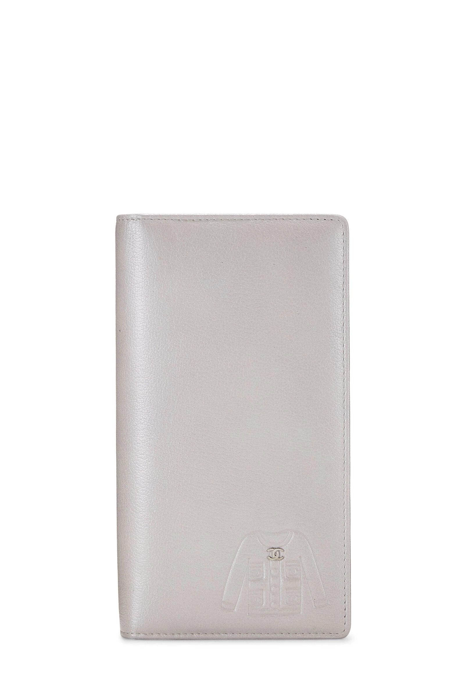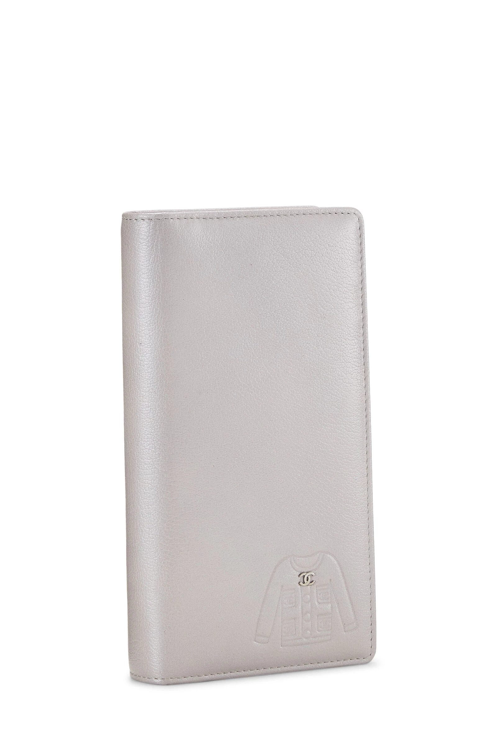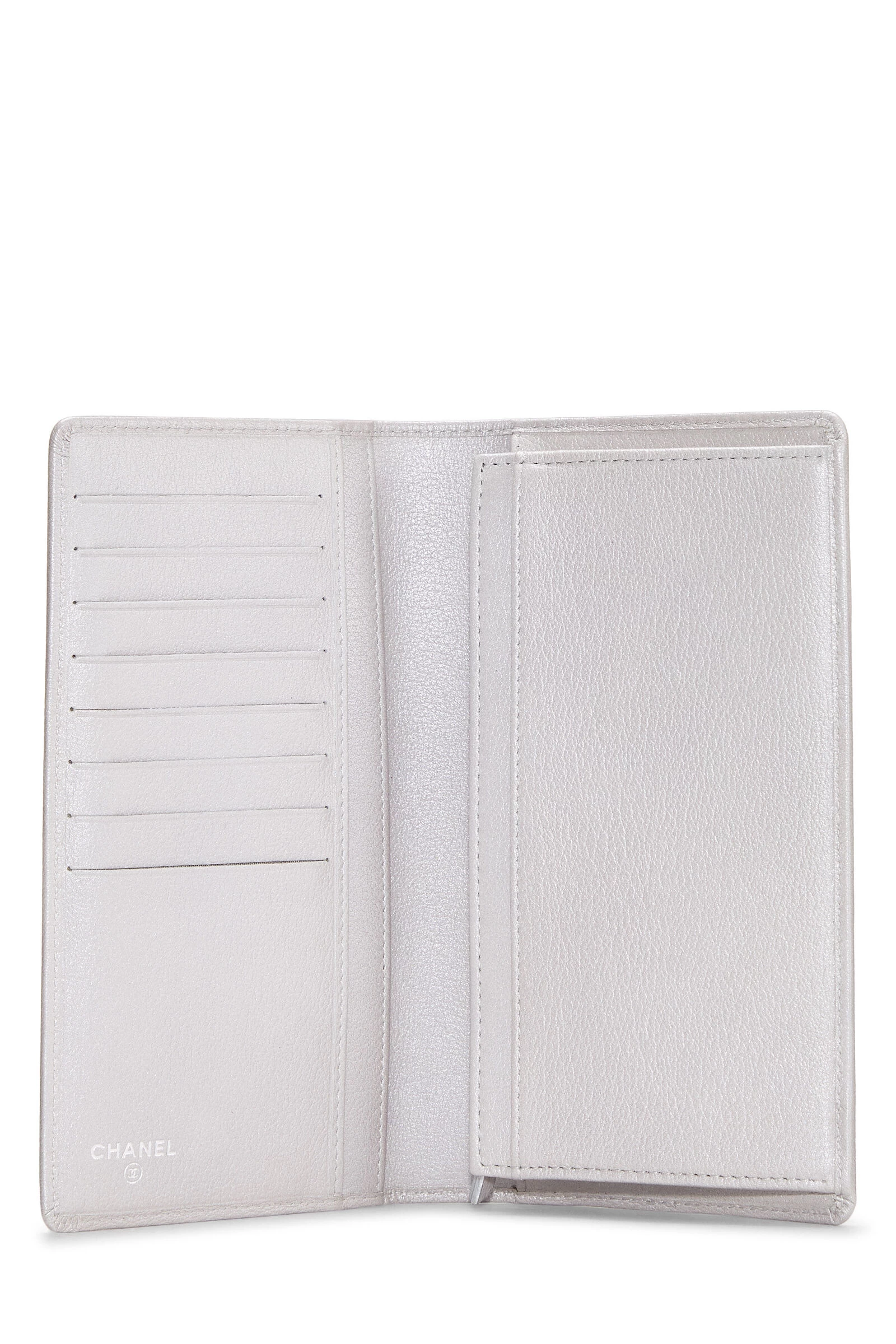 Classic Chanel long wallet from the rendered in silver calfskin leather with silver-tone ‘CC’ logo hardware and debossed brand motif.