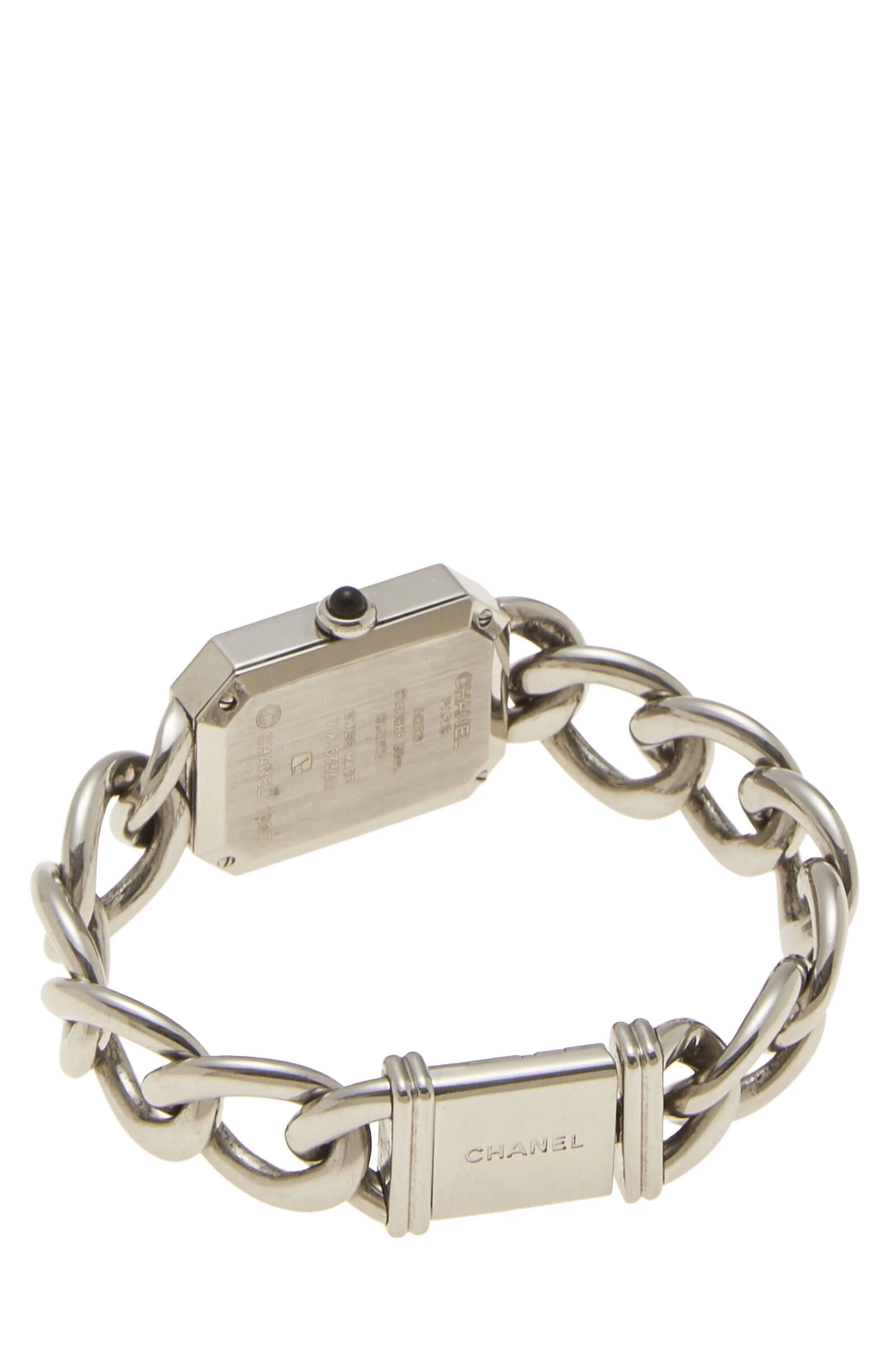 Sleek and classic, this vintage medium Chanel Premiere Watch is crafted from silver-plated hardware, featuring Quartz movement and a black octagonal watch face that references the iconic N°5 perfume bottle. This piece is finished with a chain link wrist band.