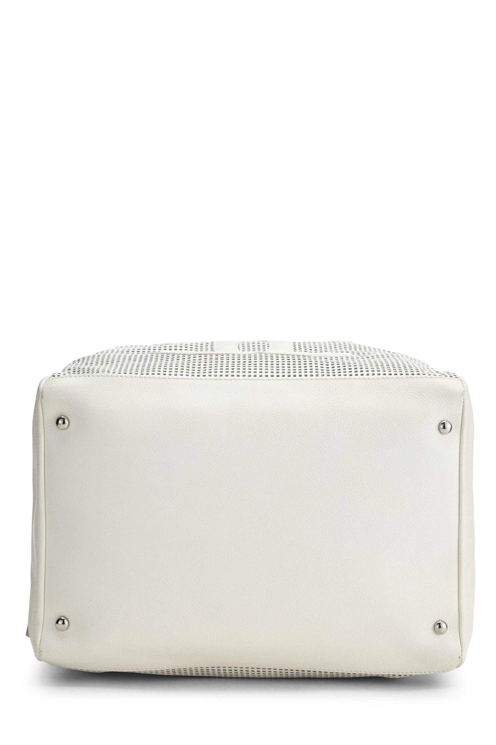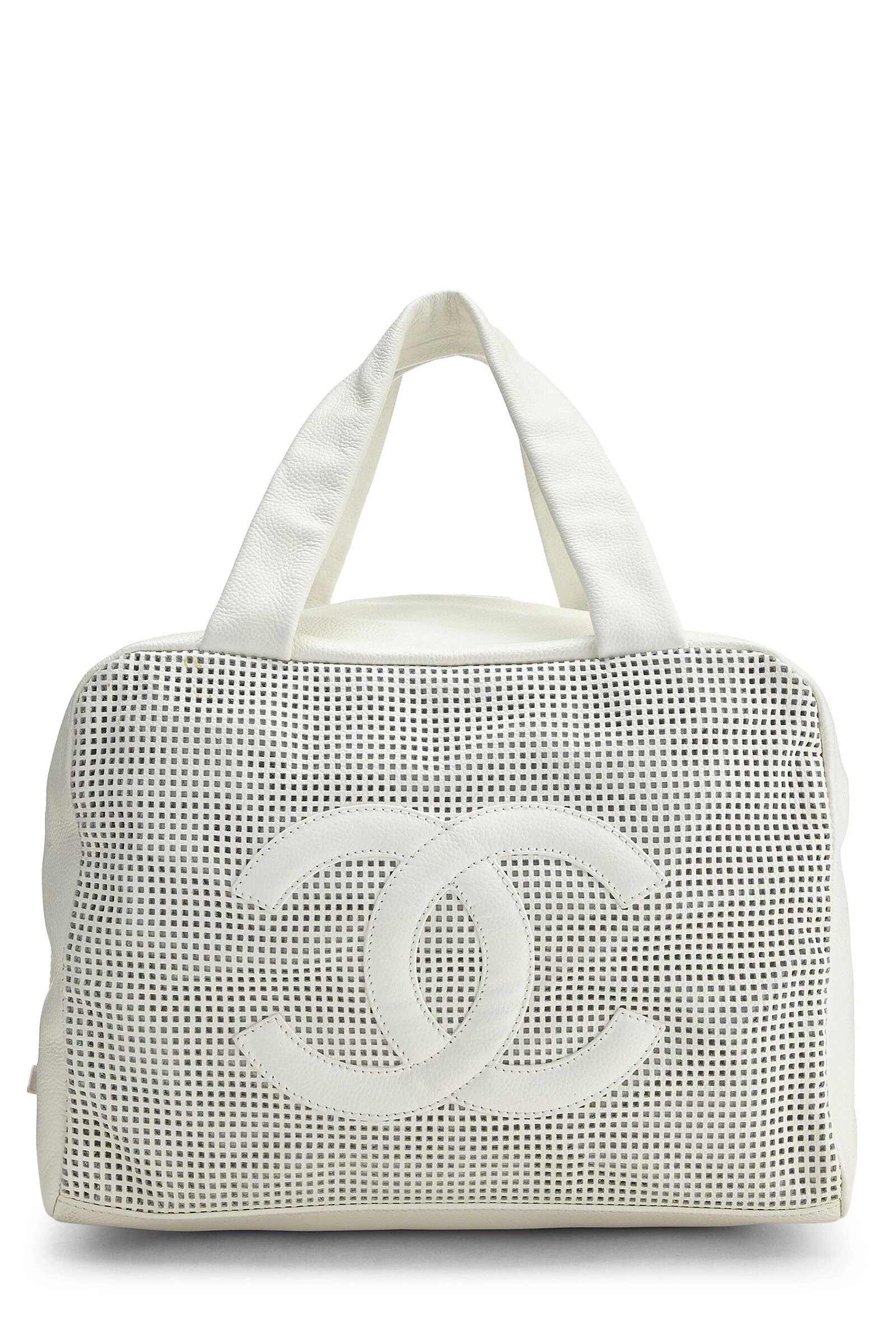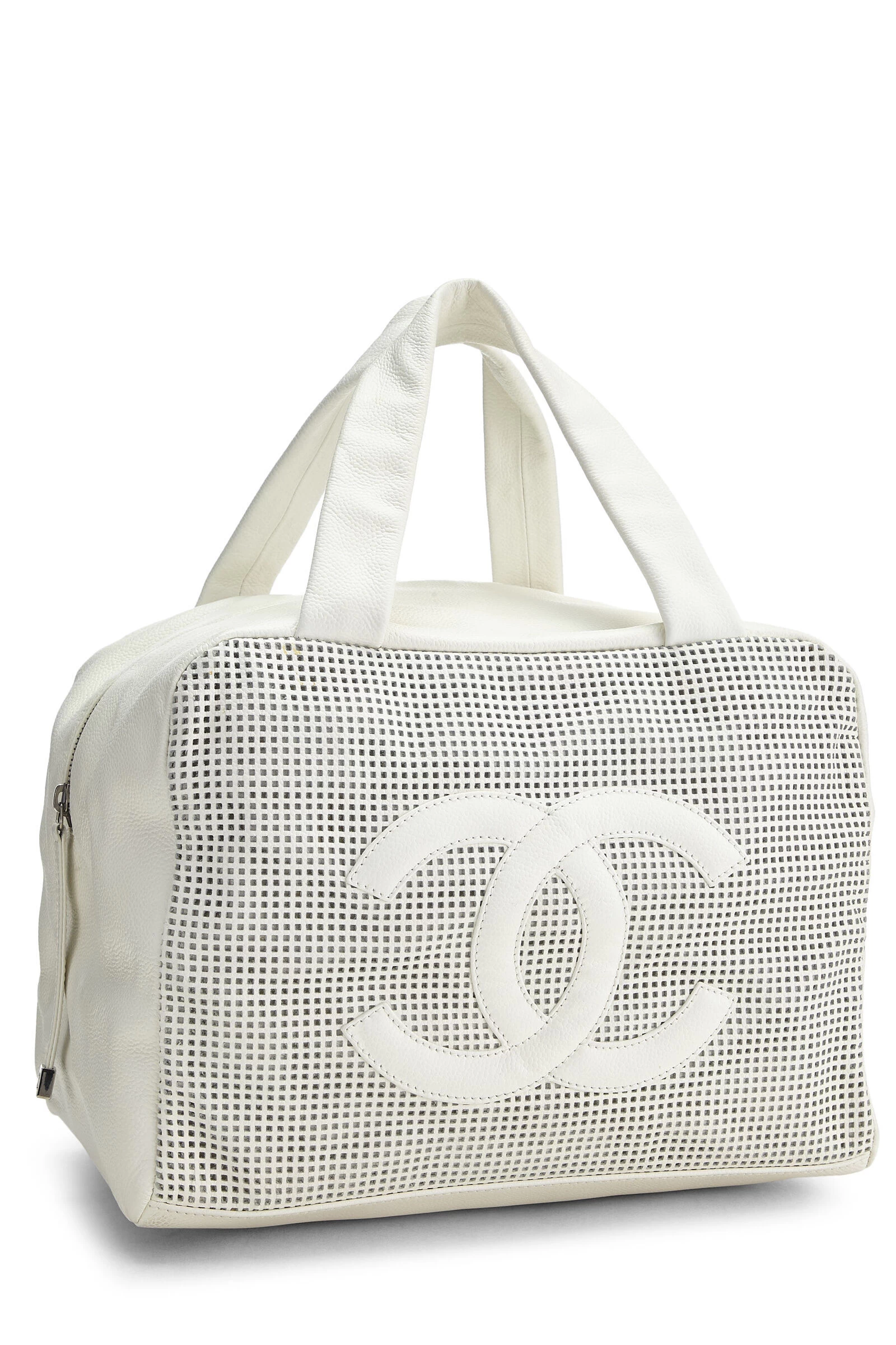 Early 2000s Chanel classic Bowler bag crafted in perforated white leather with ‘CC’ logo appliqué on the front, finished with silver-tone hardware.