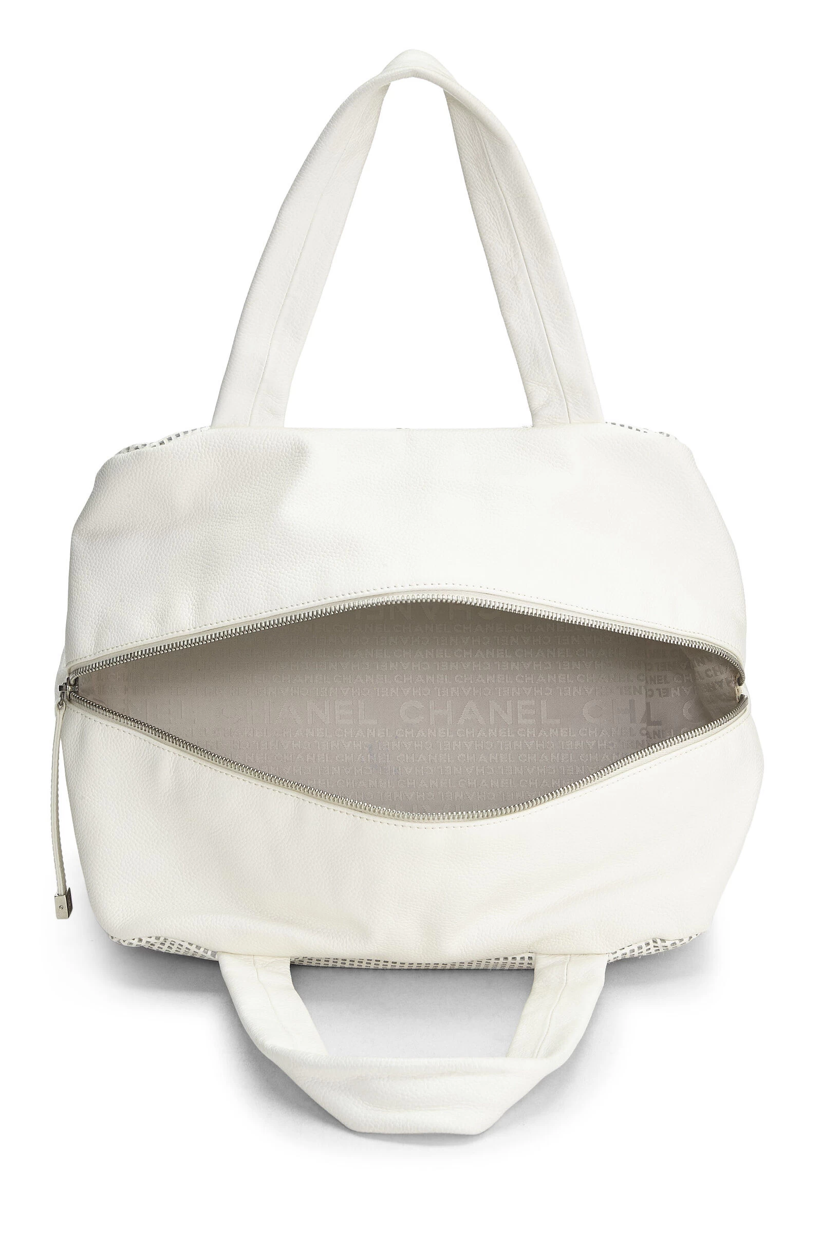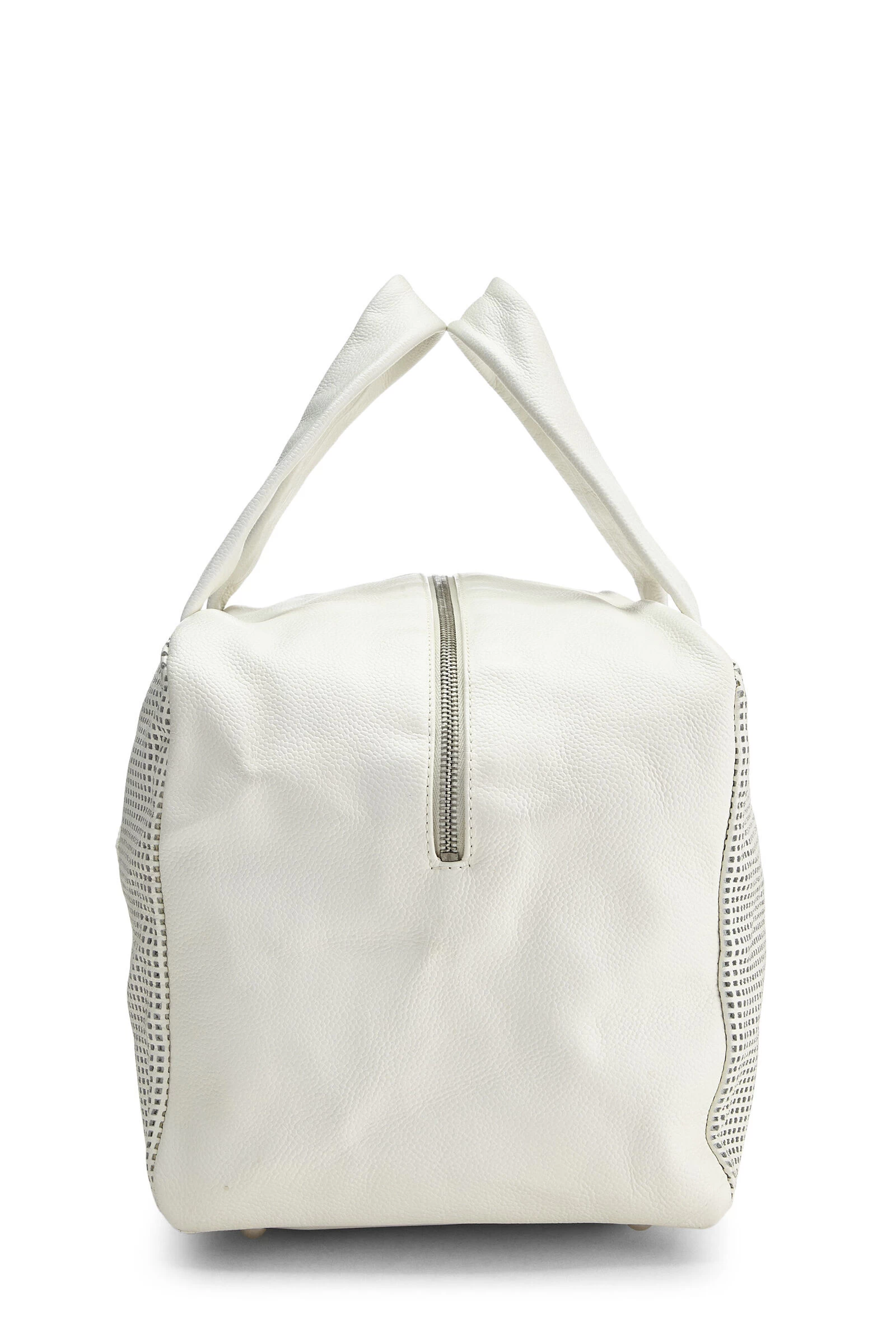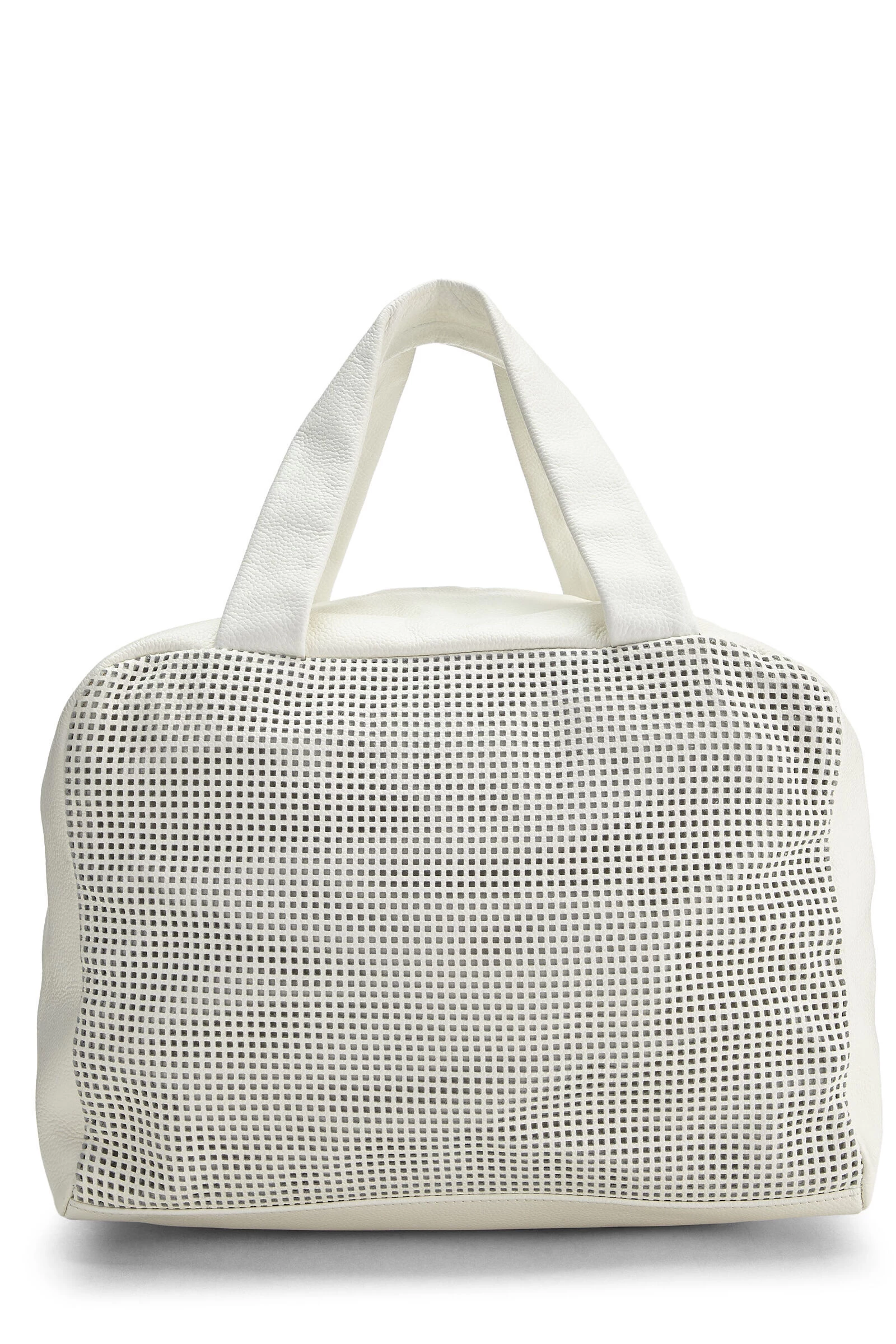 Early 2000s Chanel classic Bowler bag crafted in perforated white leather with ‘CC’ logo appliqué on the front, finished with silver-tone hardware.