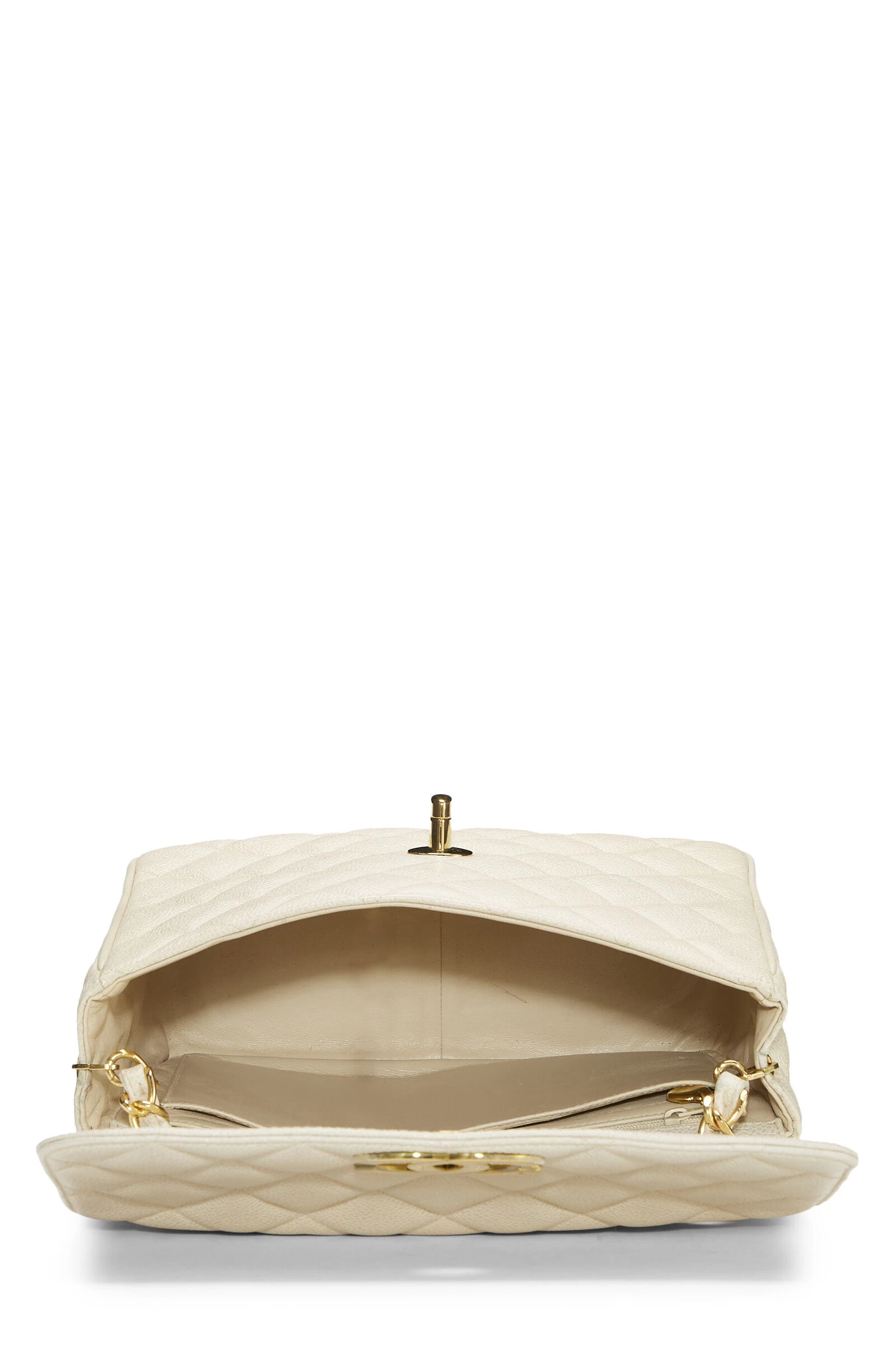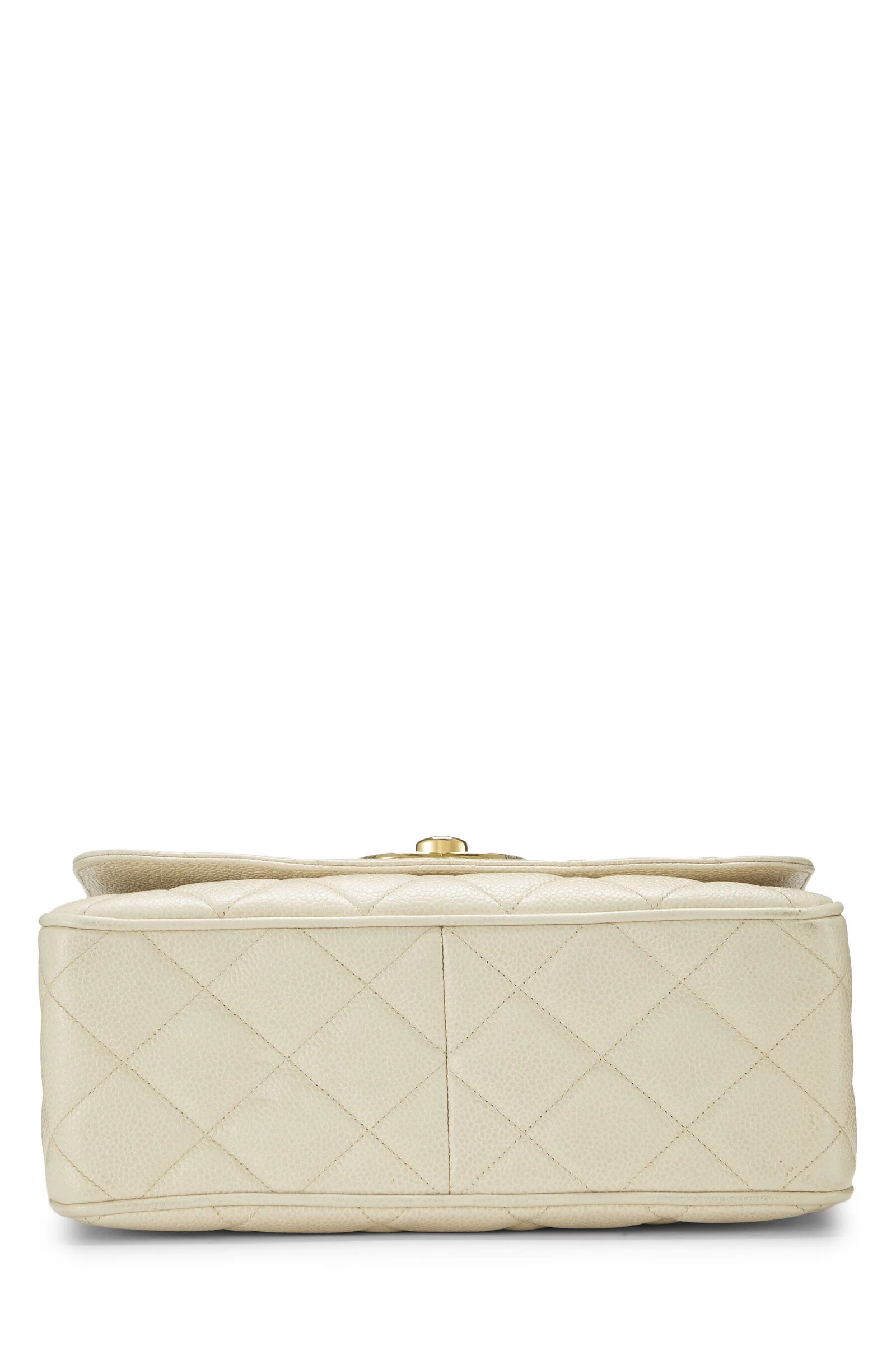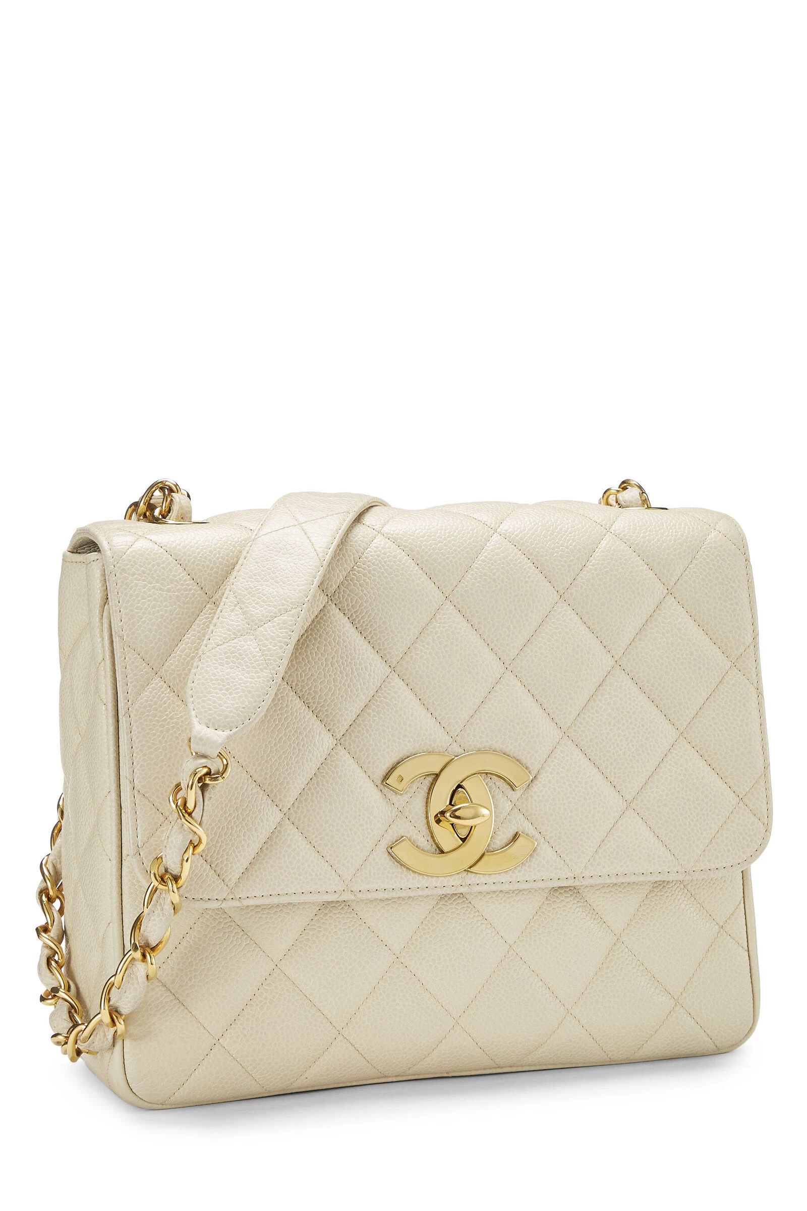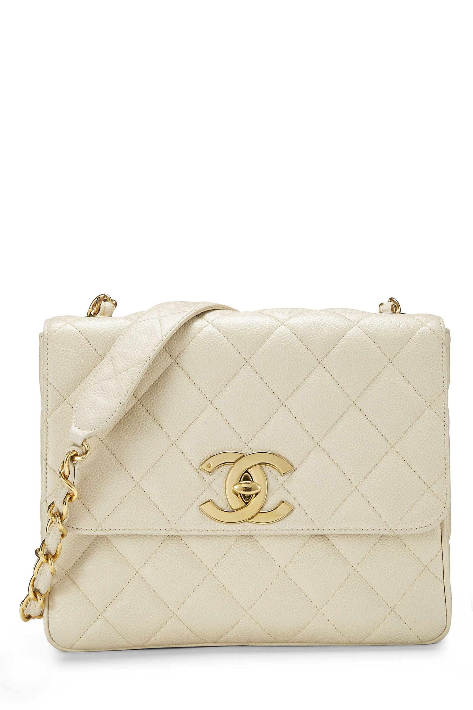 Vintage mid-90s Chanel square Flap bag crafted in white grained Caviar leather, featuring a big ‘CC’ logo closure rendered in gold-plated metal.