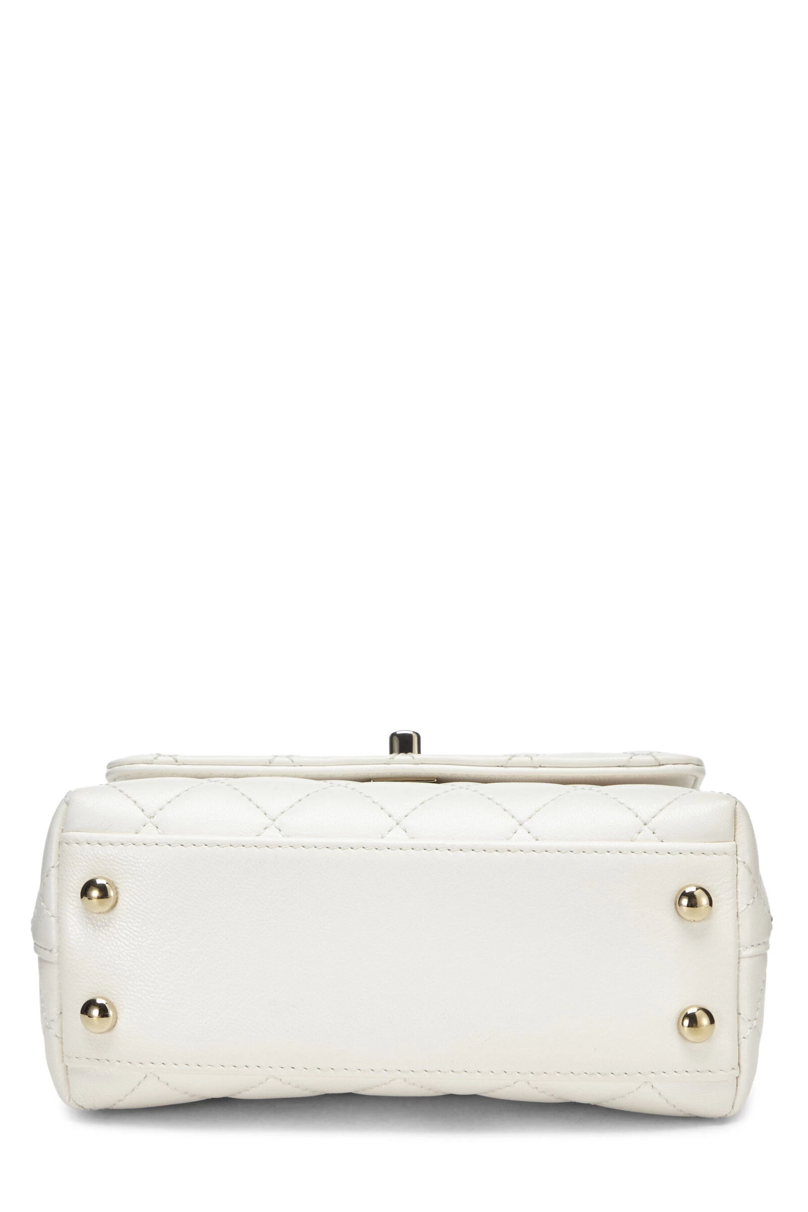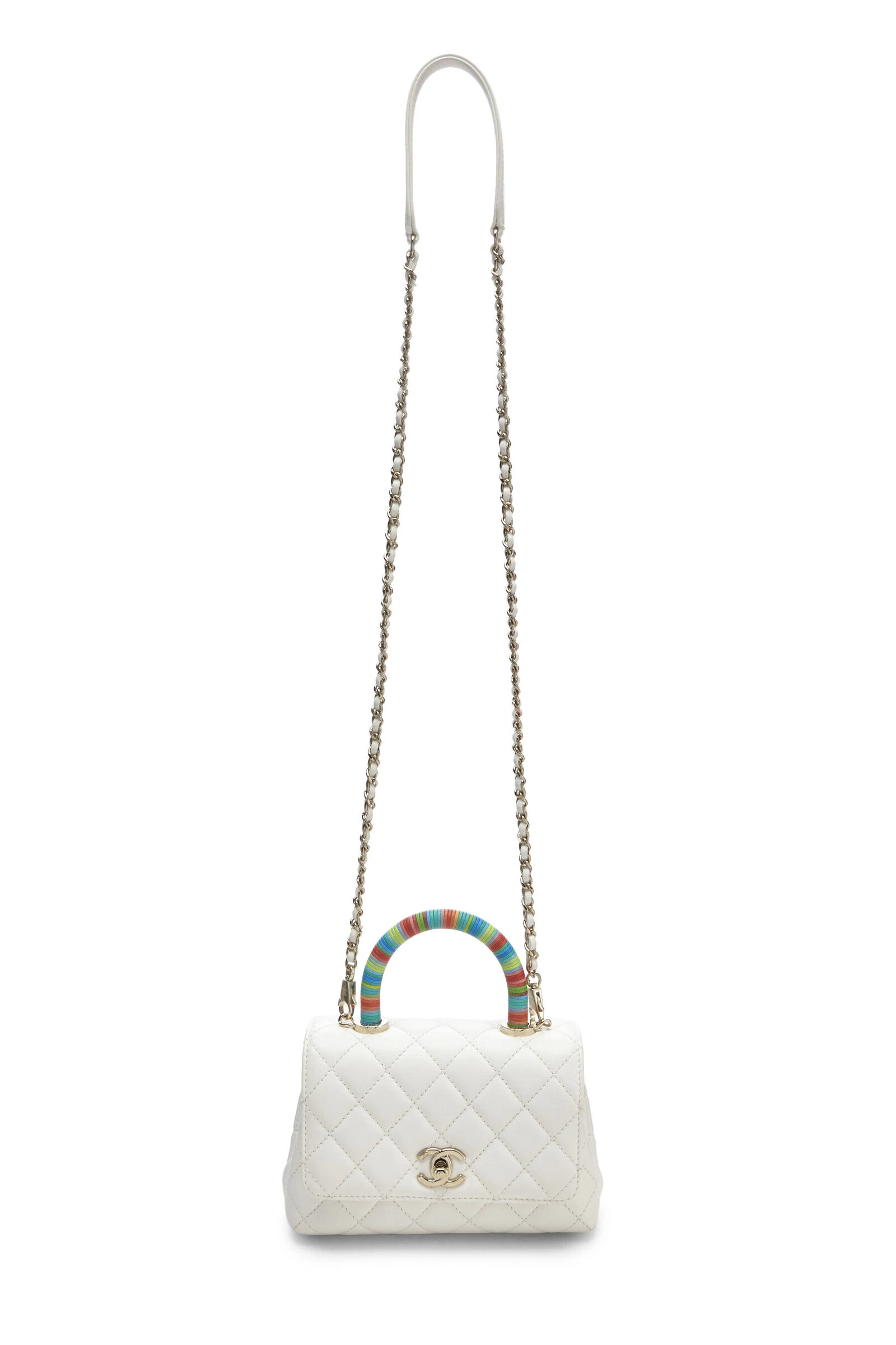 A subtle dose of color for the modest dresser, this ultra-petite Coco Handle Bag comes rendered in white quilted lambskin leather with a rainbow top handle that’ll breathe life into any look you pair it with. It’s embellished with gold-tone hardware, including the maison’s signature ‘CC’ turn-lock closure on the flap. It opens to reveal a candy-pink leather interior that’ll comfortably house your must-have cargo. Take yours from day to night with the addition of the leather-threaded chain shoulder strap and your favorite lip stain. Exterior pocket for quick-access storage.