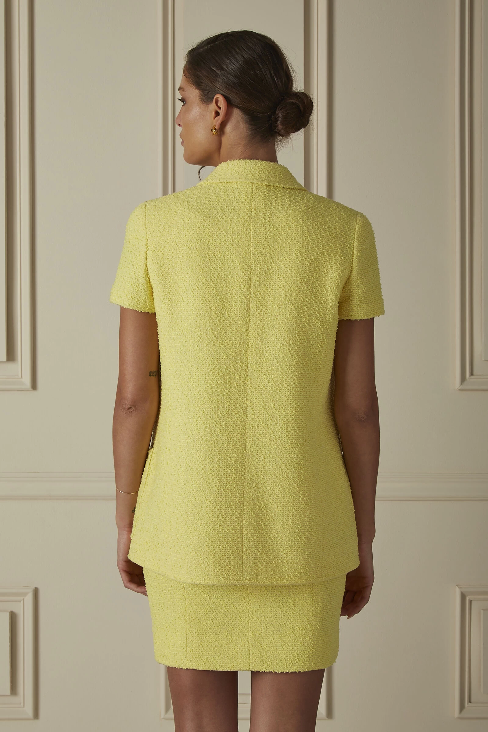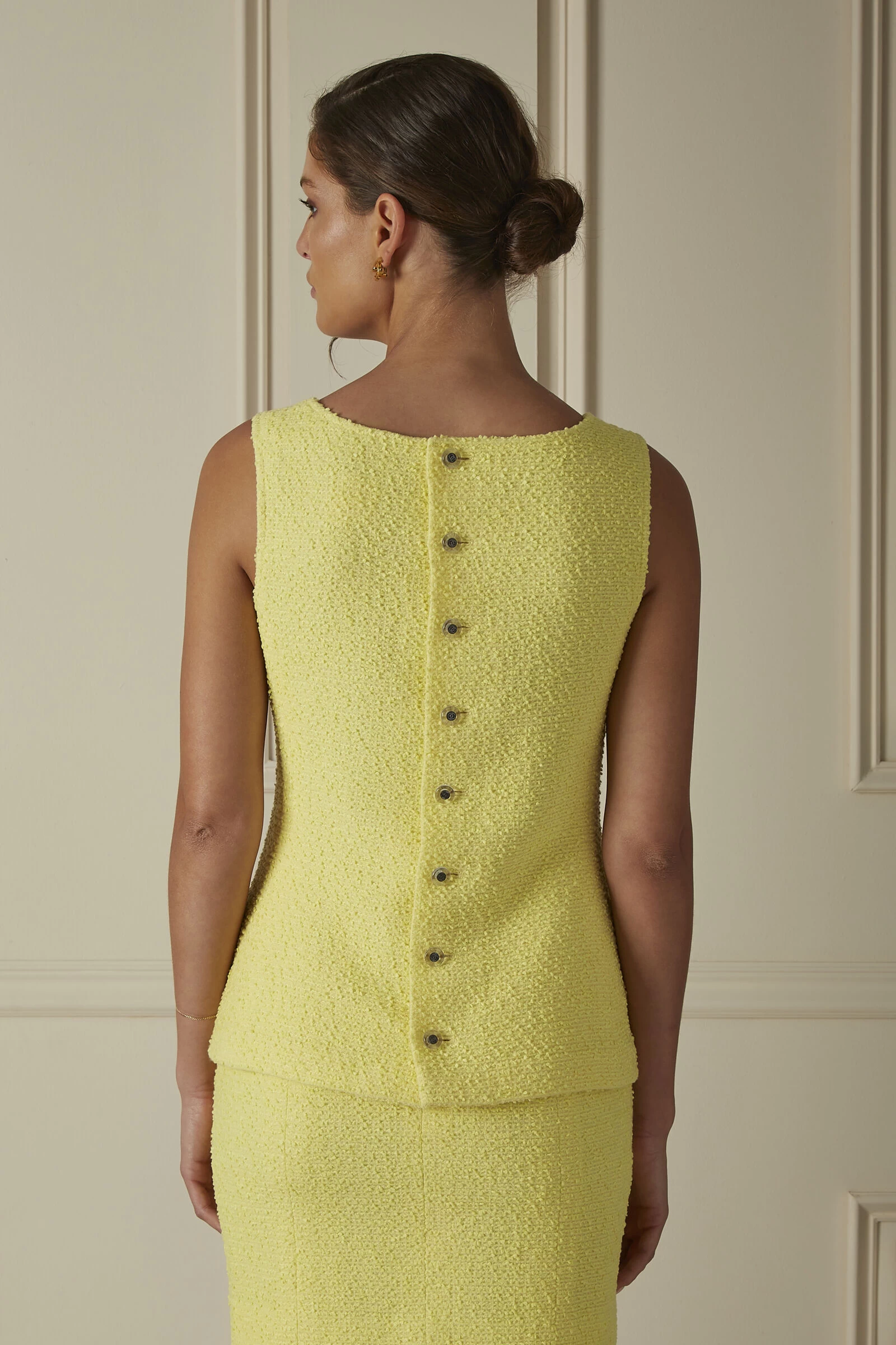 A chic and rare vintage three-piece set from Chanel’s 1997 Cruise collection, this skirt set is crafted in an eye-catching, radiant pastel yellow wool blend tweed. Entirely lined with tonal silk, this set includes a short-sleeved open jacket with a classic notch collar and two patch pockets, a sleeveless top with a button-down back, and a flattering fitted mini skirt. A stylish outfit for the spring and summer, the top and jacket are finished with clear and gunmetal-tone round ‘CC’ buttons for added shine.