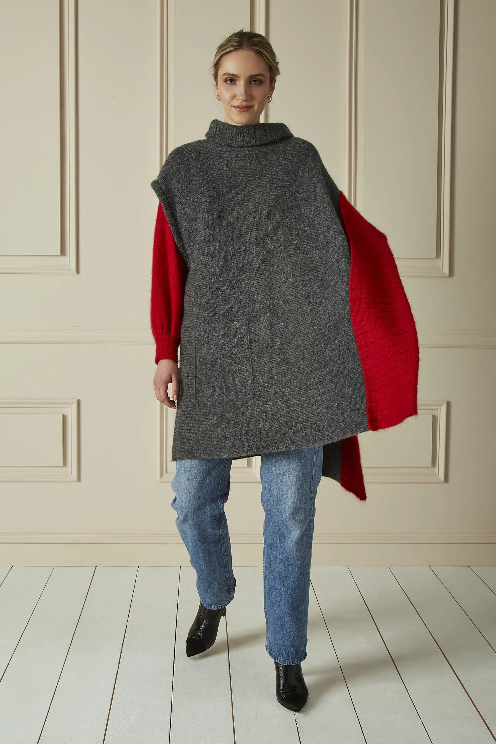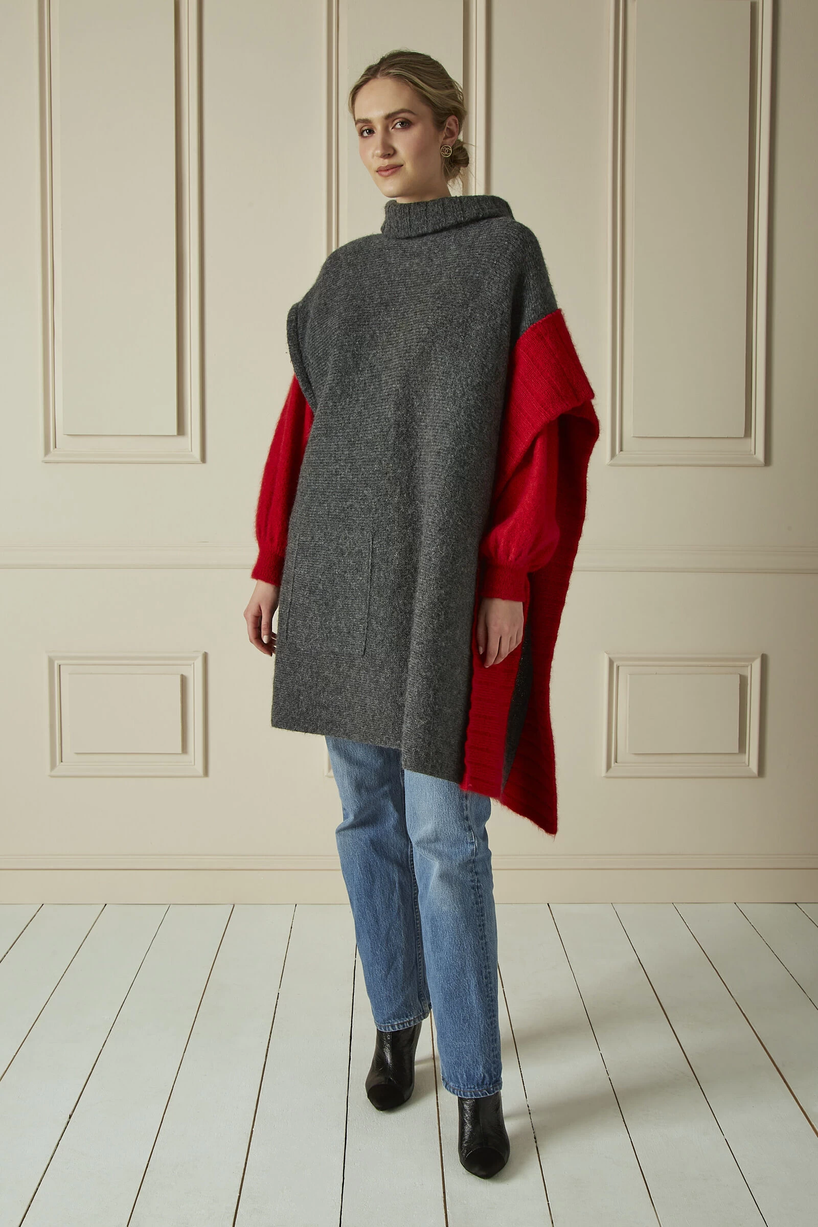 A unique Chloé sweater dress set, this layered look is crafted in a contrasting colorblocked gray and red mohair blend. With a comfortable stretch that’s perfect for on-the-go wear, this luxe, cozy knit set features an outer poncho turtleneck dress over a long puff-sleeved crewneck midi dress.
