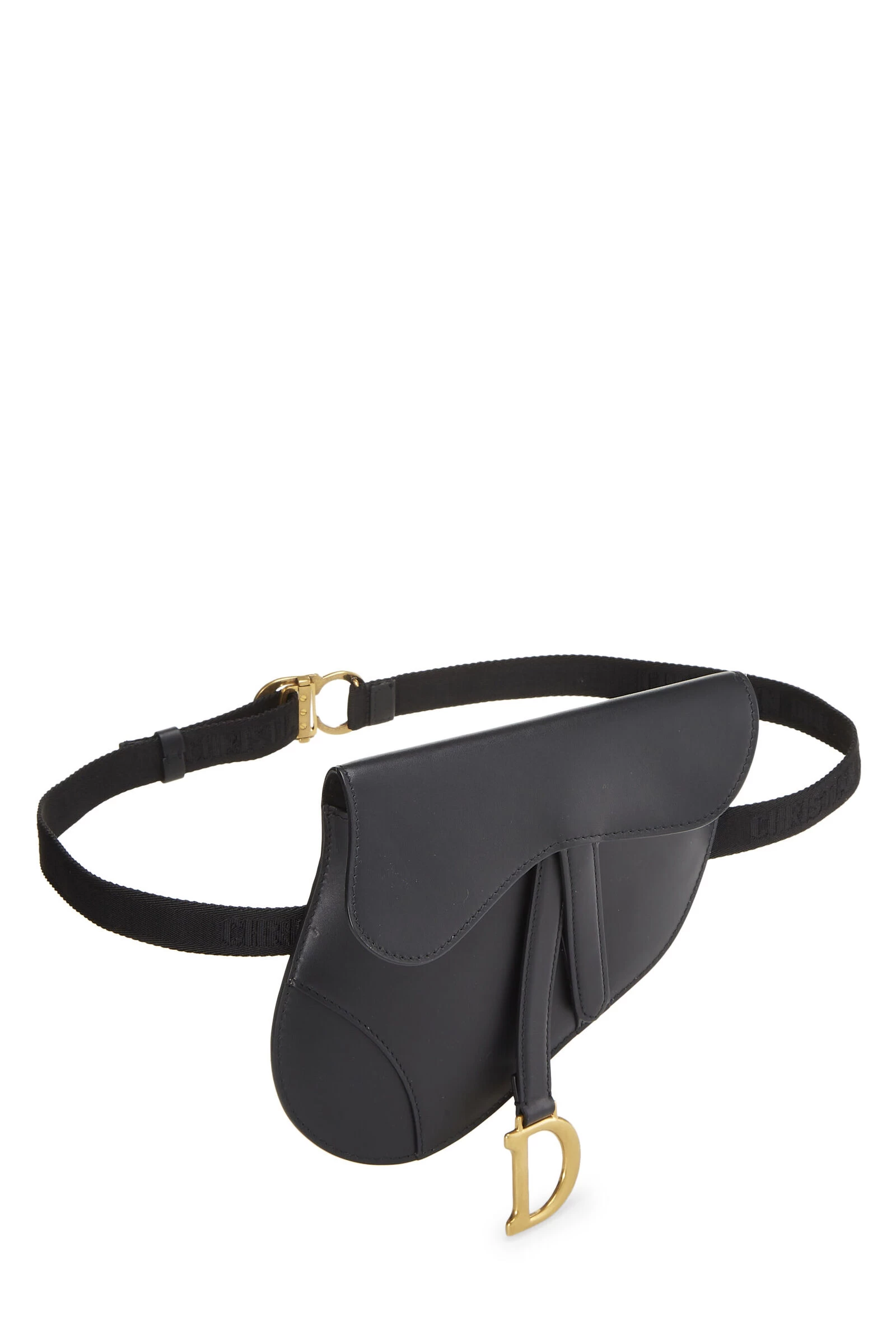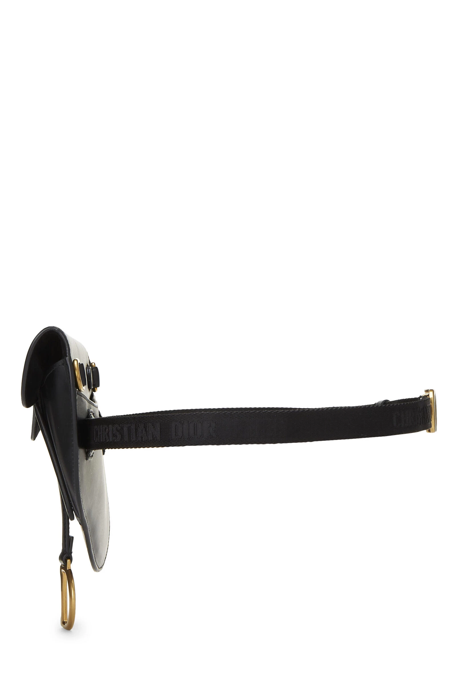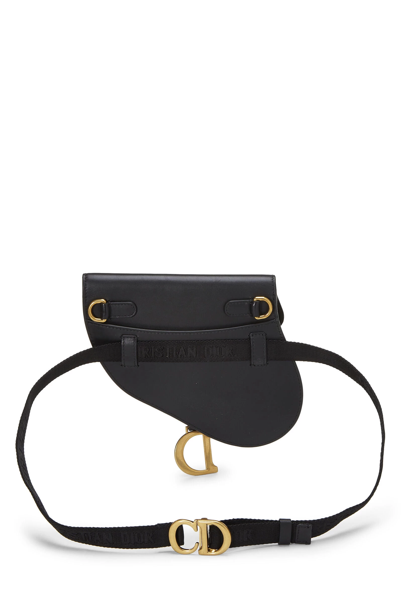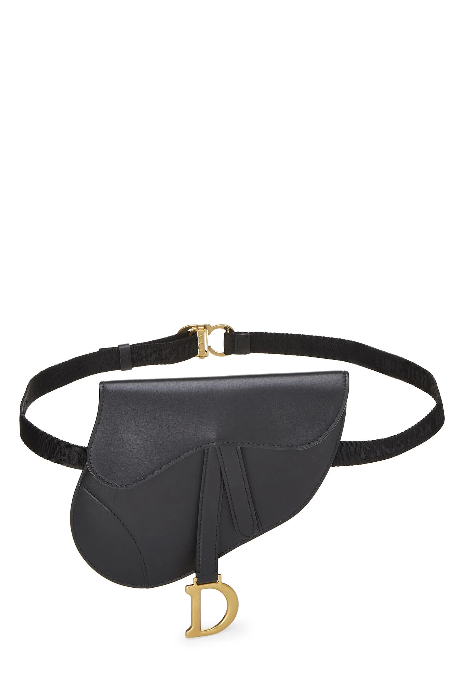 Christian Dior’s curved Saddle silhouette is reimagined as a belt bag- crafted in smooth black calfskin leather with signature gold ‘D’ logo hardware.