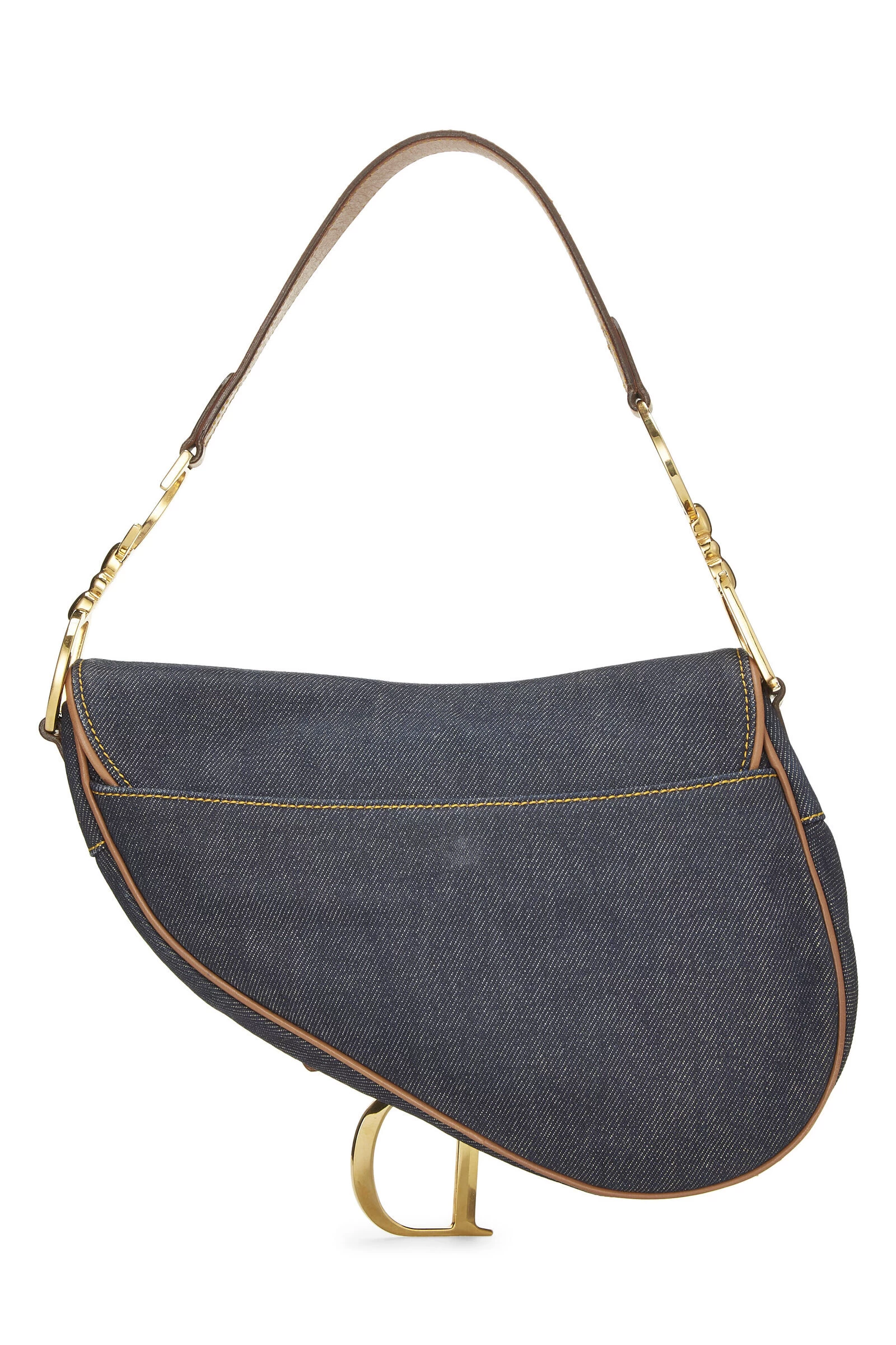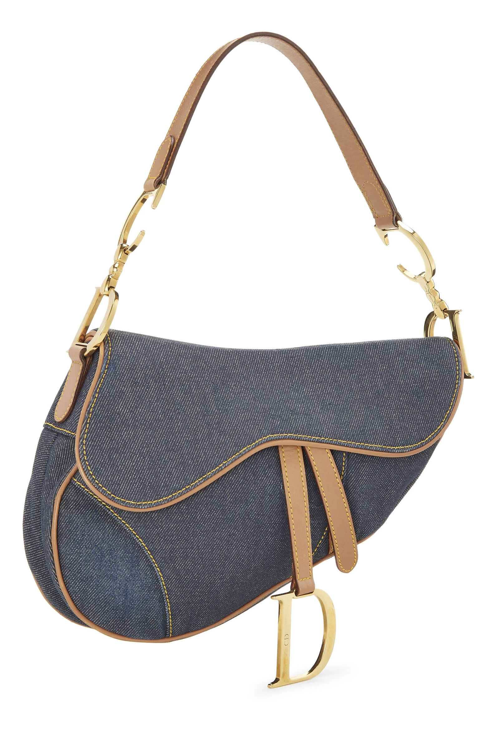 This classic Christian Dior Saddle bag is rendered in dark wash denim, accented with brown leather details and finished with gold-tone ‘CD’ hardware.