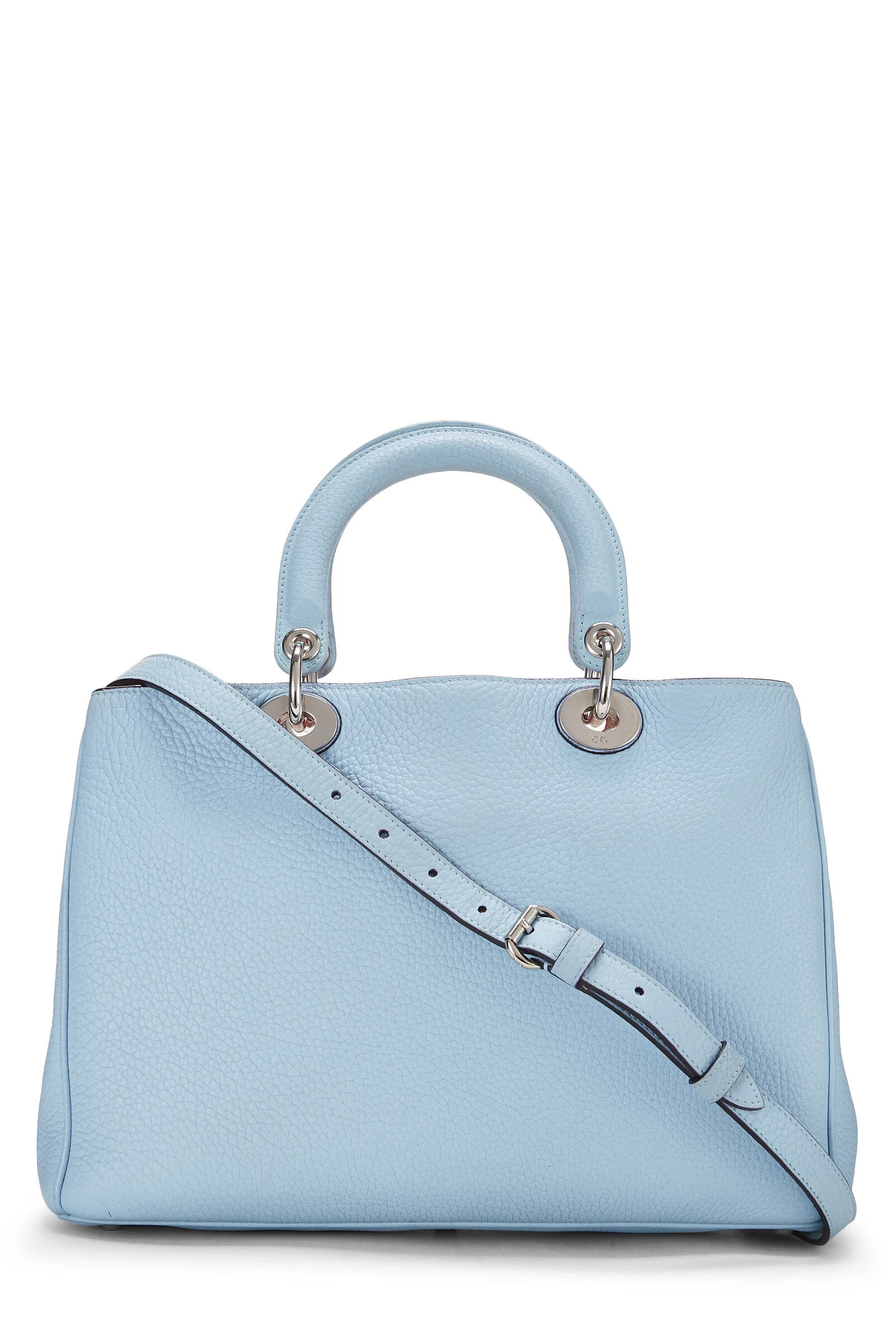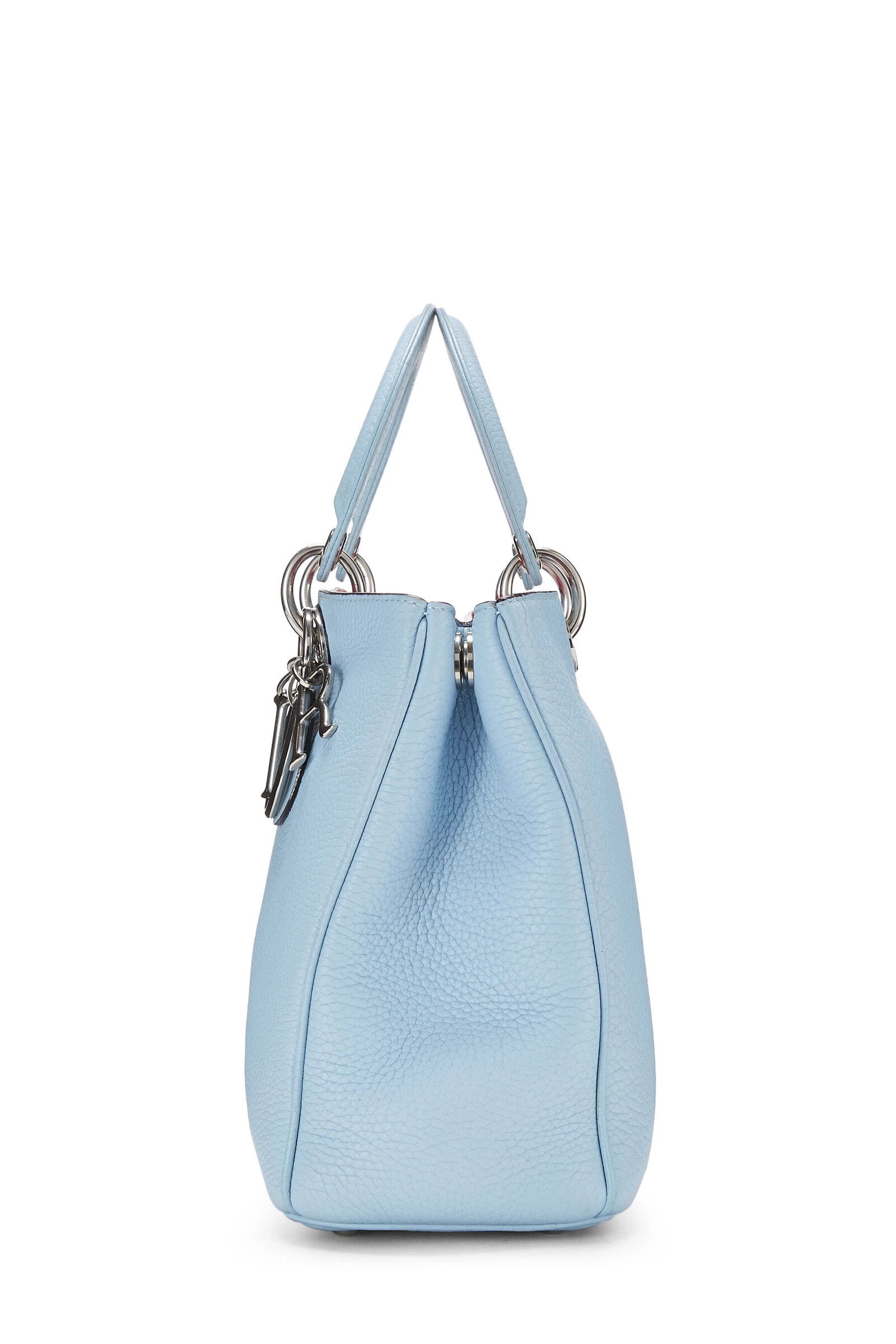 Classic Diorissimo medium top handle bag rendered in light blue smooth leather, a contrasting pink leather lining – featuring logo charms, blue leather top handles and detachable shoulder strap.