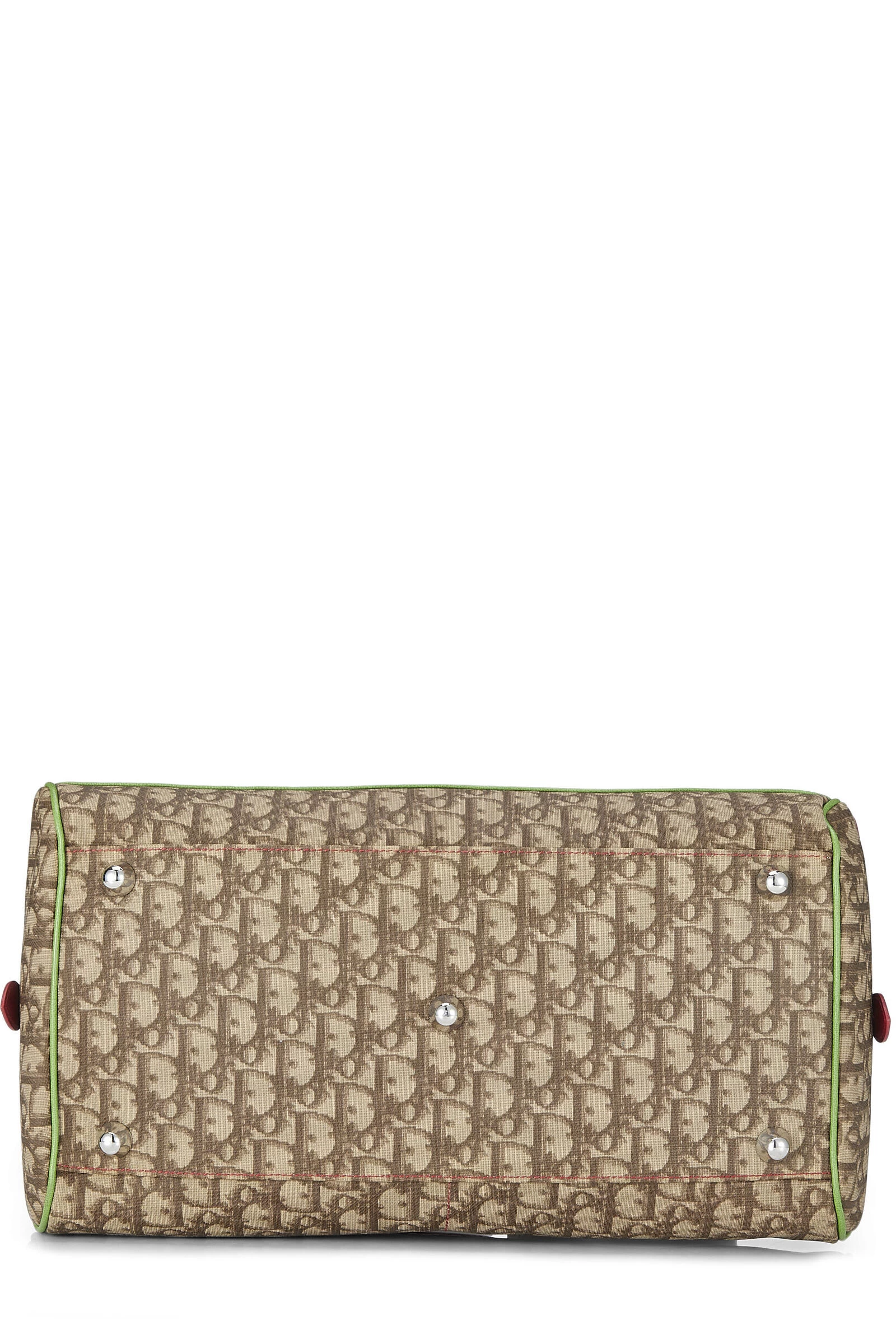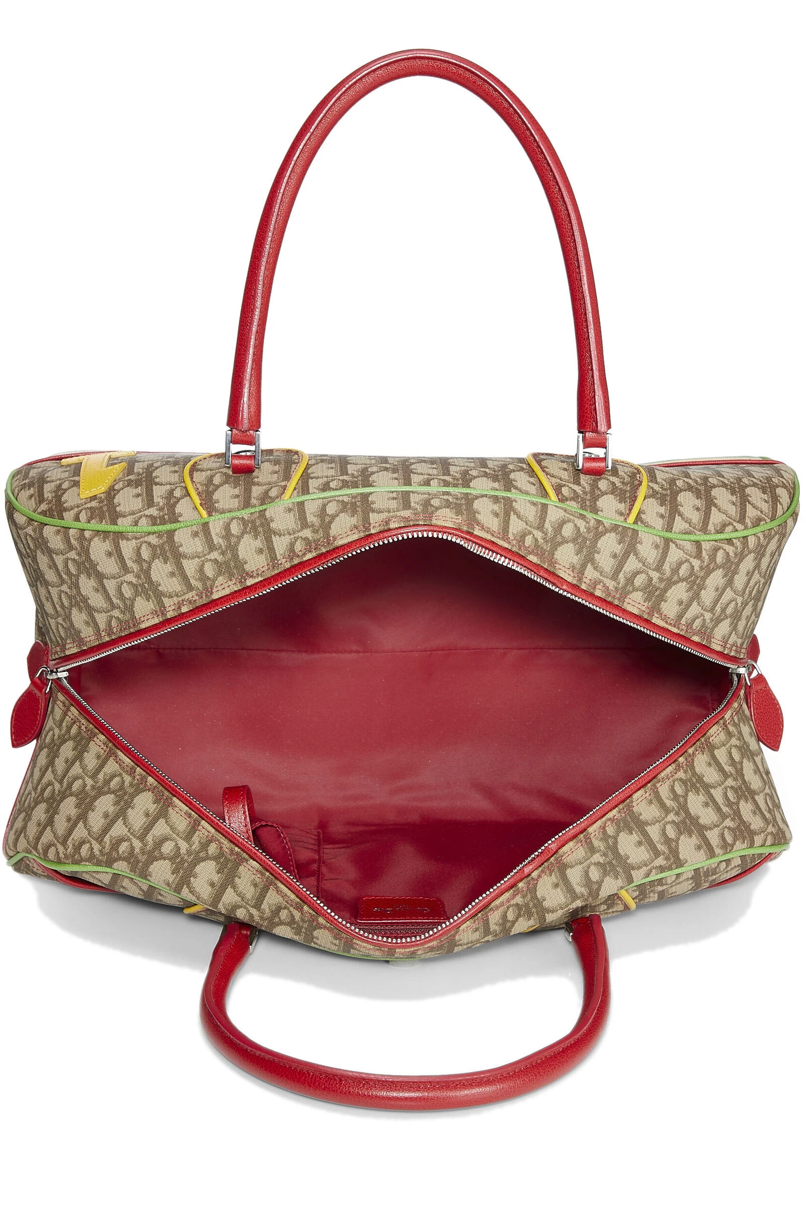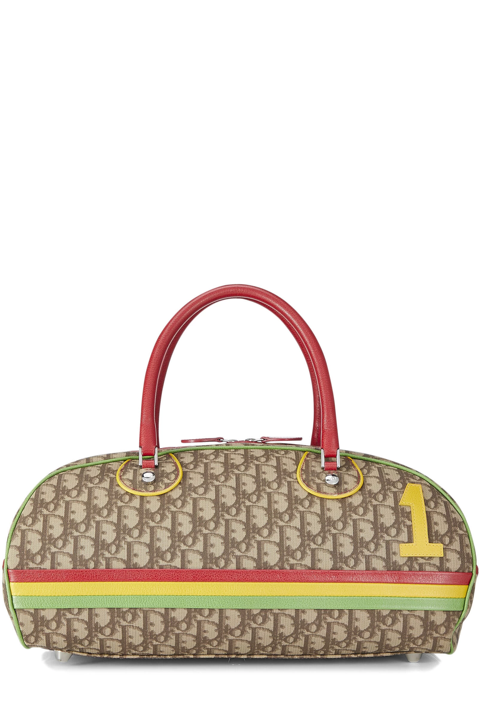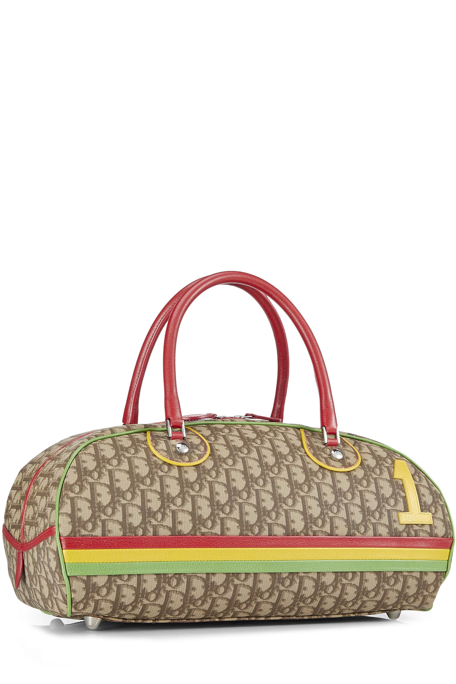 Christian Dior’s brown and tan Trotter logo coated canvas is updated with red, yellow and green Rastafarian-inspired accents, featuring red leather top handles, leather ‘1’ embroidered motif and finished with silver-tone hardware.