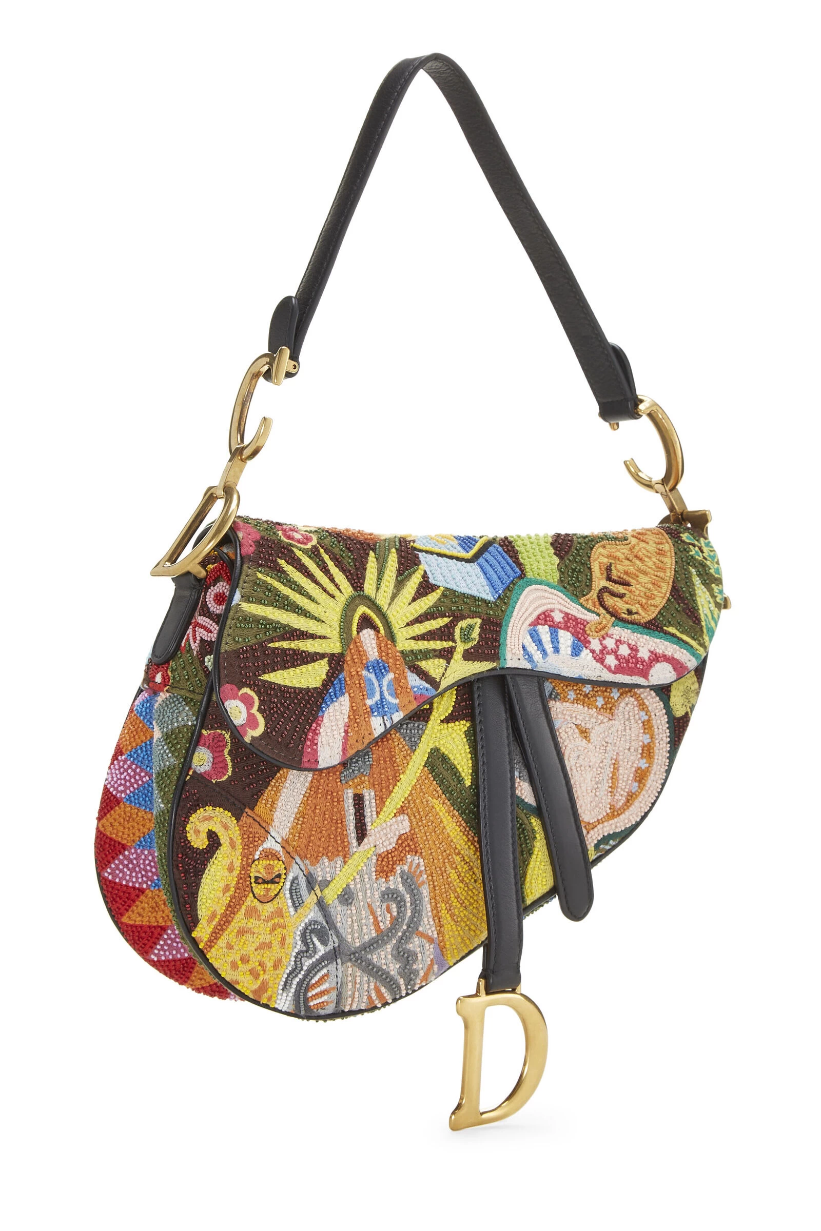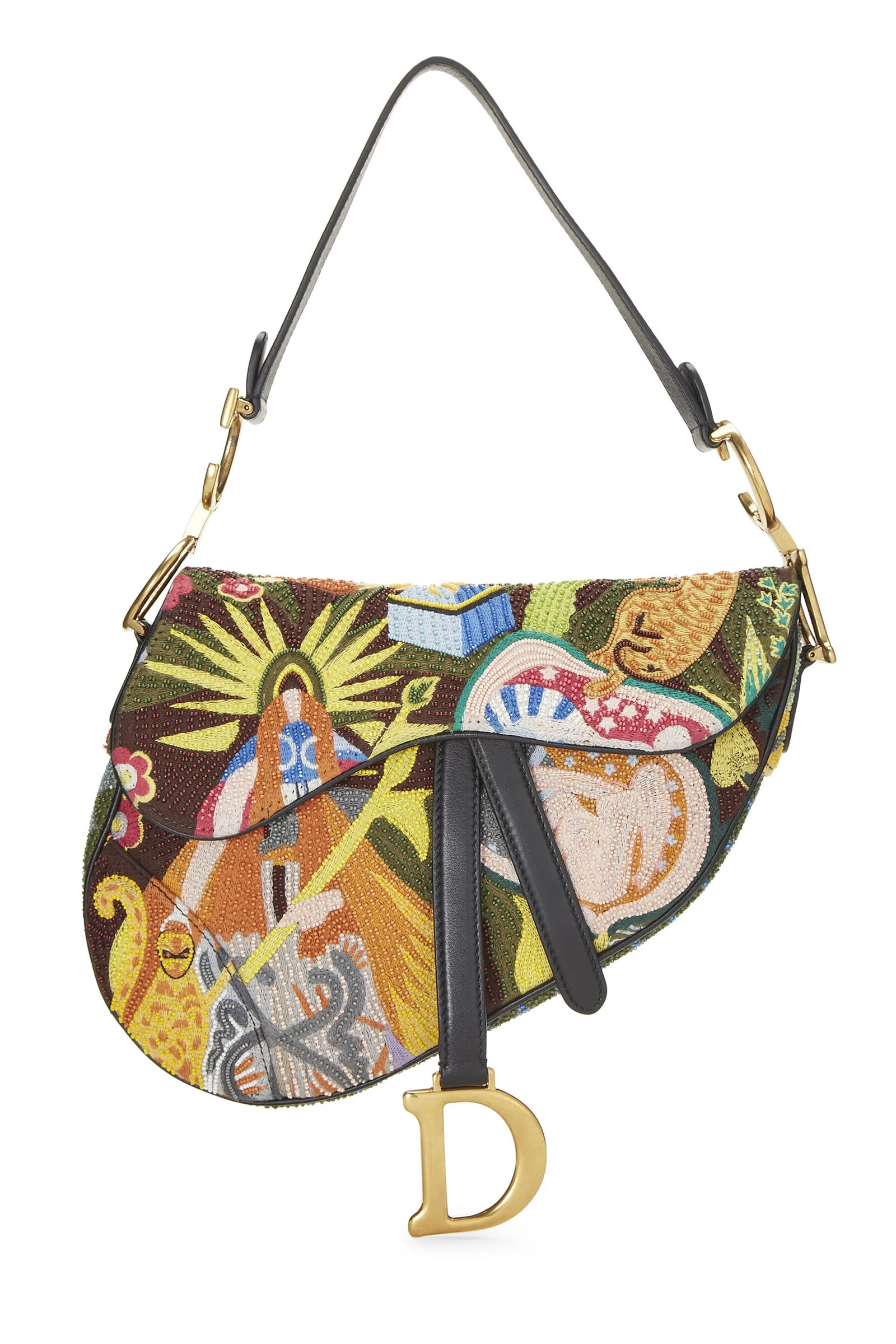A rare and unique iteration of the maison’s beloved Saddle silhouette and featured in the 2018 runway collection, this transitional bag comes embellished from seam to seam with gold-tone metal framing. In true Dior fashion, it’s also adorned with letter charmsâboth dangling and linked along the shoulder strap. This Saddle style is crafted in an all-over abstract beaded pattern in an array of colors. Open yours to reveal a black leather-lined interior that’ll comfortably house your must-haves. Style yours with silver jewels and take it from day to night with ease.