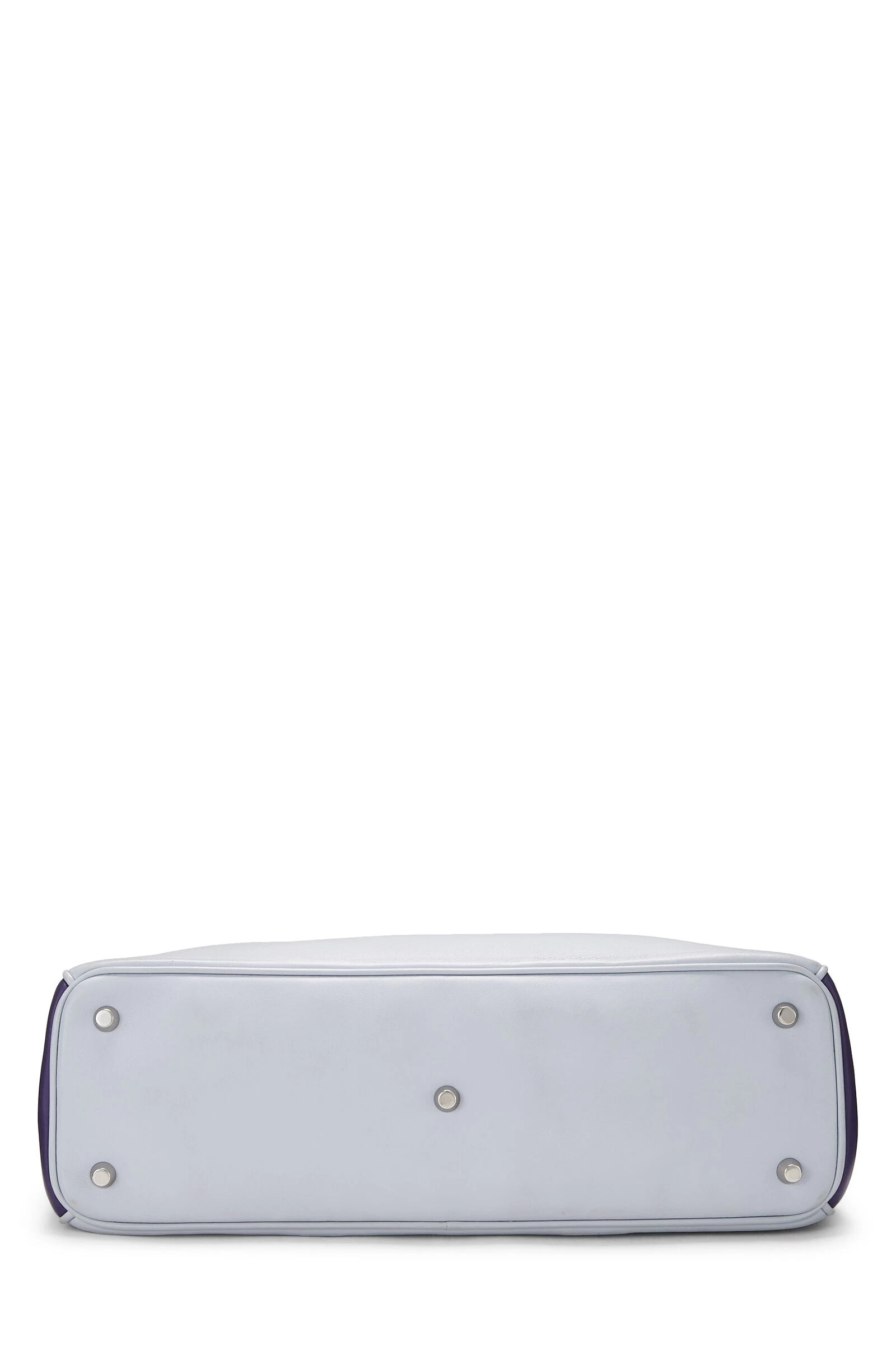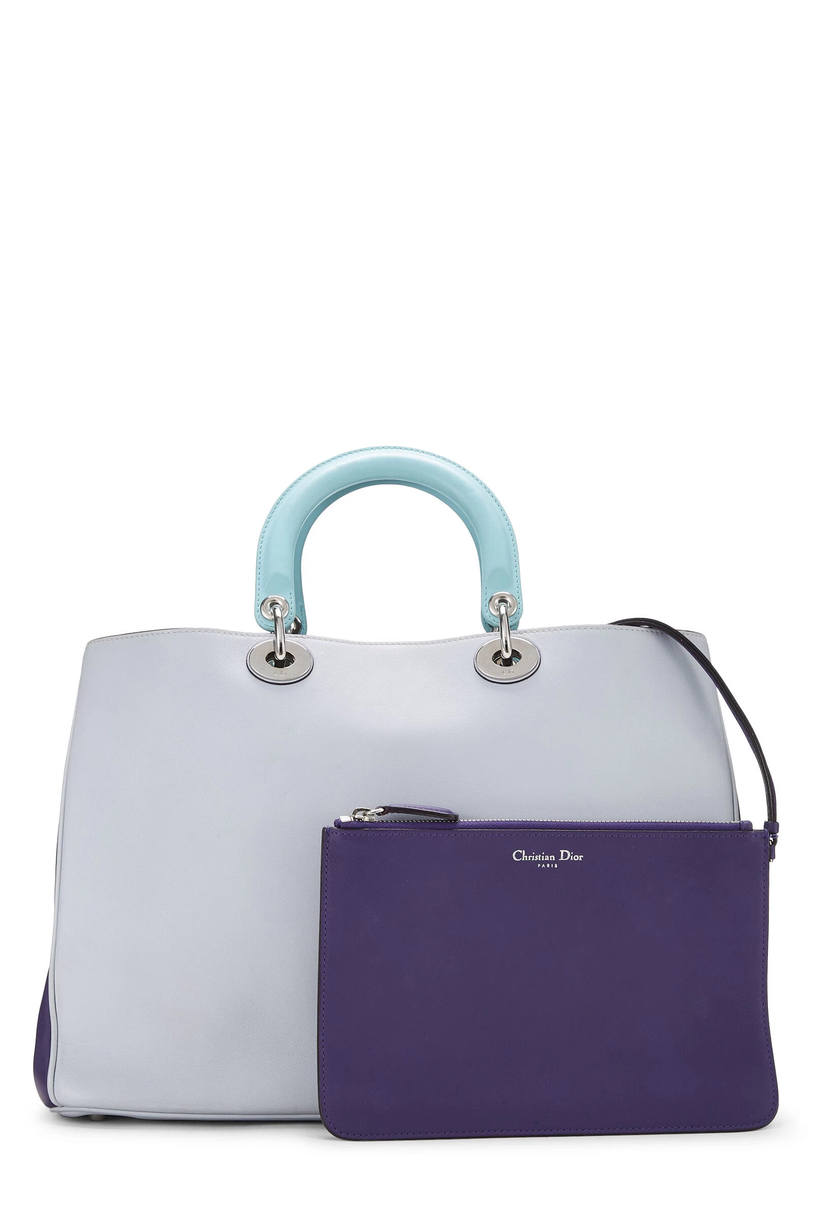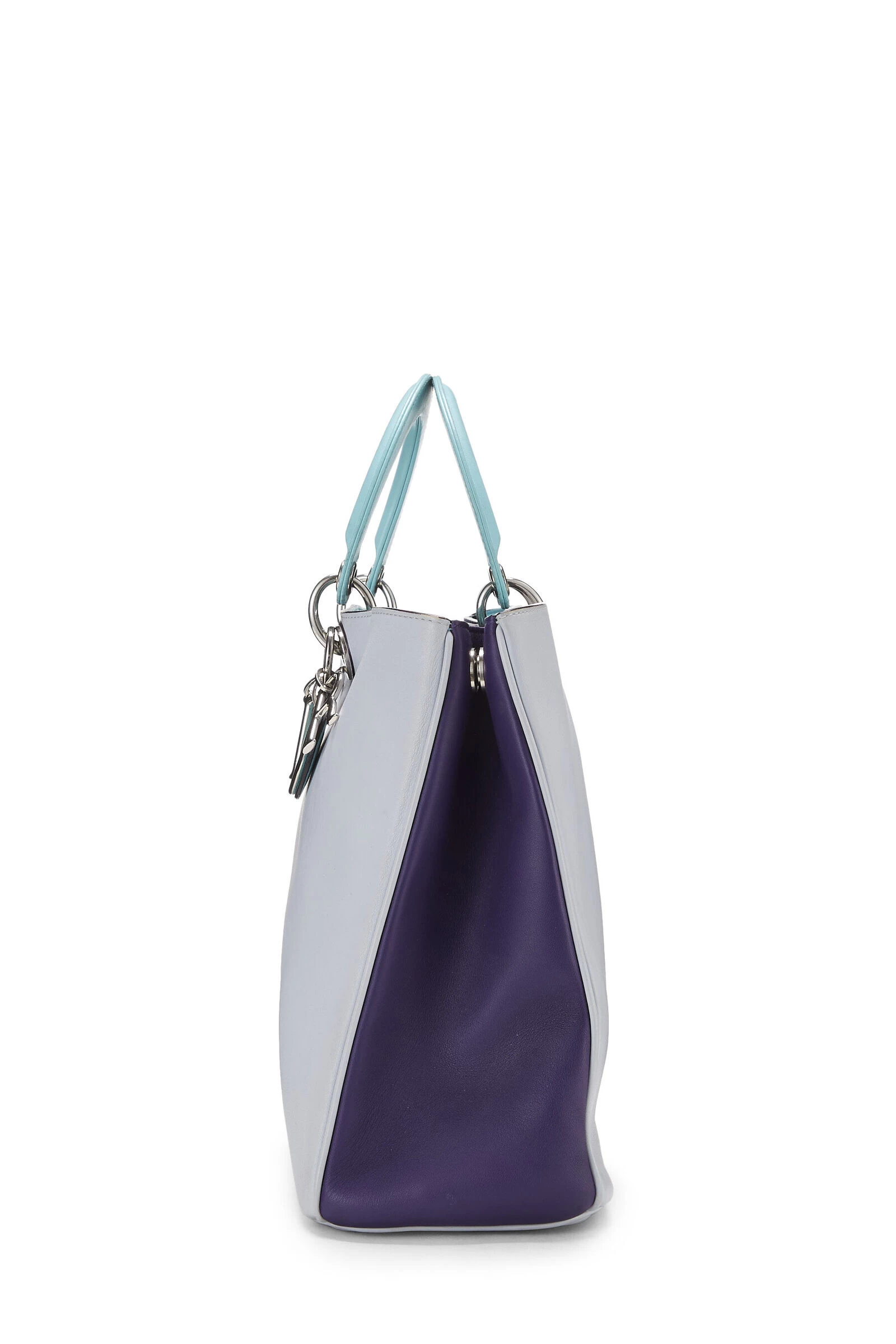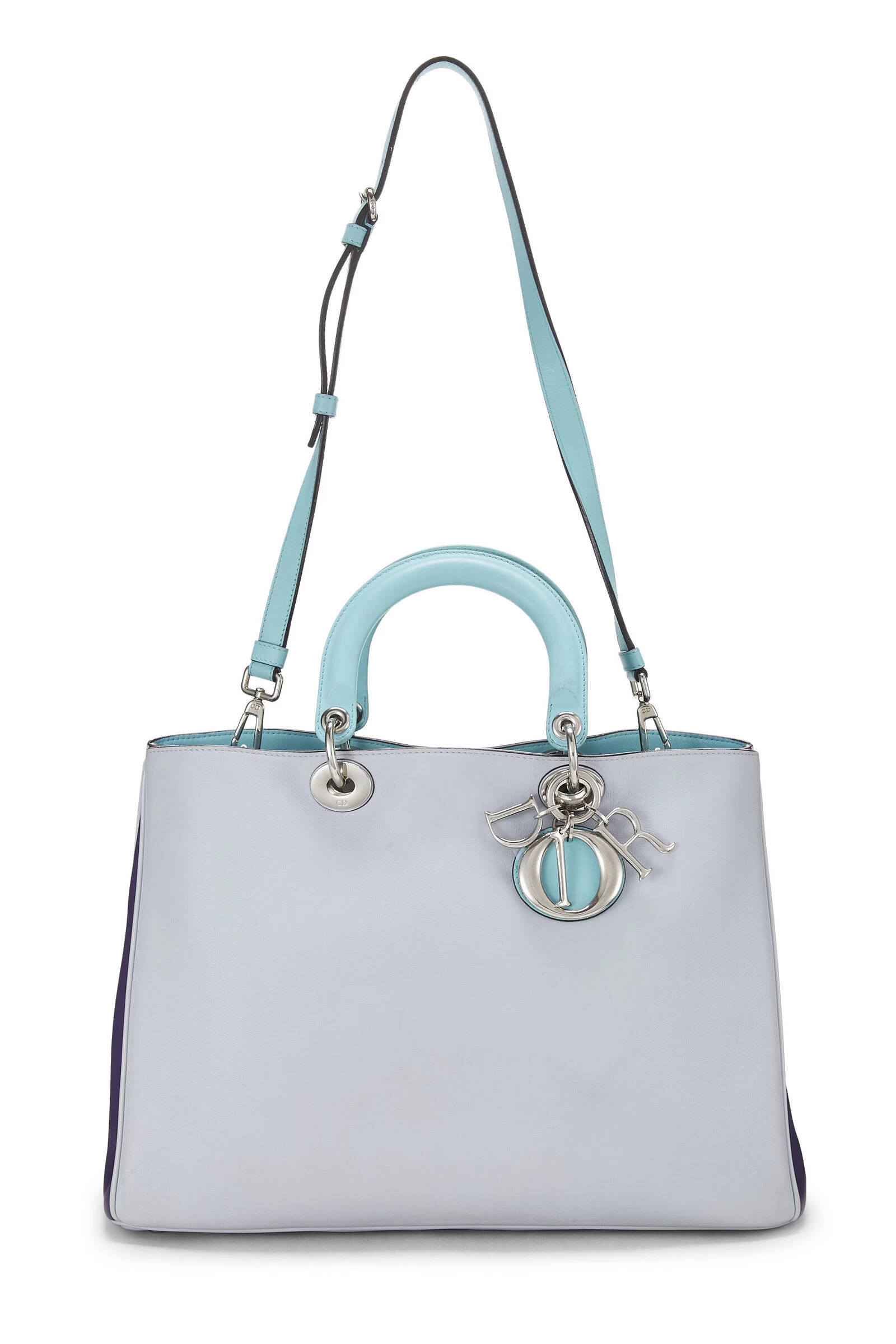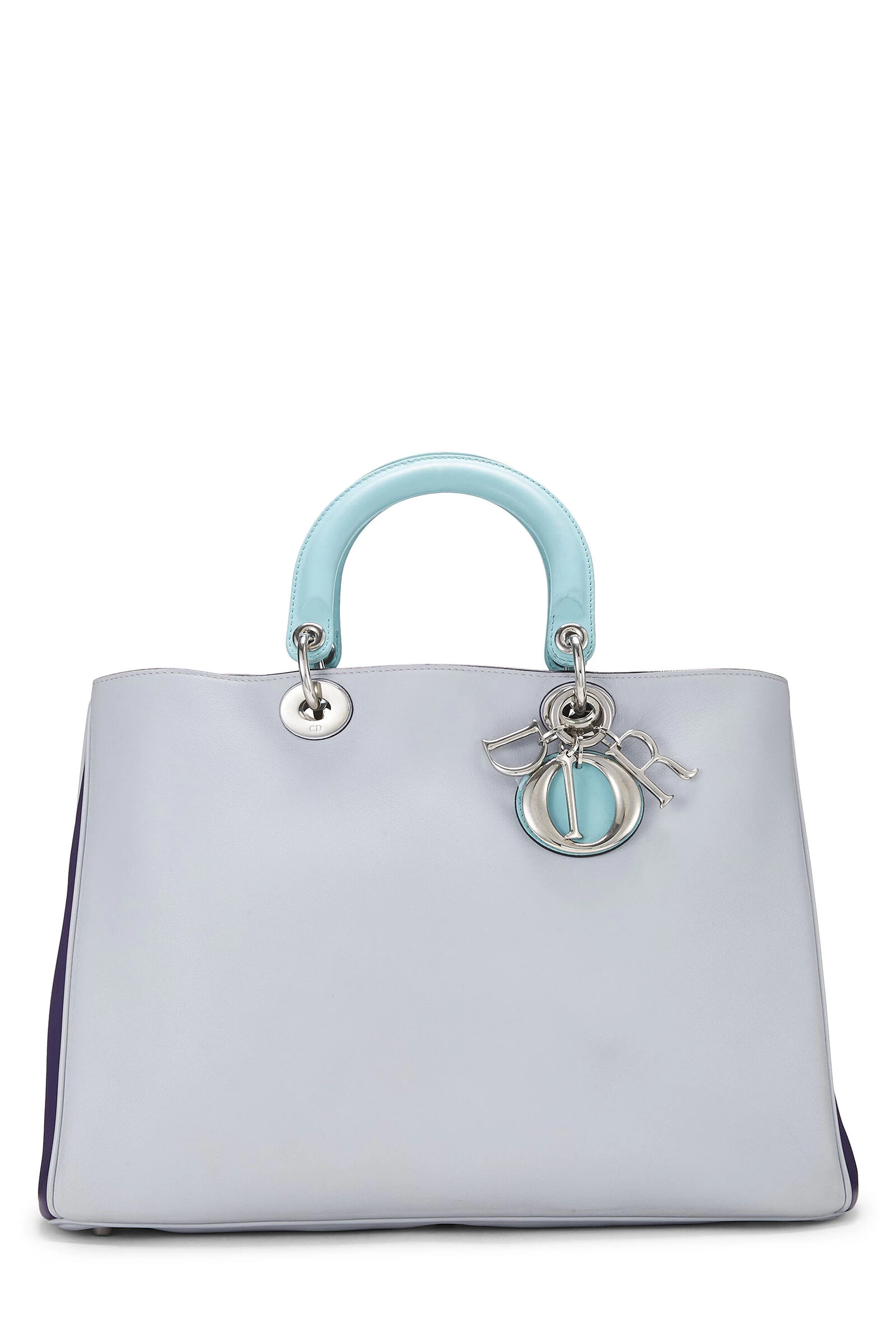 Classic Diorissimo large top handle bag rendered in purple and grey paneled smooth leather, featuring silver-tone logo charms, baby blue leather top handles and lining and detachable shoulder strap.