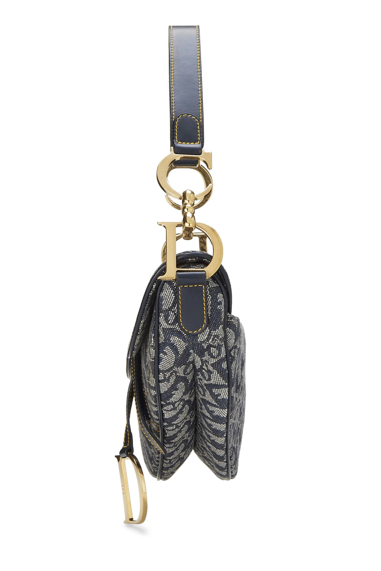 Dior’s iconic Saddle bag is rendered in the house’s signature Trotter logo canvas, featuring tonal leather trim and gold-tone ‘C’ and ‘D’ logo letter hardware.