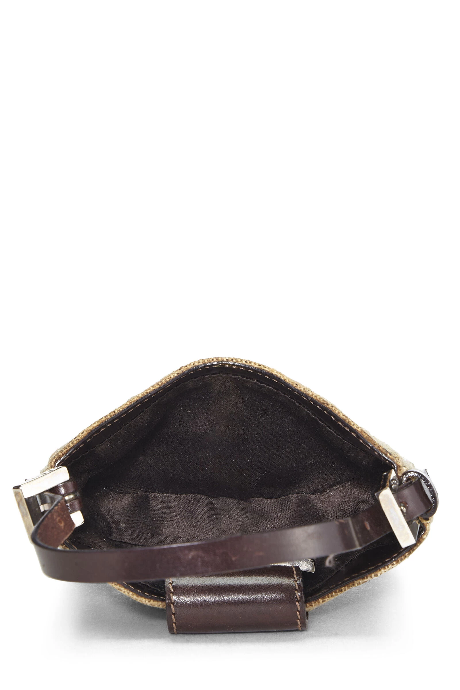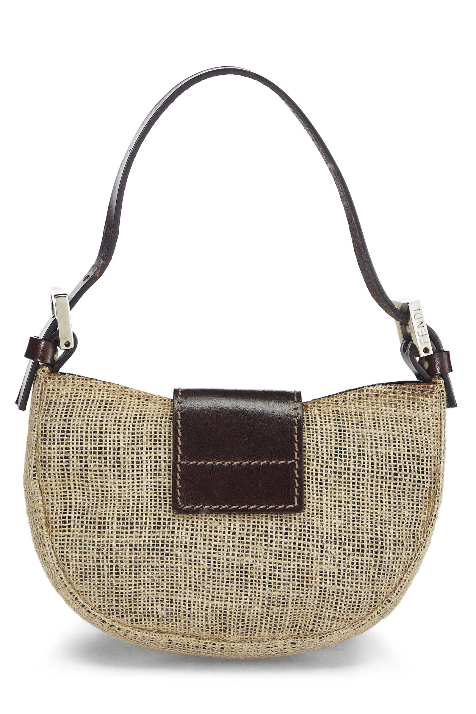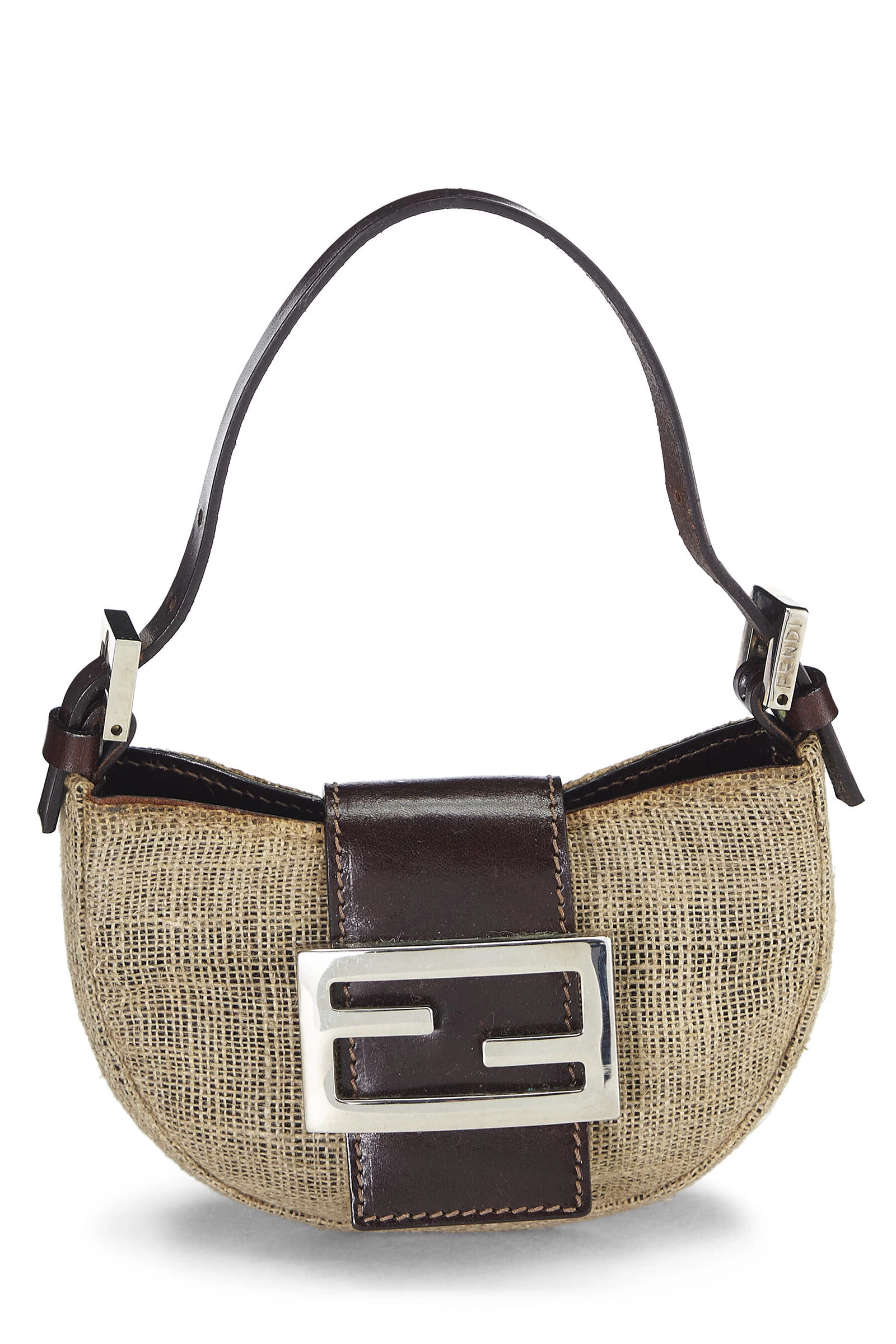 Chic Fendi Croissant mini bag crafted in beige canvas, featuring dark brown leather accents and finished with silver-tone logo hardware.