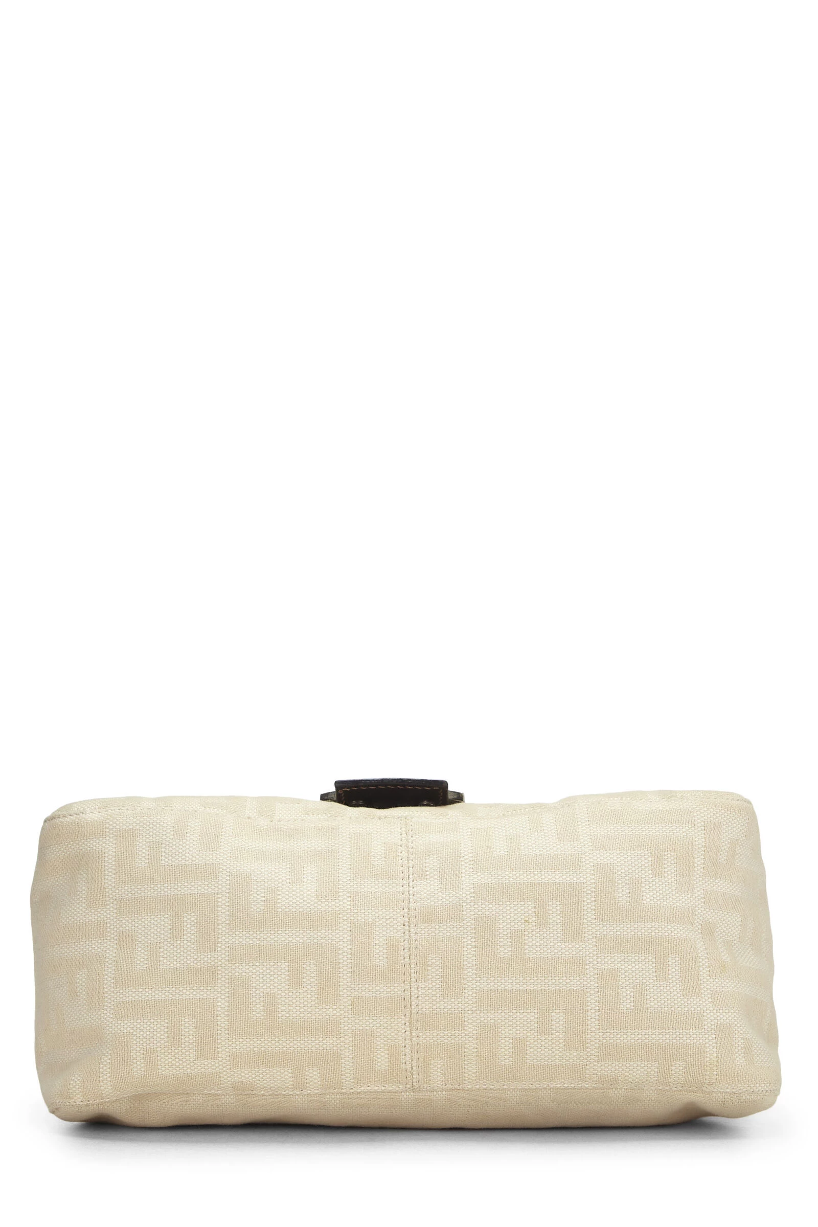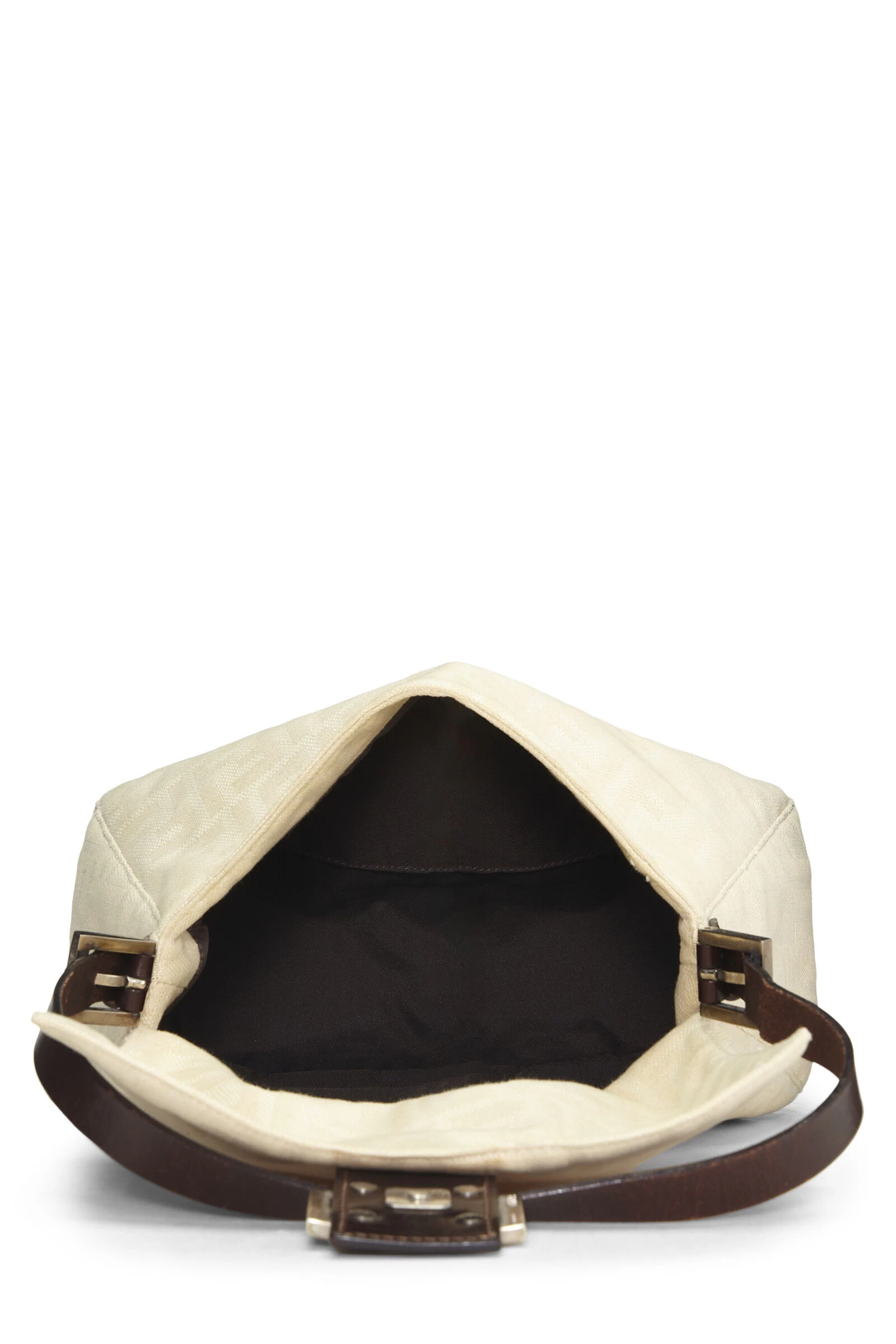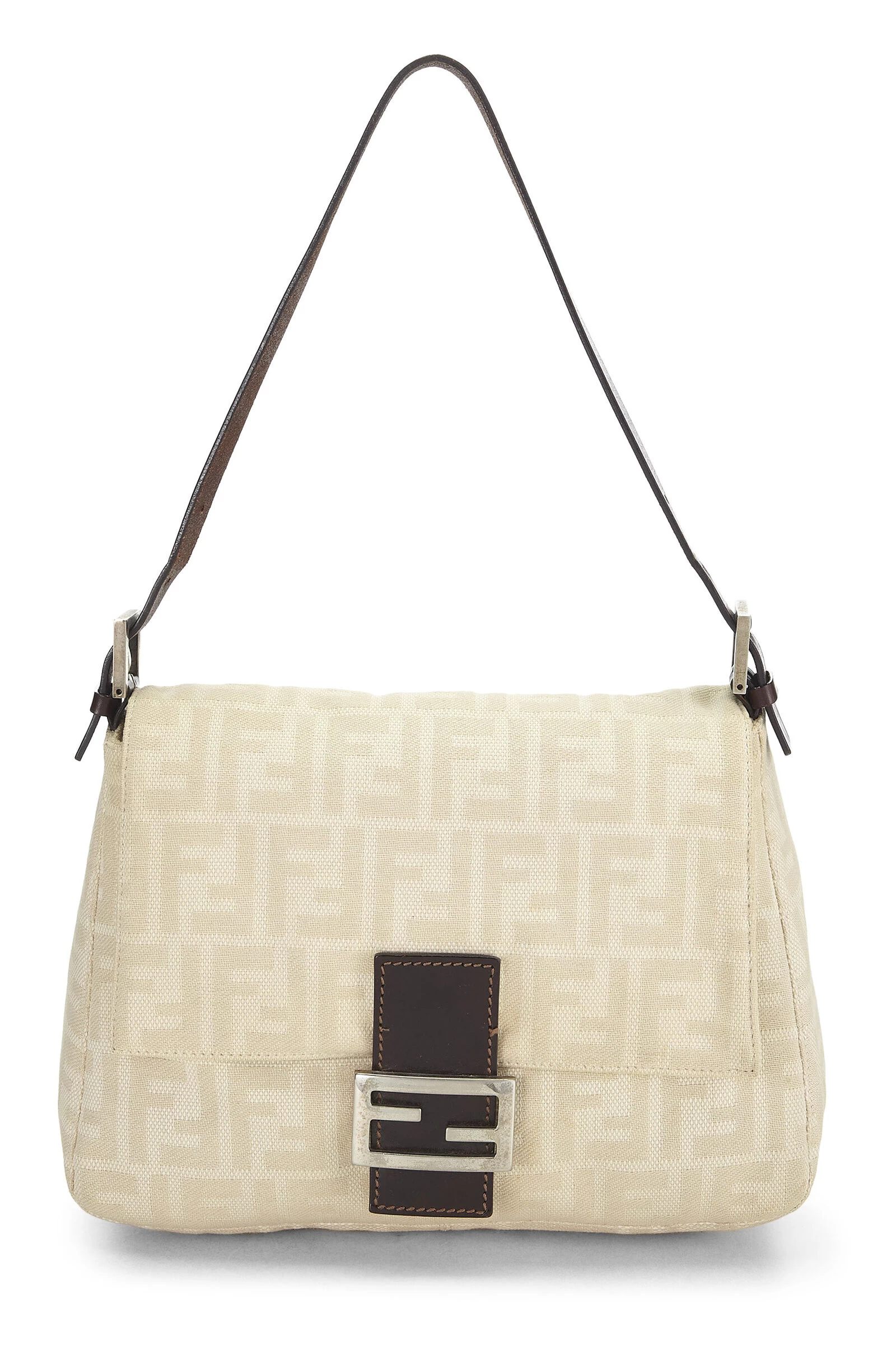 Iconic Fendi Mama shoulder bag crafted in beige Zucca logo canvas, featuring dark brown leather accents and finished with silver-tone logo hardware.