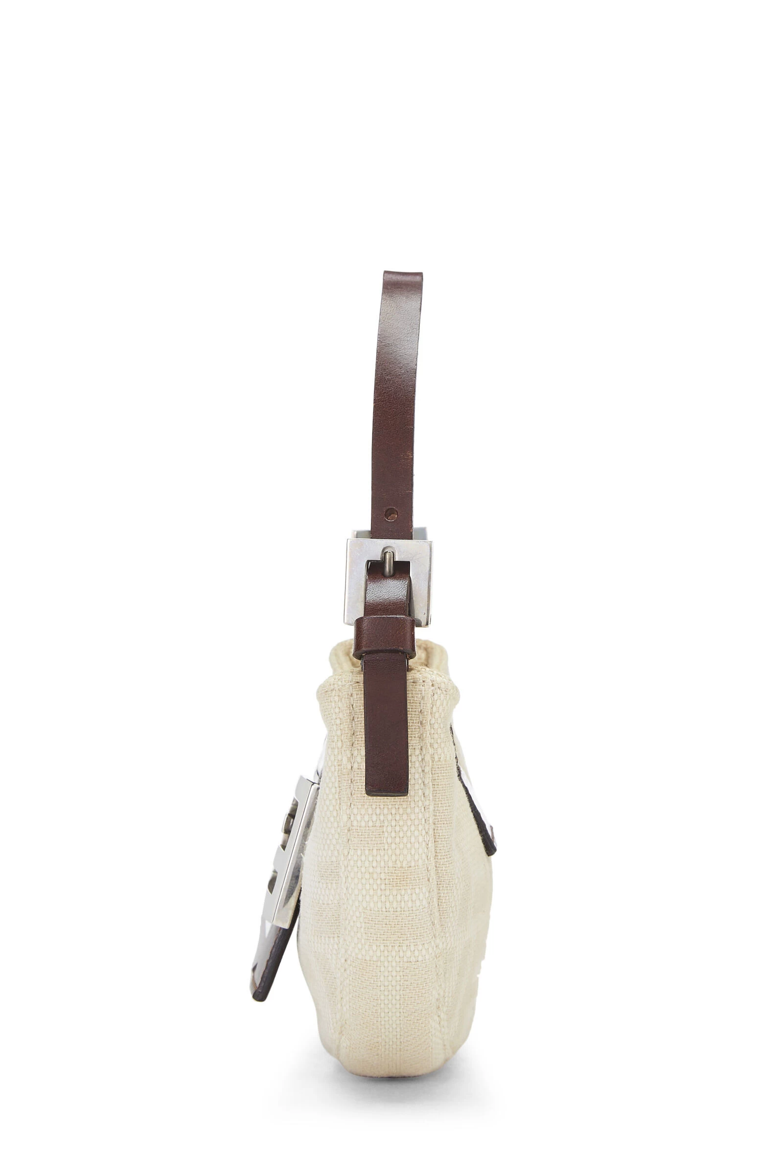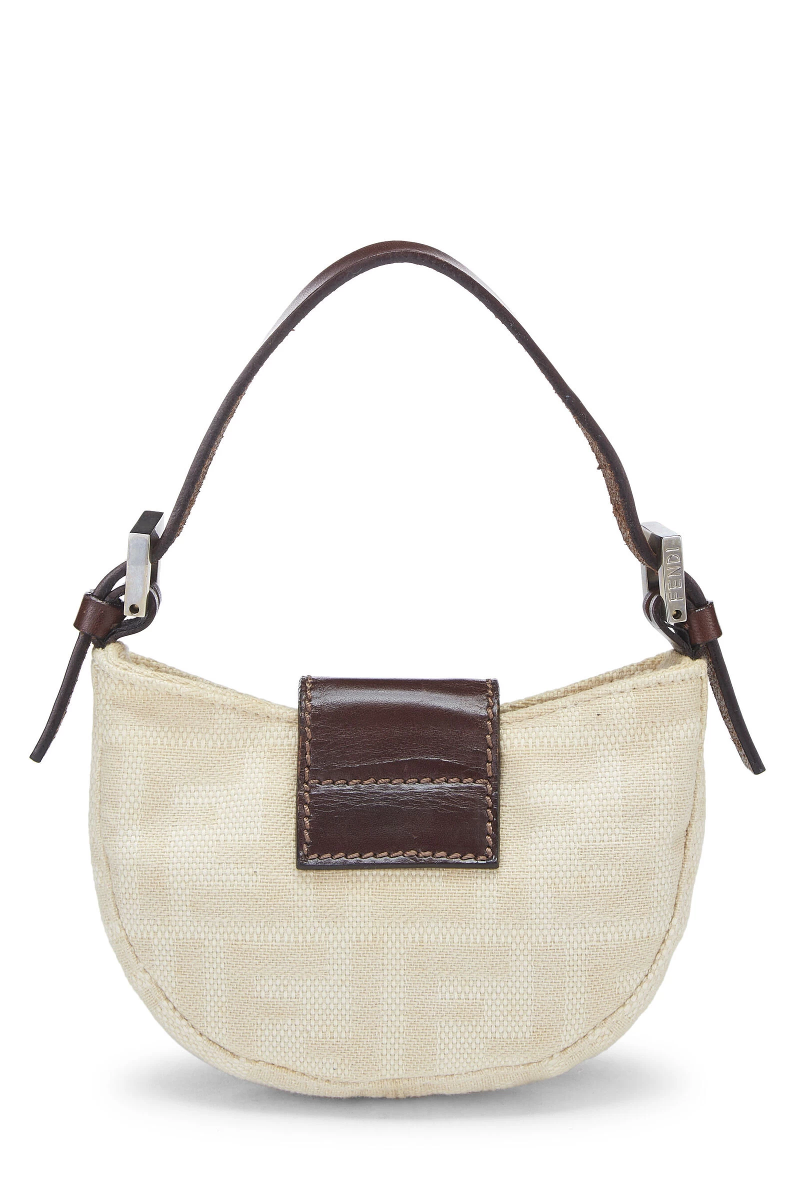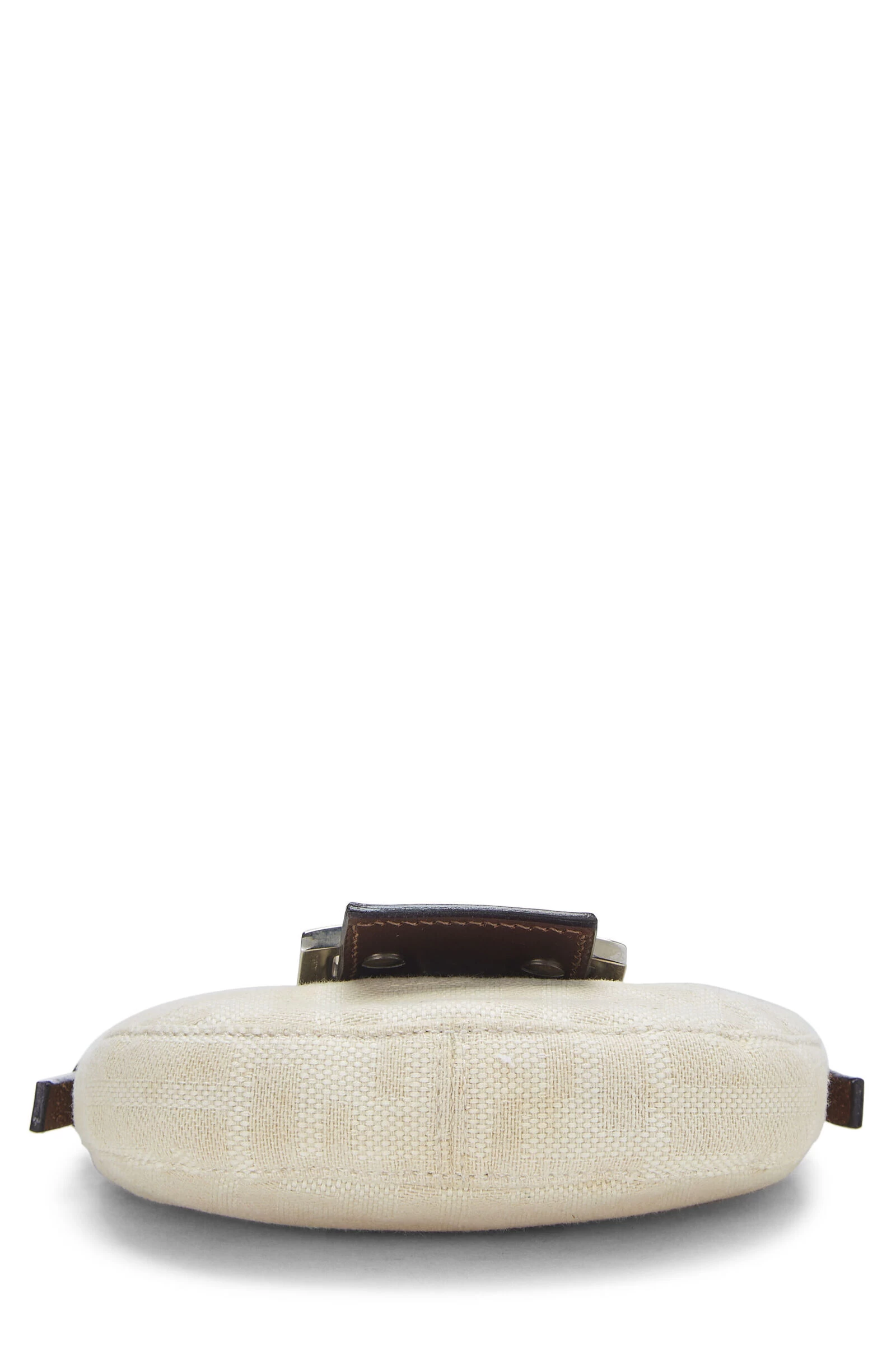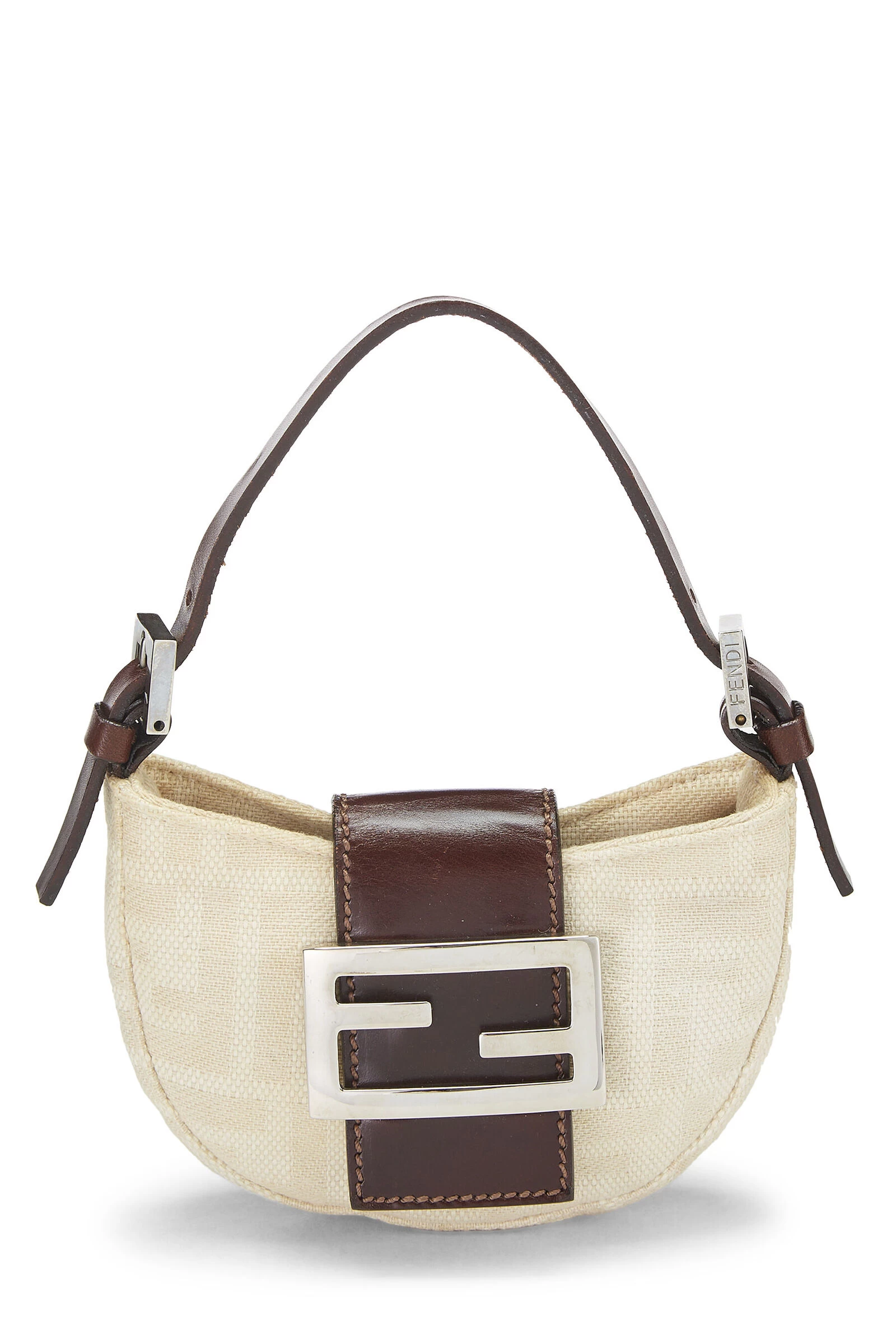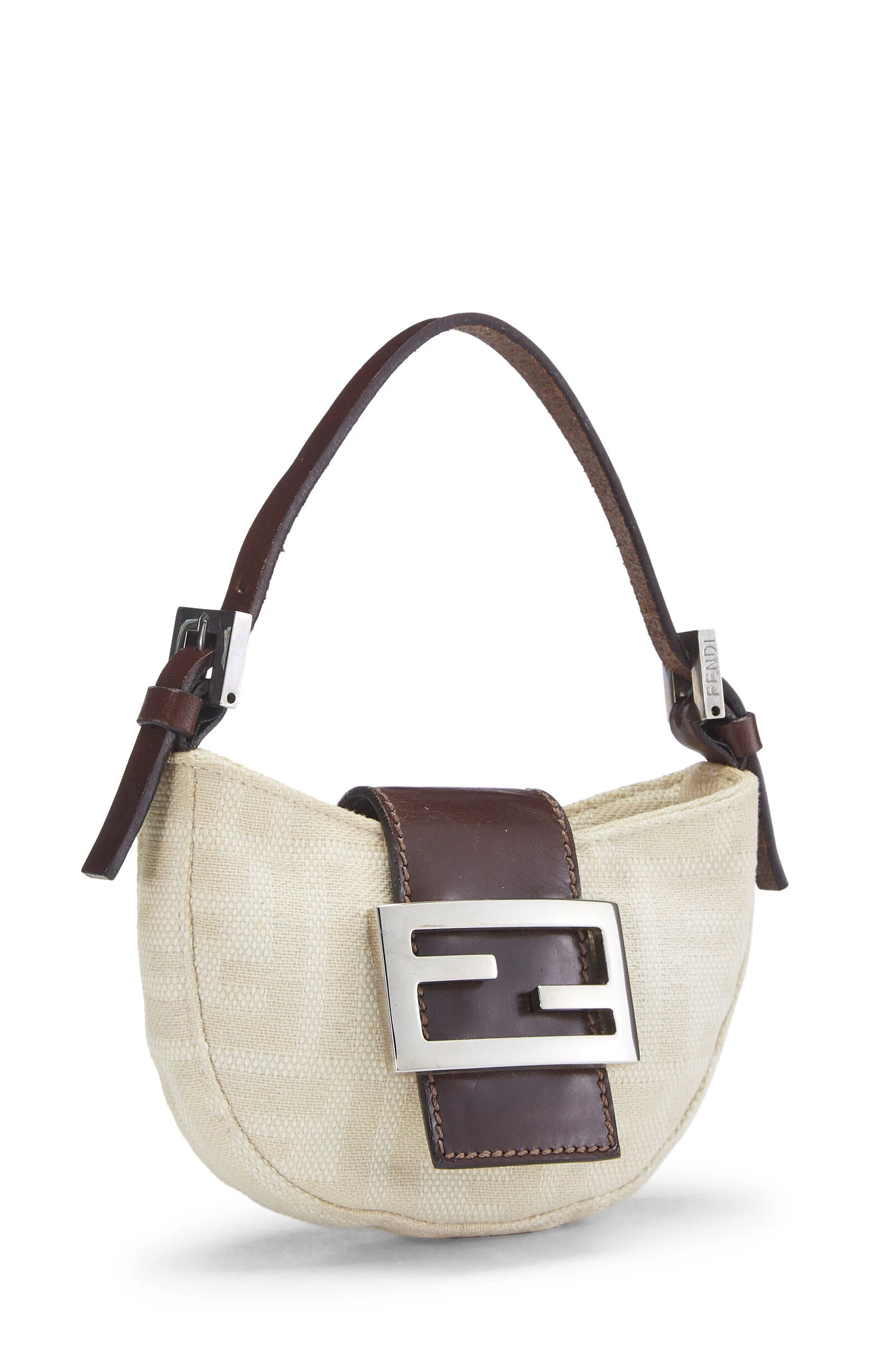 Chic Fendi Croissant mini bag crafted in beige Zucca logo canvas, featuring dark brown leather accents and finished with silver-tone logo hardware.
