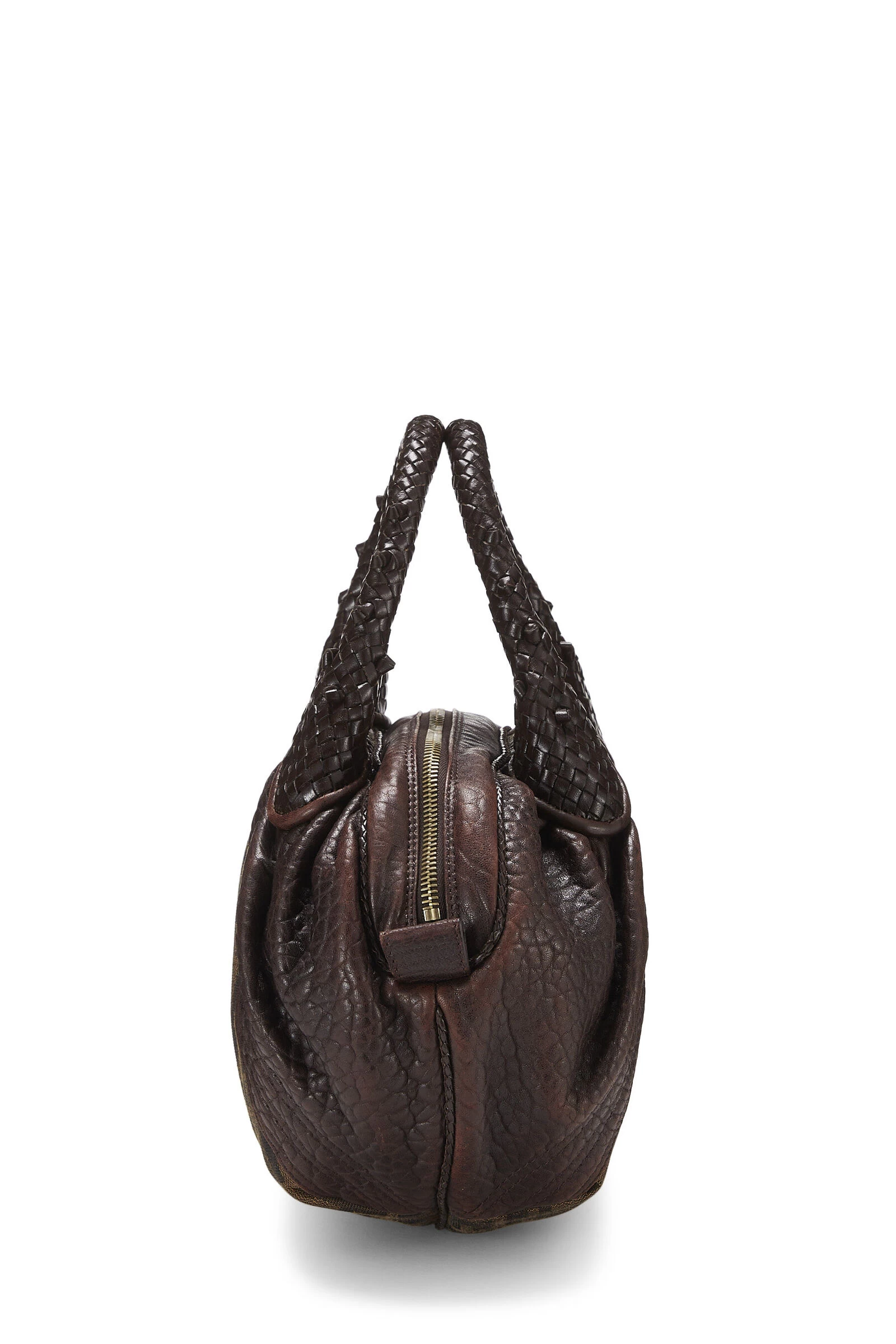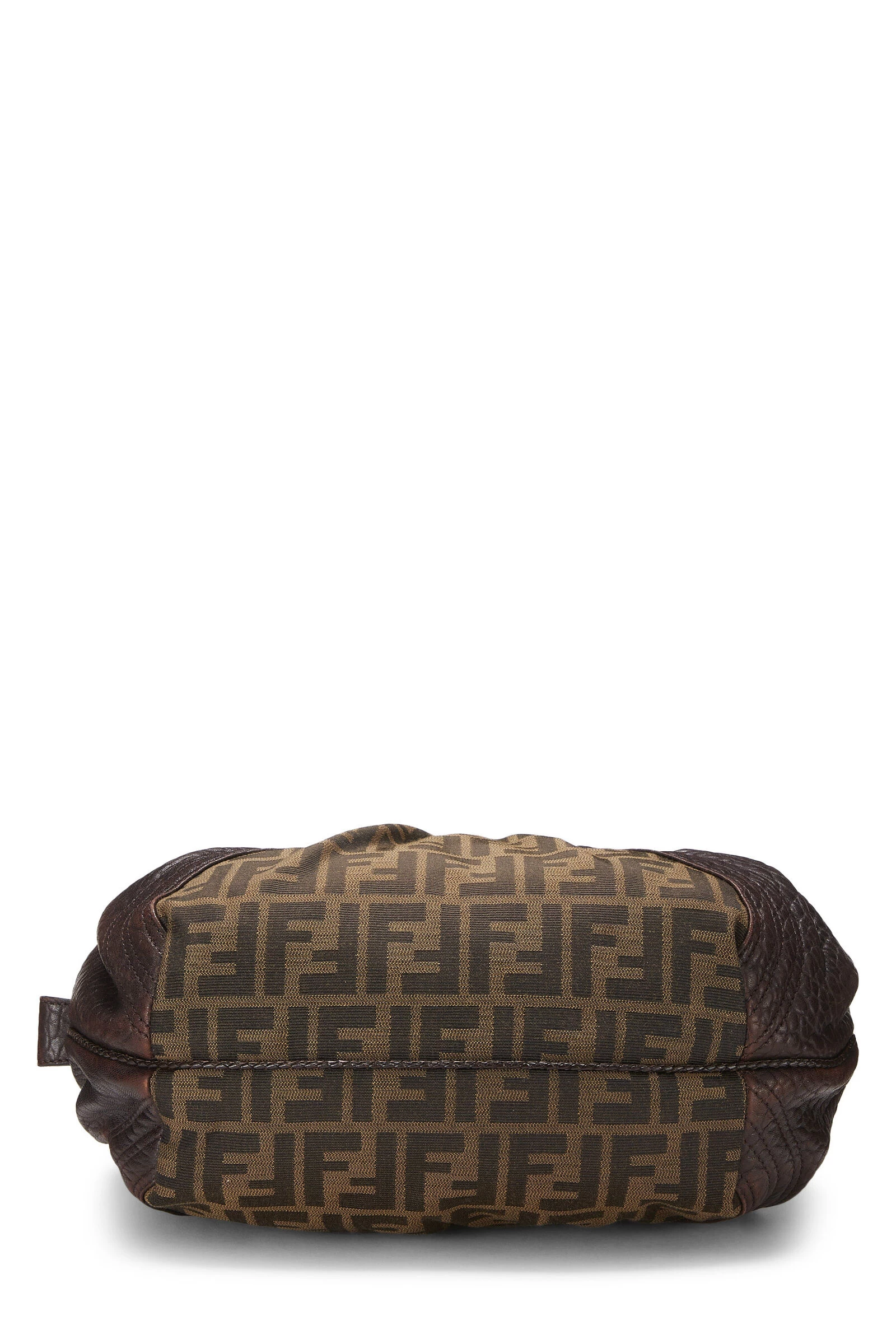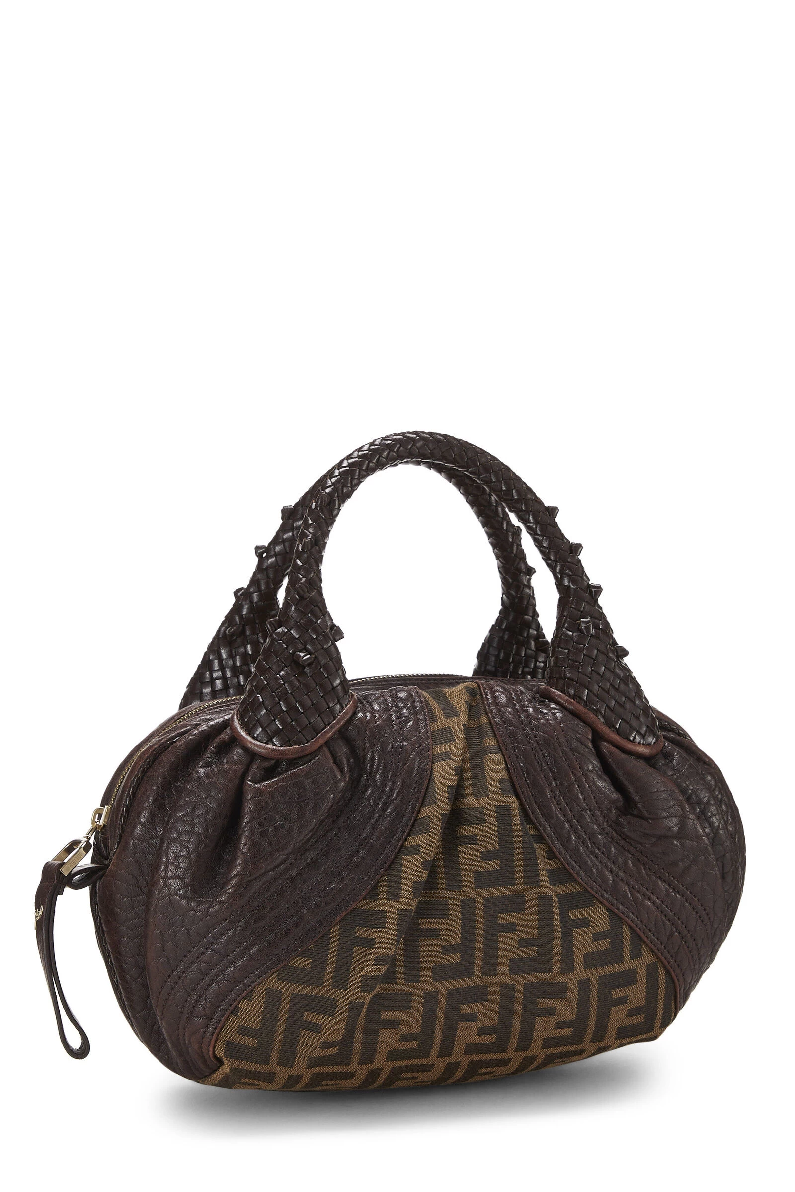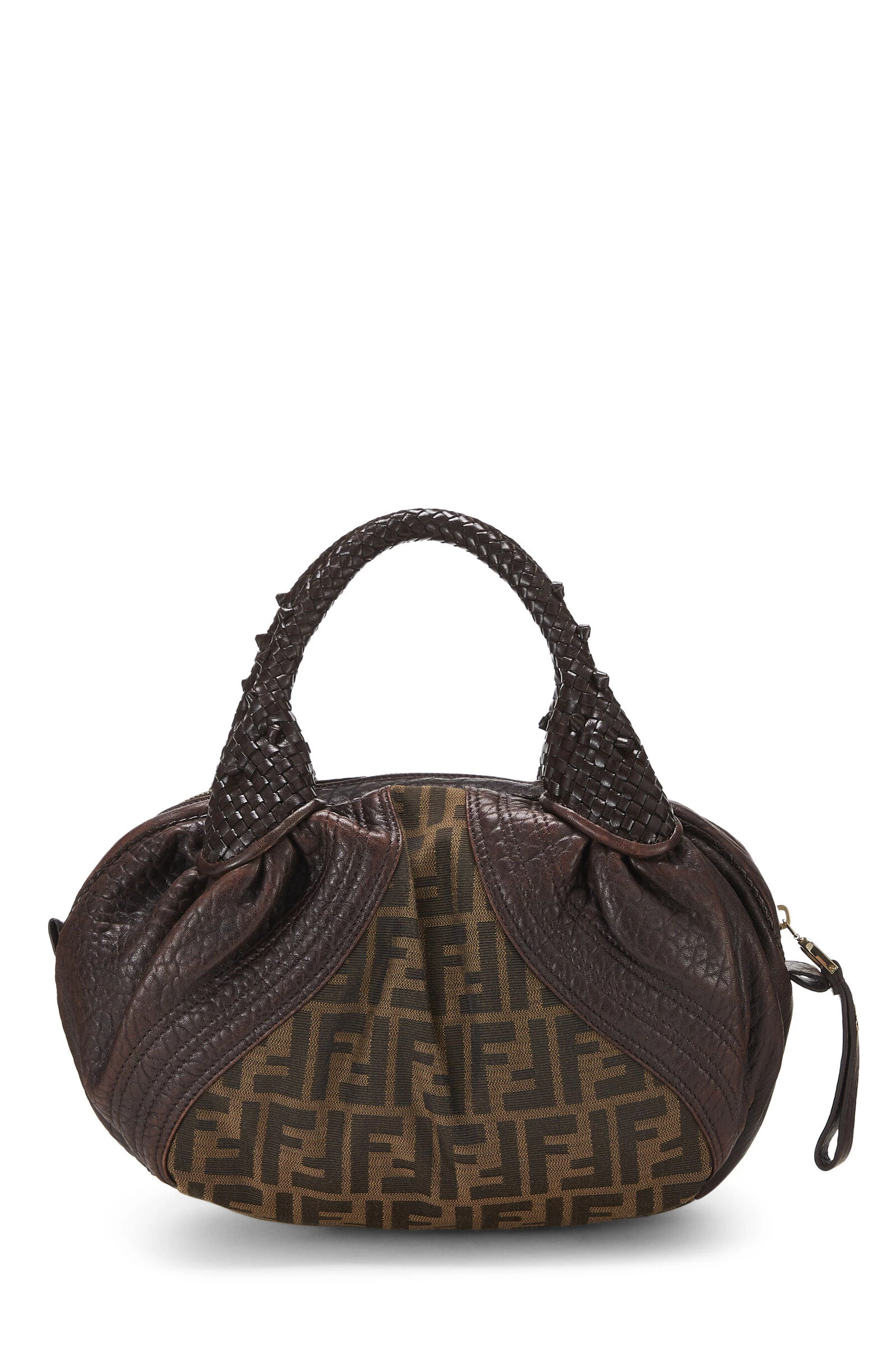 Classic Fendi Spy bag, featured here in the baby-size version, rendered in iconic Zucca logo canvas, featuring dark brown braided leather handles and finished with gold-tone hardware. Unzip the bag to reveal a spacious interior lined with durable light brown canvas.