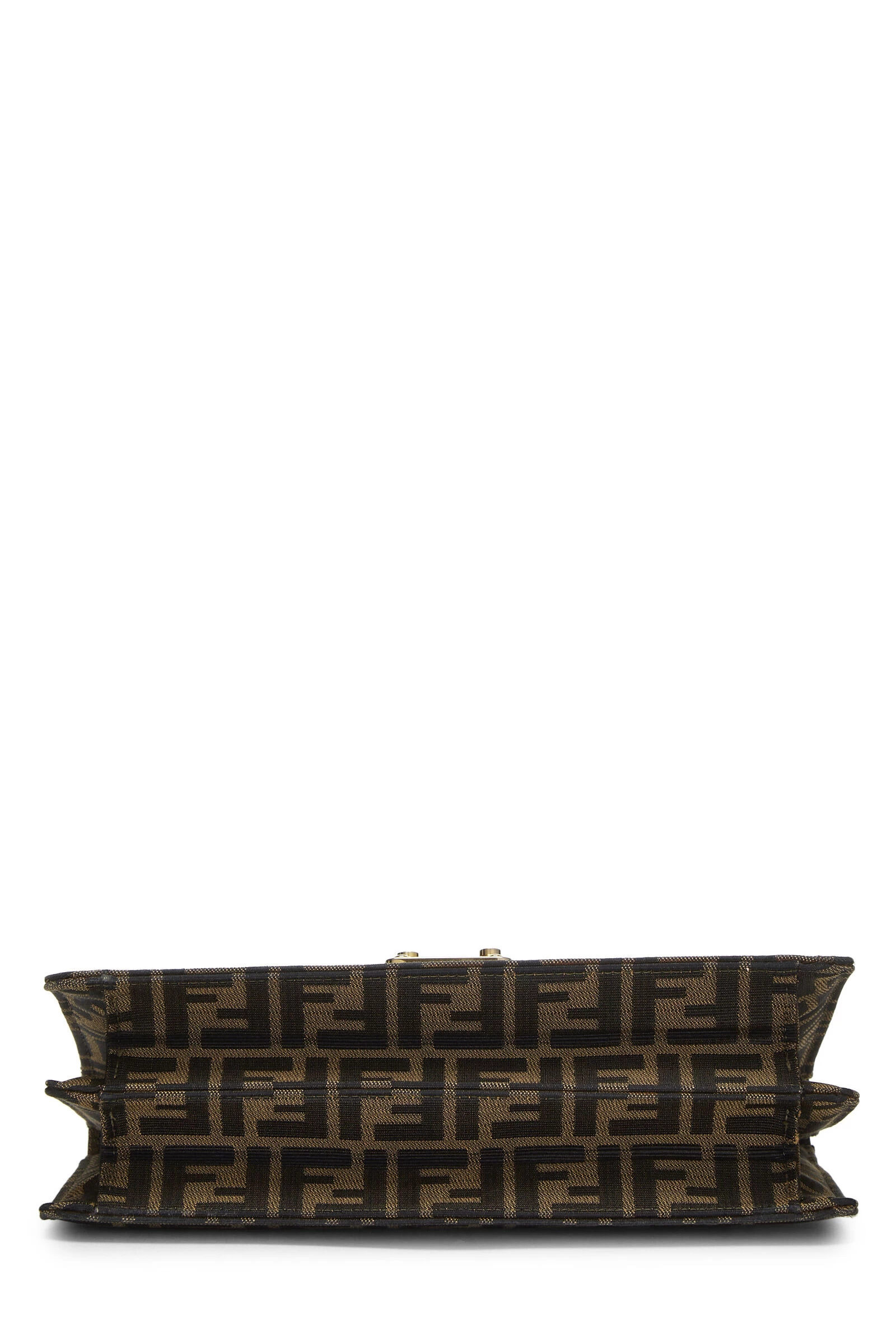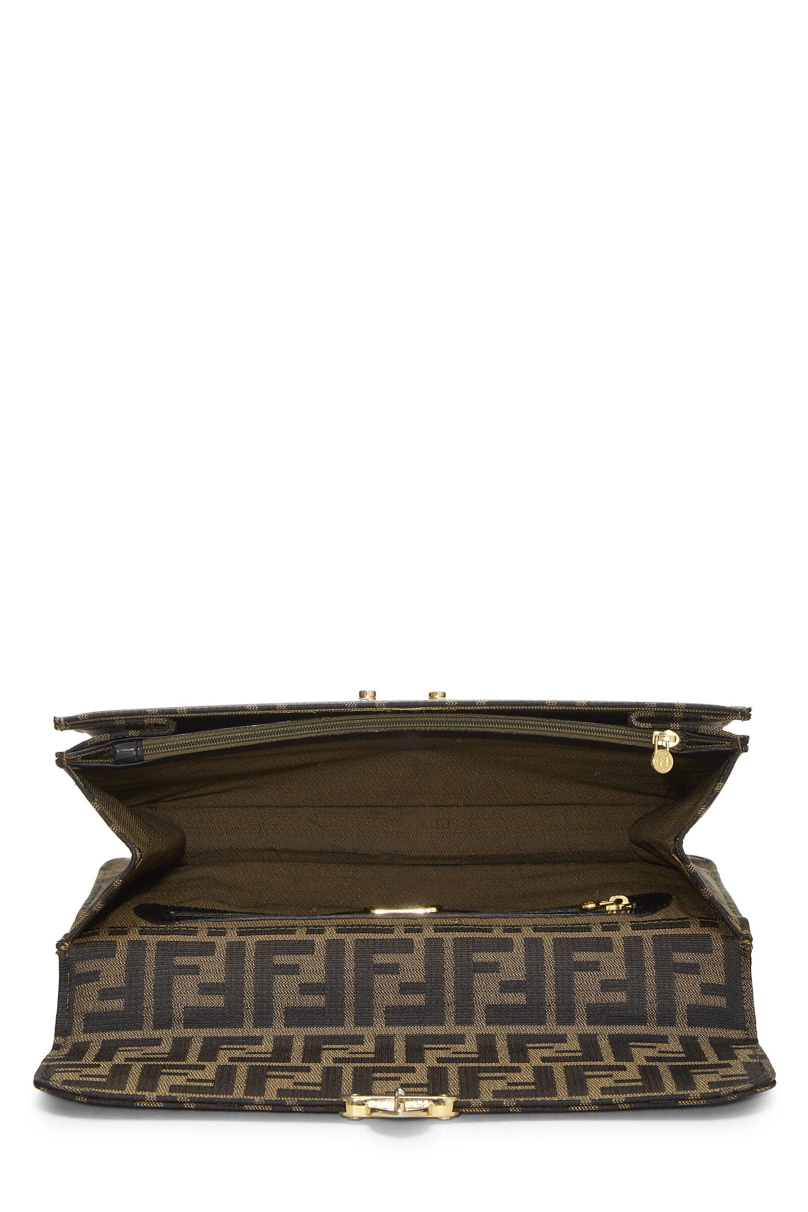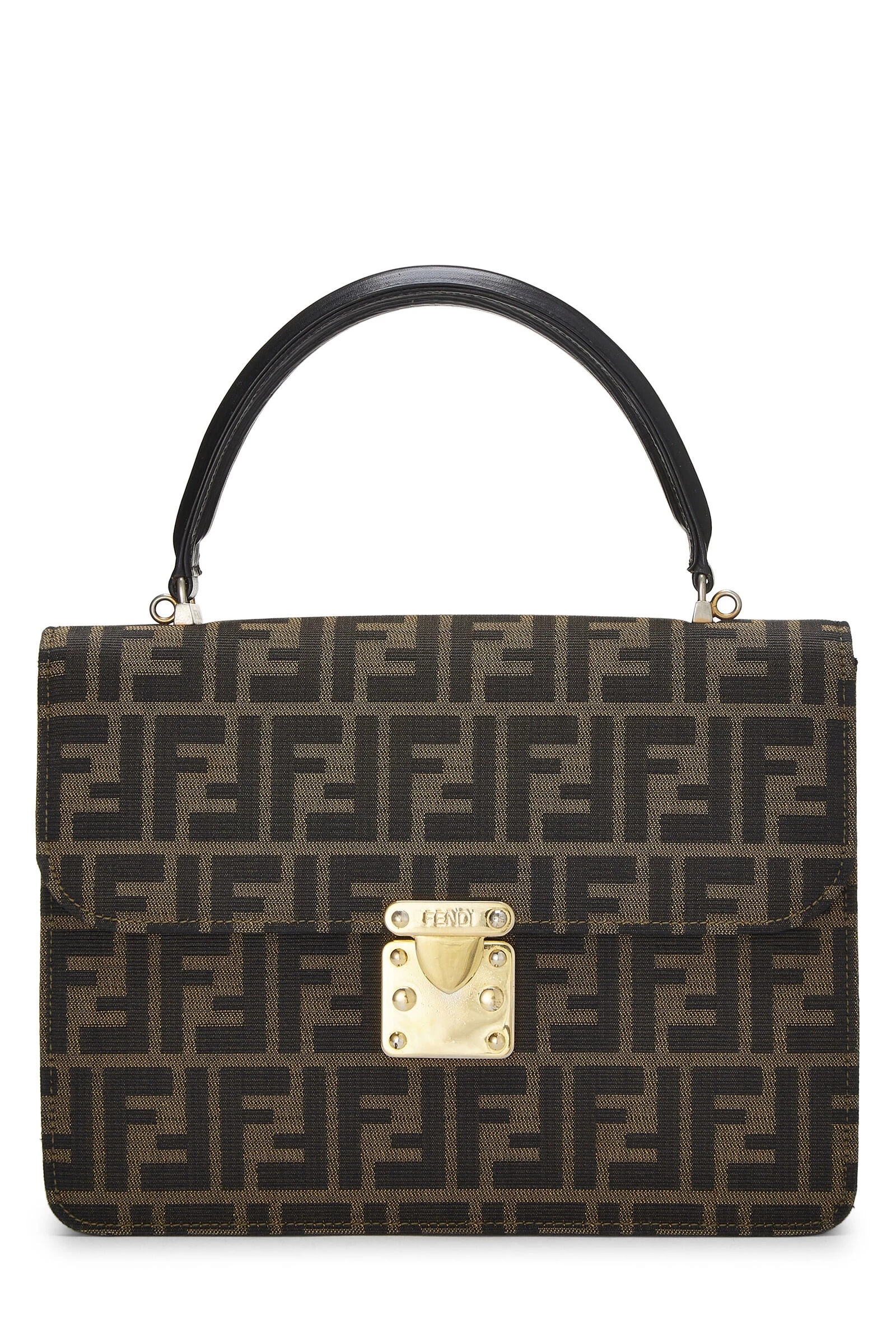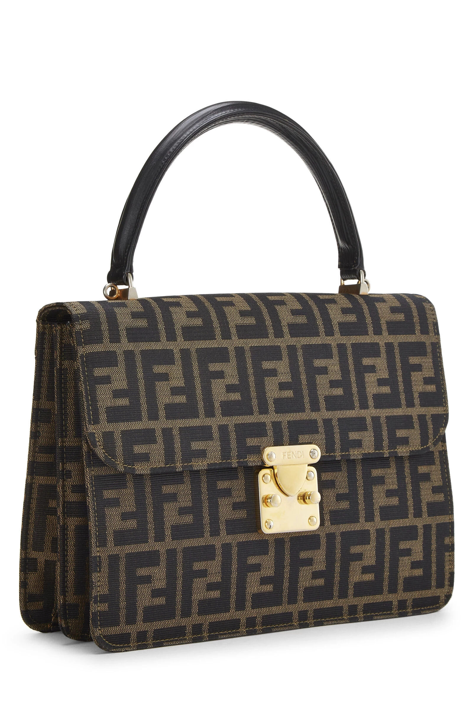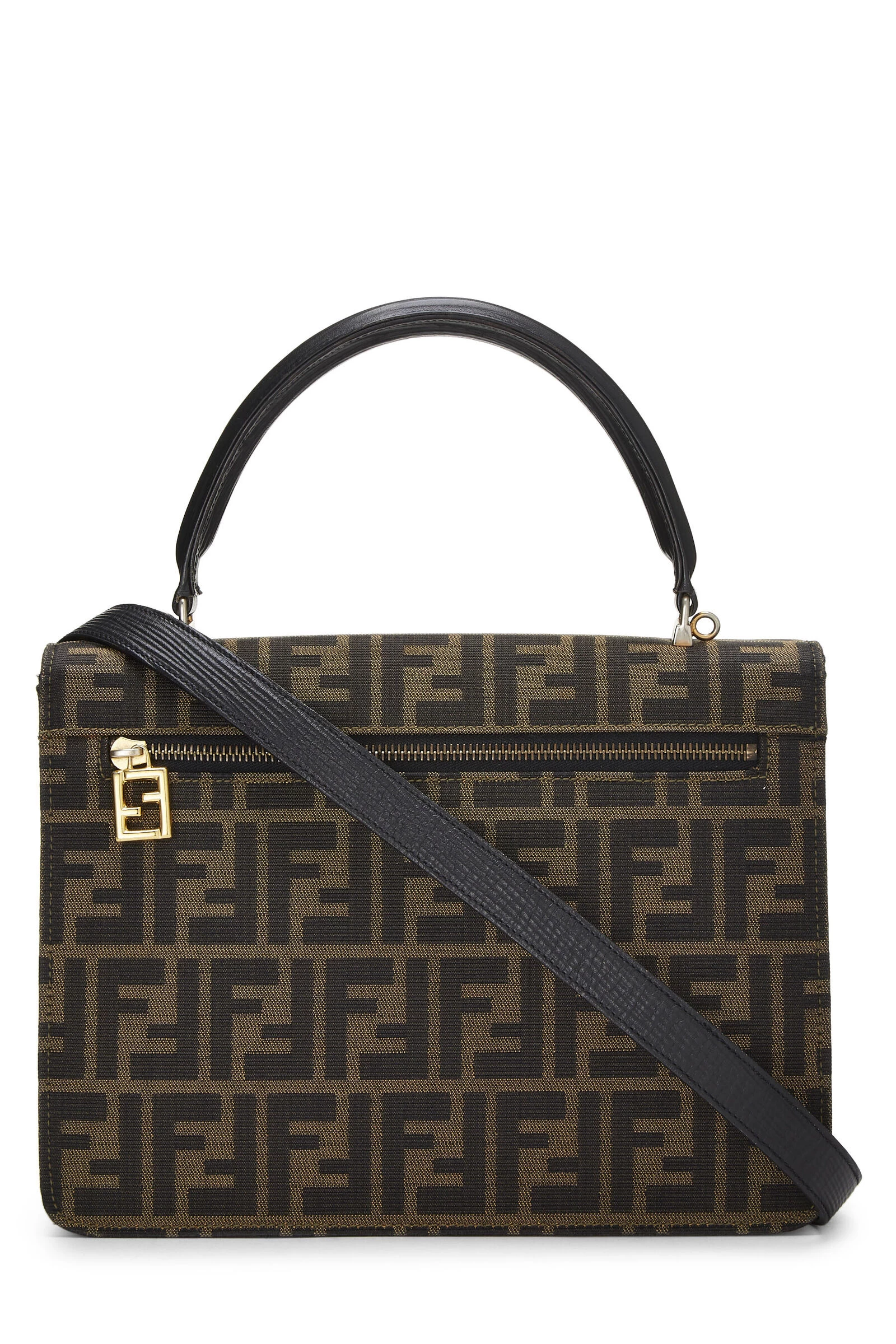 Chic and structured Fendi handle bag rendered in the house’s signature Zucca logo canvas, featuring striated leather details and finished with gold-tone logo-engraved metal hardware. Includes optional shoulder strap for versatile carrying options.