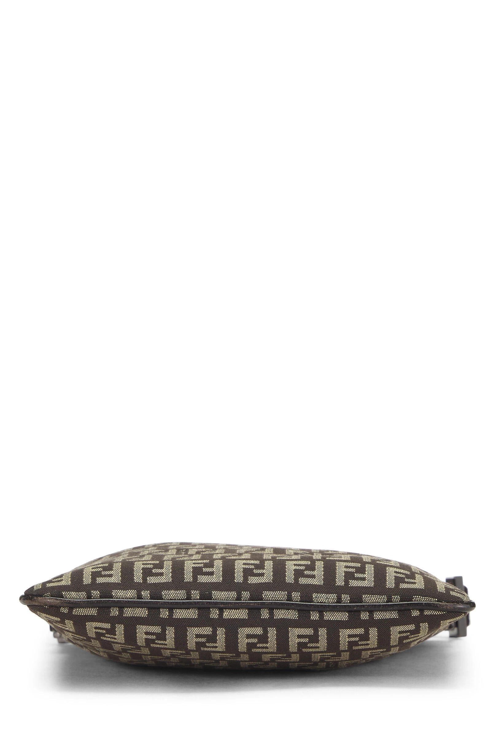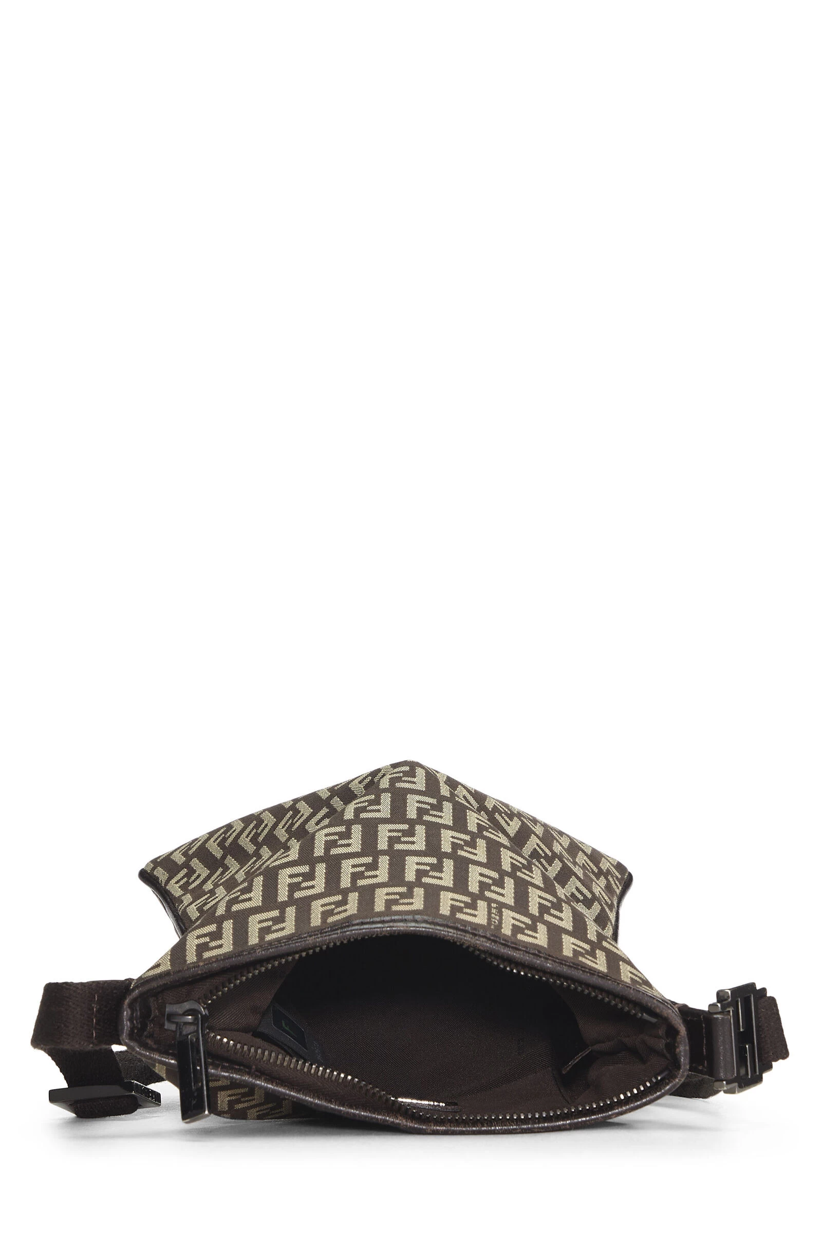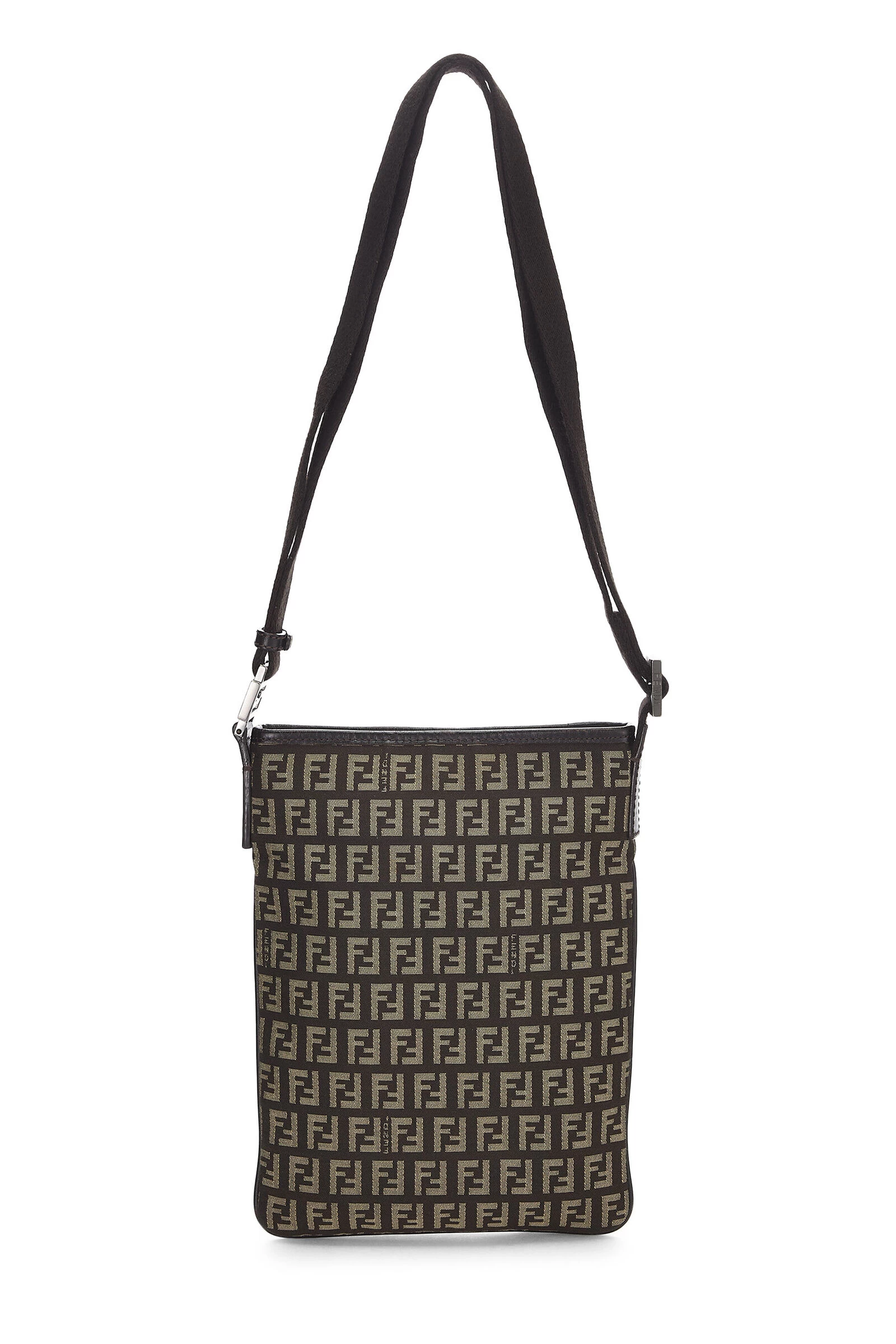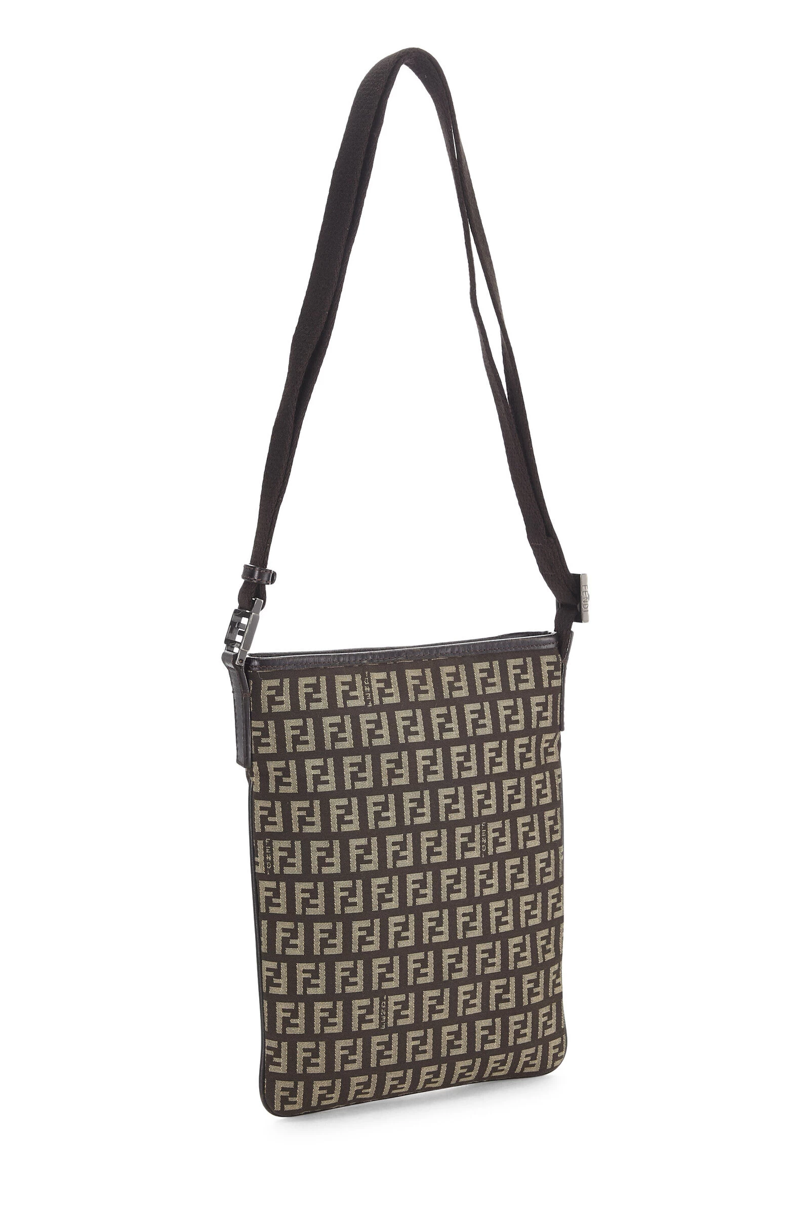The same Fendi logomania-splashed accessory you already know and love, reimagined in the house’s Zucchino canvas with brown leather trim at its borders, gunmetal hardware and adjustable canvas crossbody strap.