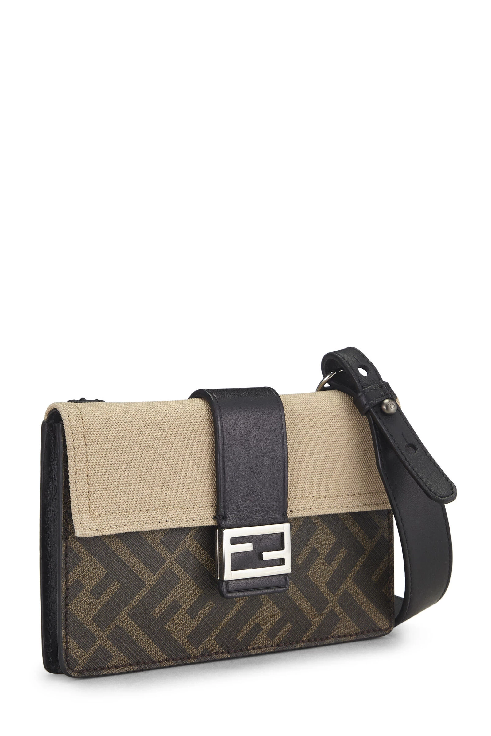 Fendi’s signature Baguette gets a chic (and functional!) upgrade with the inclusion of a detachable leather strap for versatile carrying options. The exterior is rendered in brown Zucca coated canvas, featuring light brown canvas flap and silver-tone ‘FF’ logo hardware on the front leather tab. Wear it around your waist, body, shoulder or carry as a clutch – the possibilities are endless!