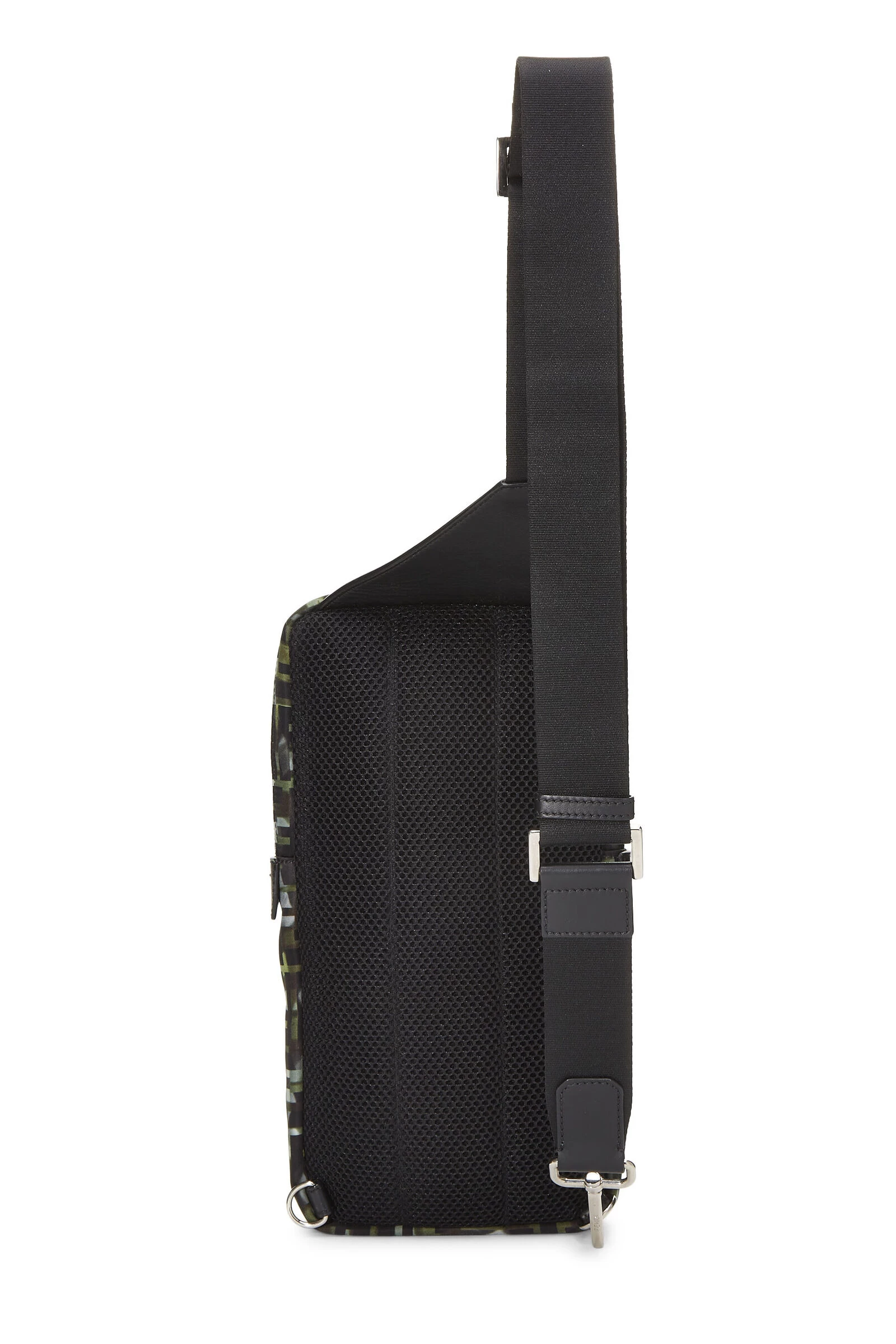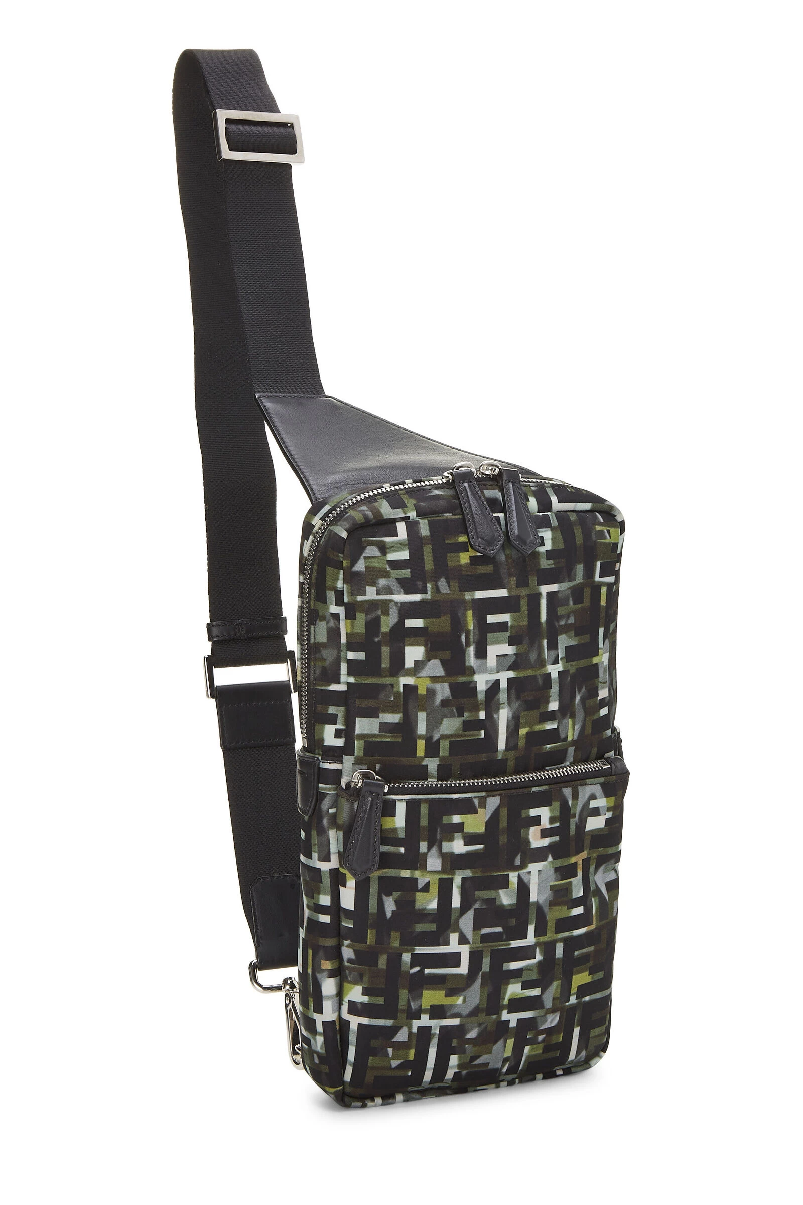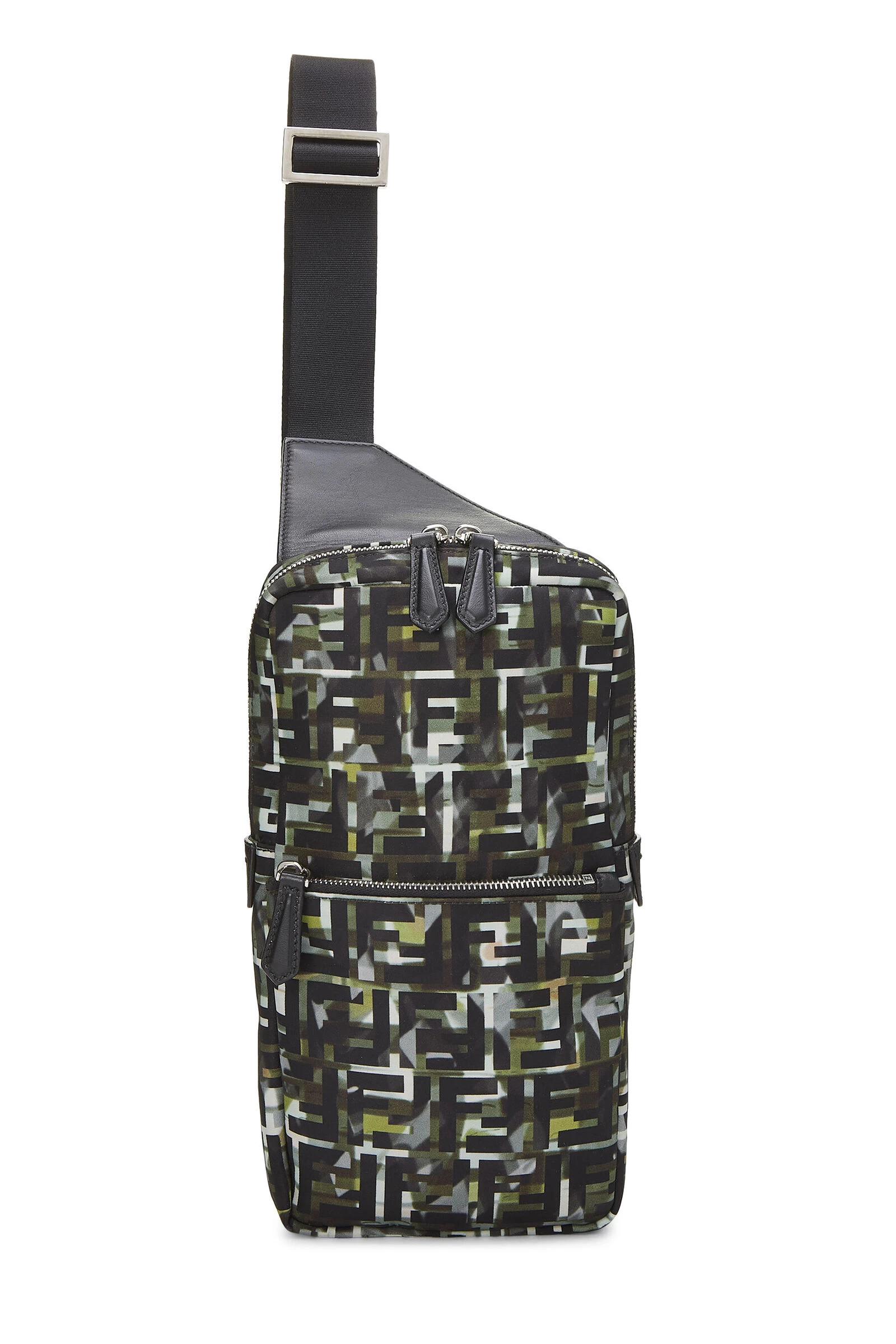 Classic Fendi sling bag crafted in multicolor nylon, featuring black leather details, a canvas shoulder strap, an exterior zip pouch pocket and finished with silver-tone hardware.