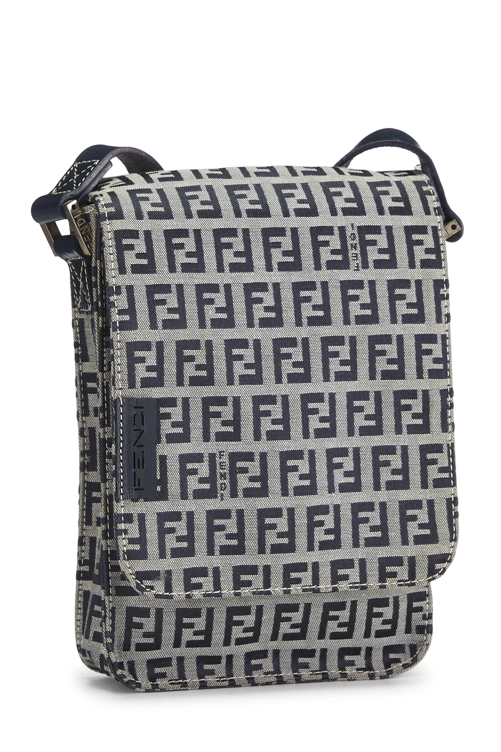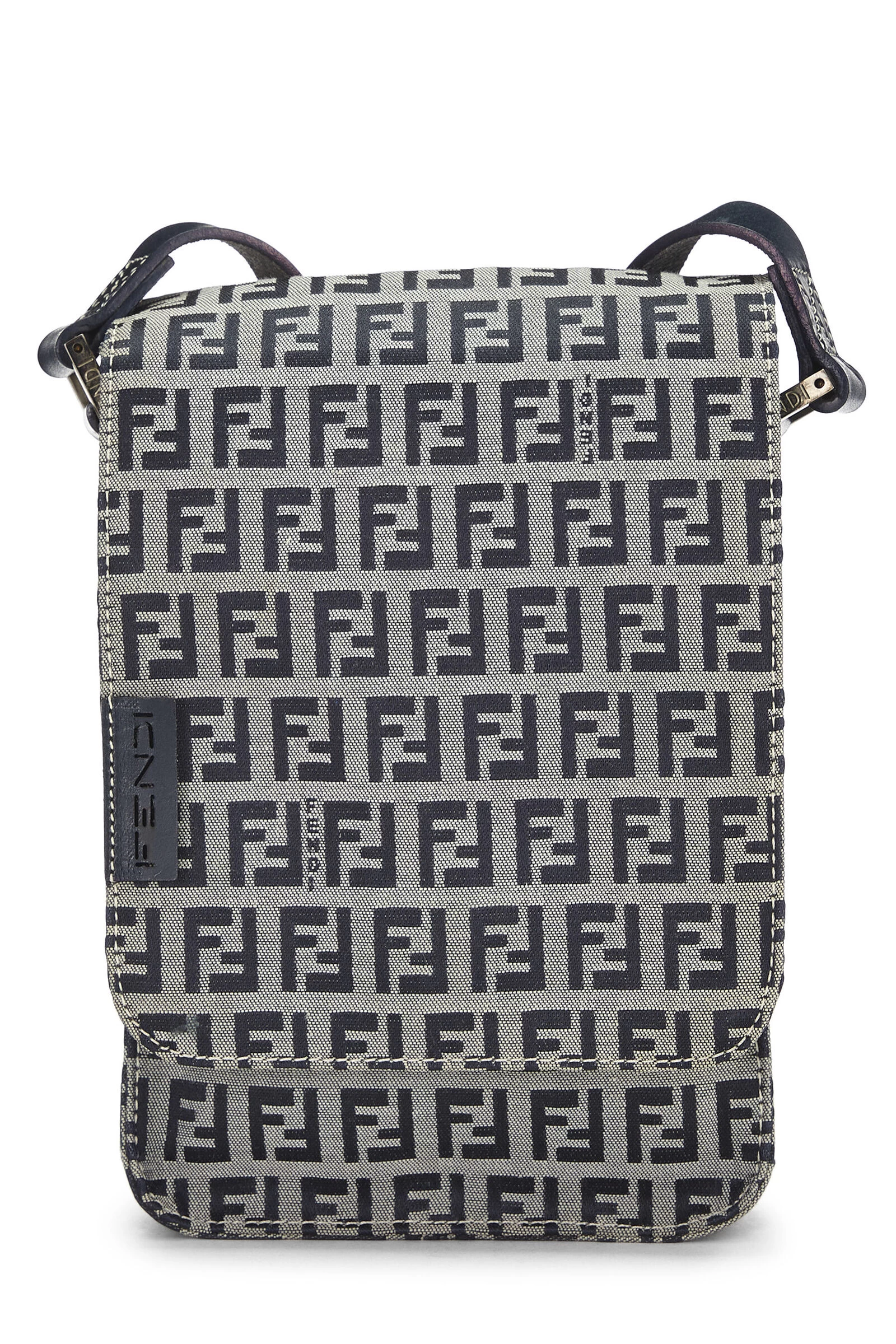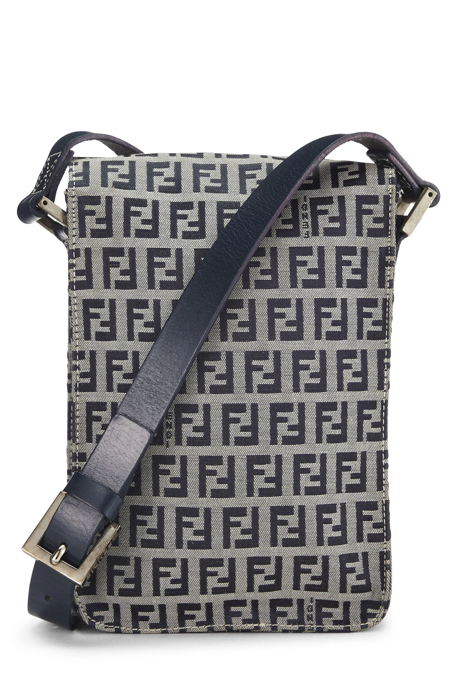 Classic mini Fendi Messenger bag crafted in iconic Zucca canvas with navy leather trimmings and finished in silver-tone hardware.
