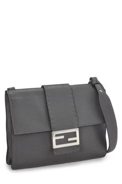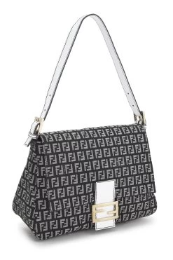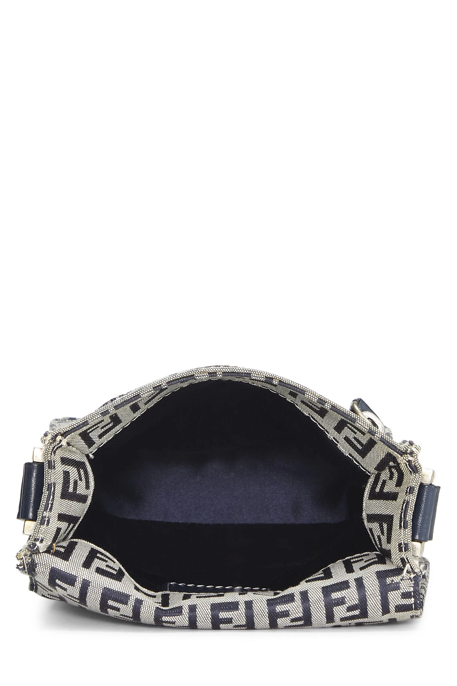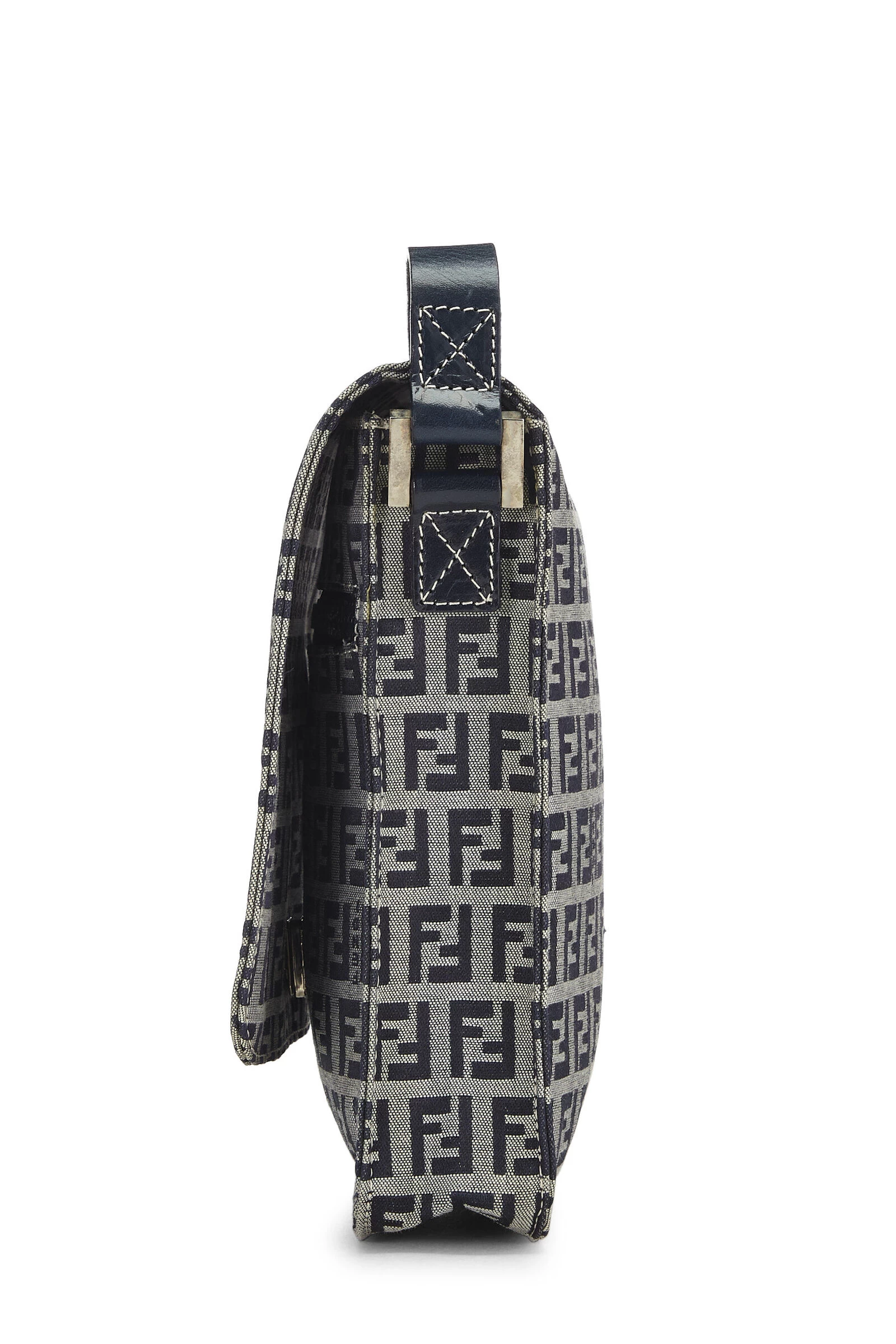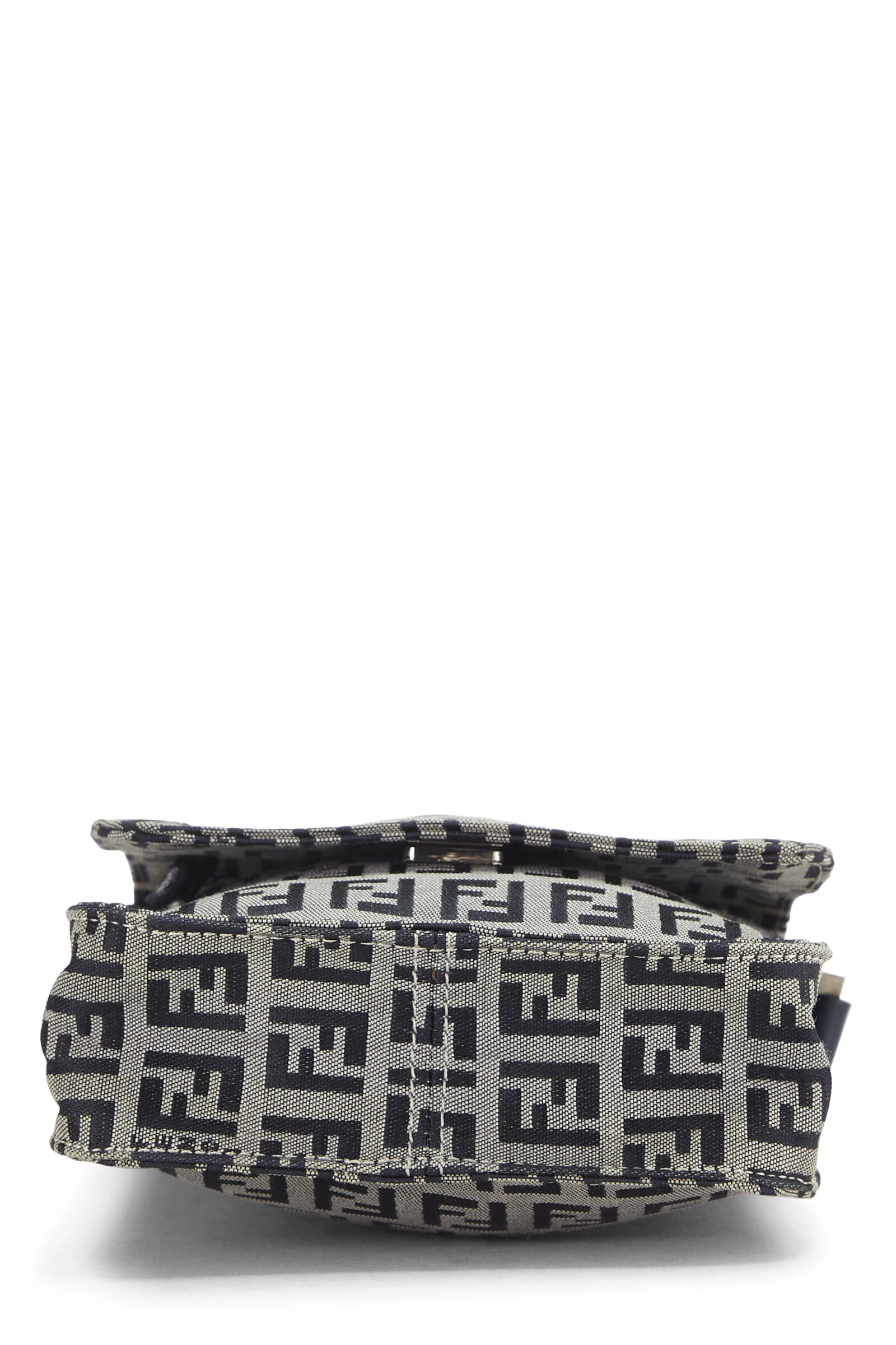 Classic mini Fendi Messenger bag crafted in iconic Zucca canvas with navy leather trimmings and finished in silver-tone hardware.